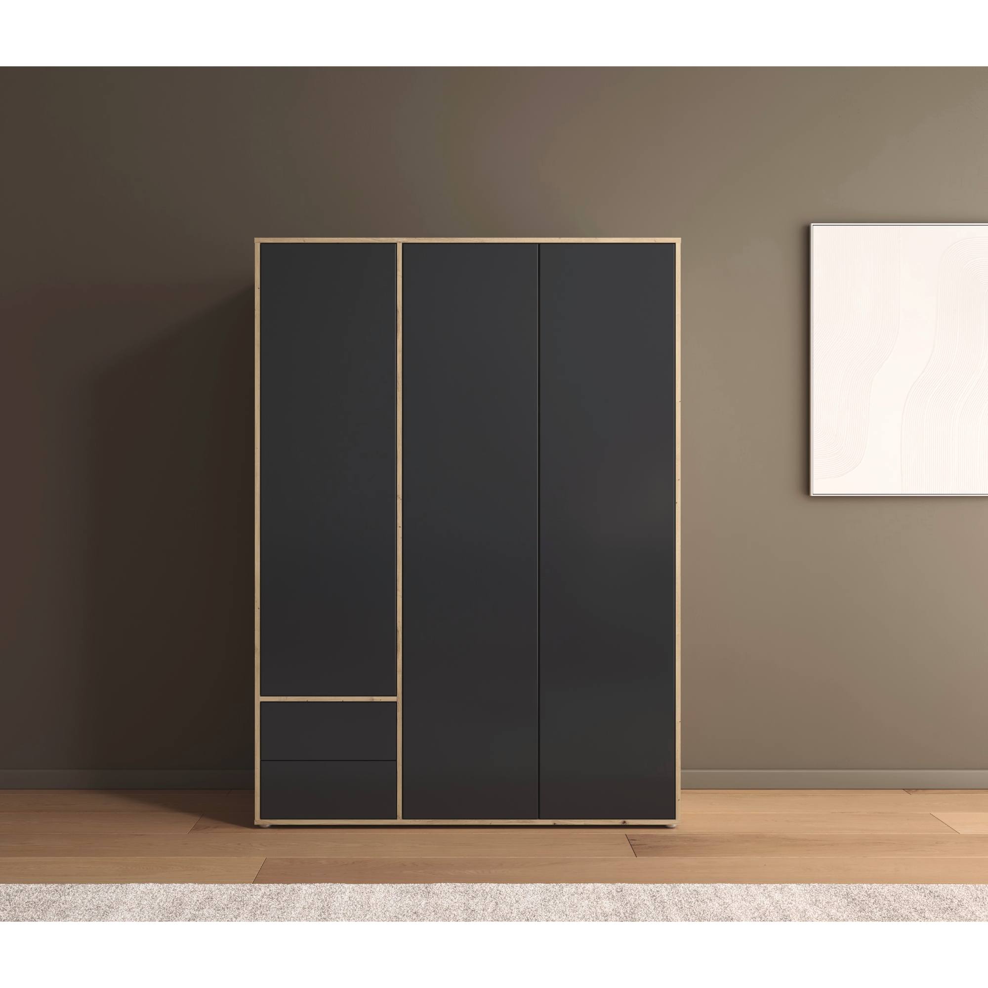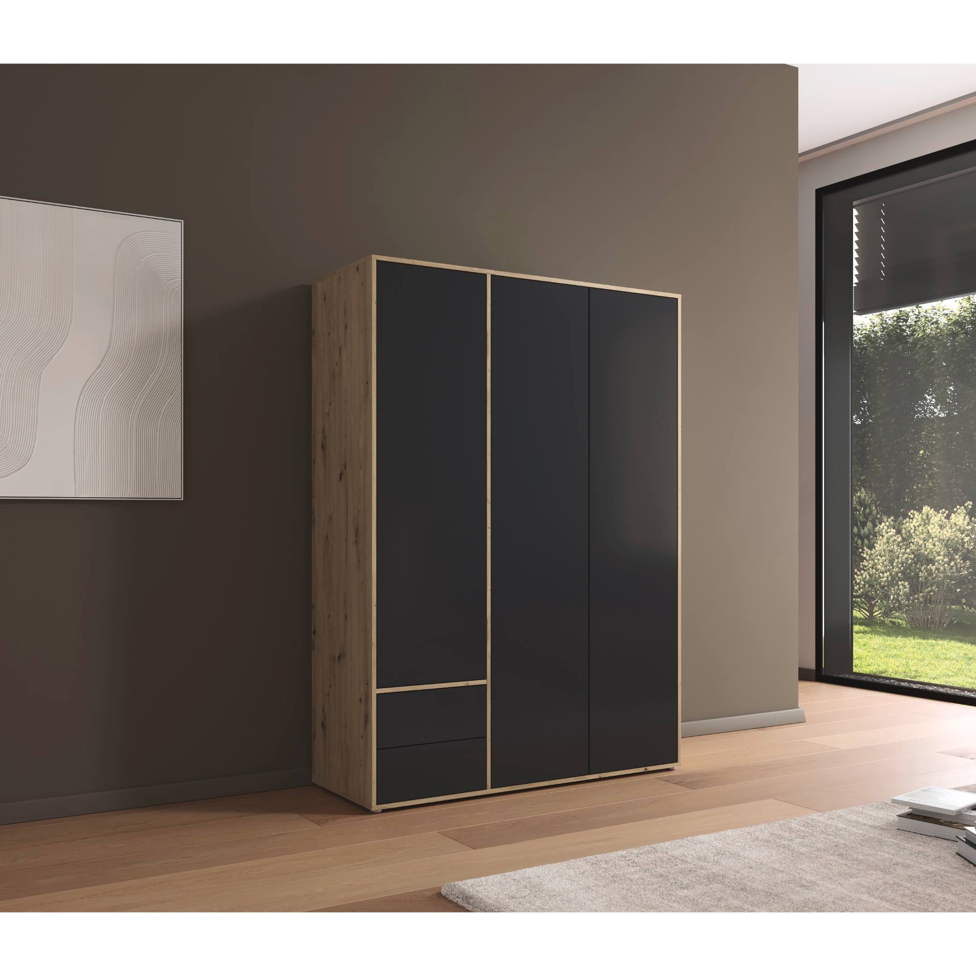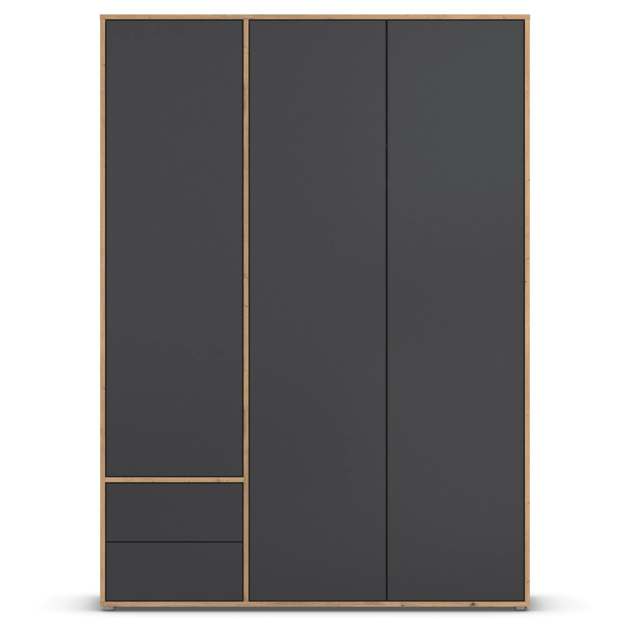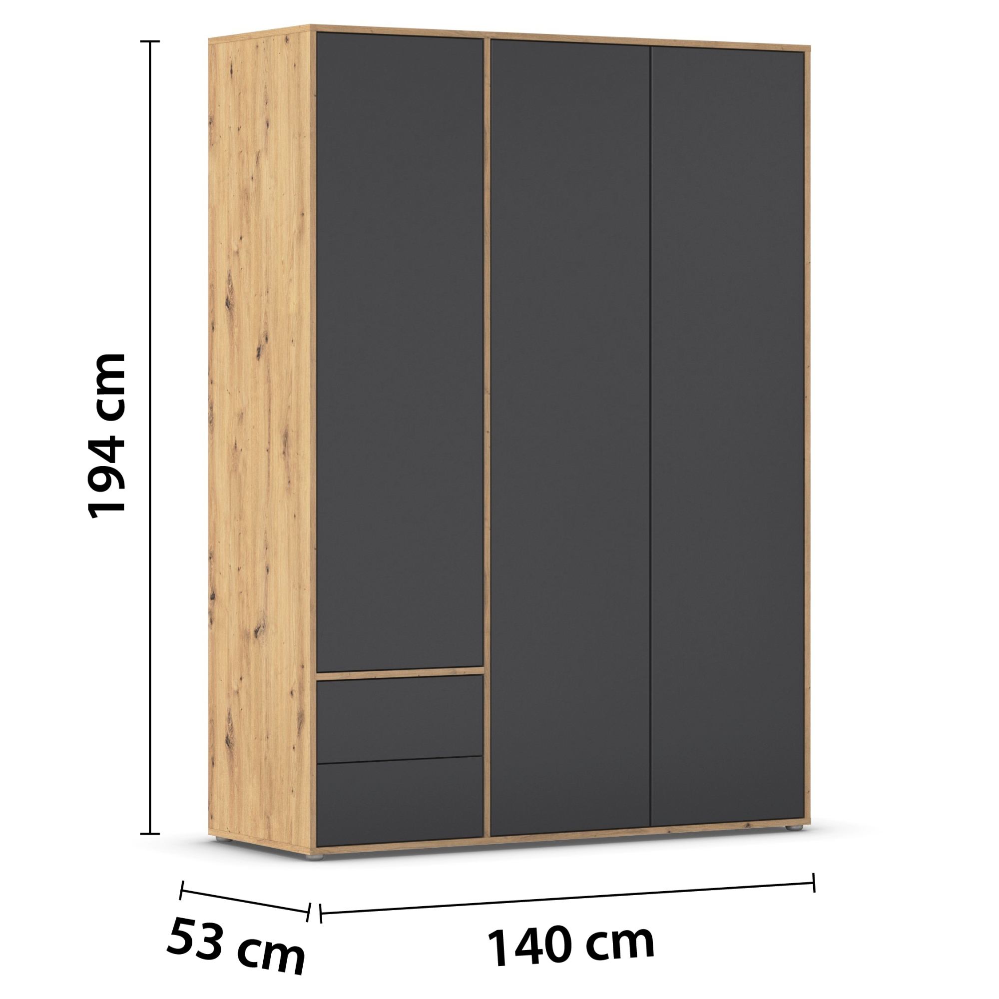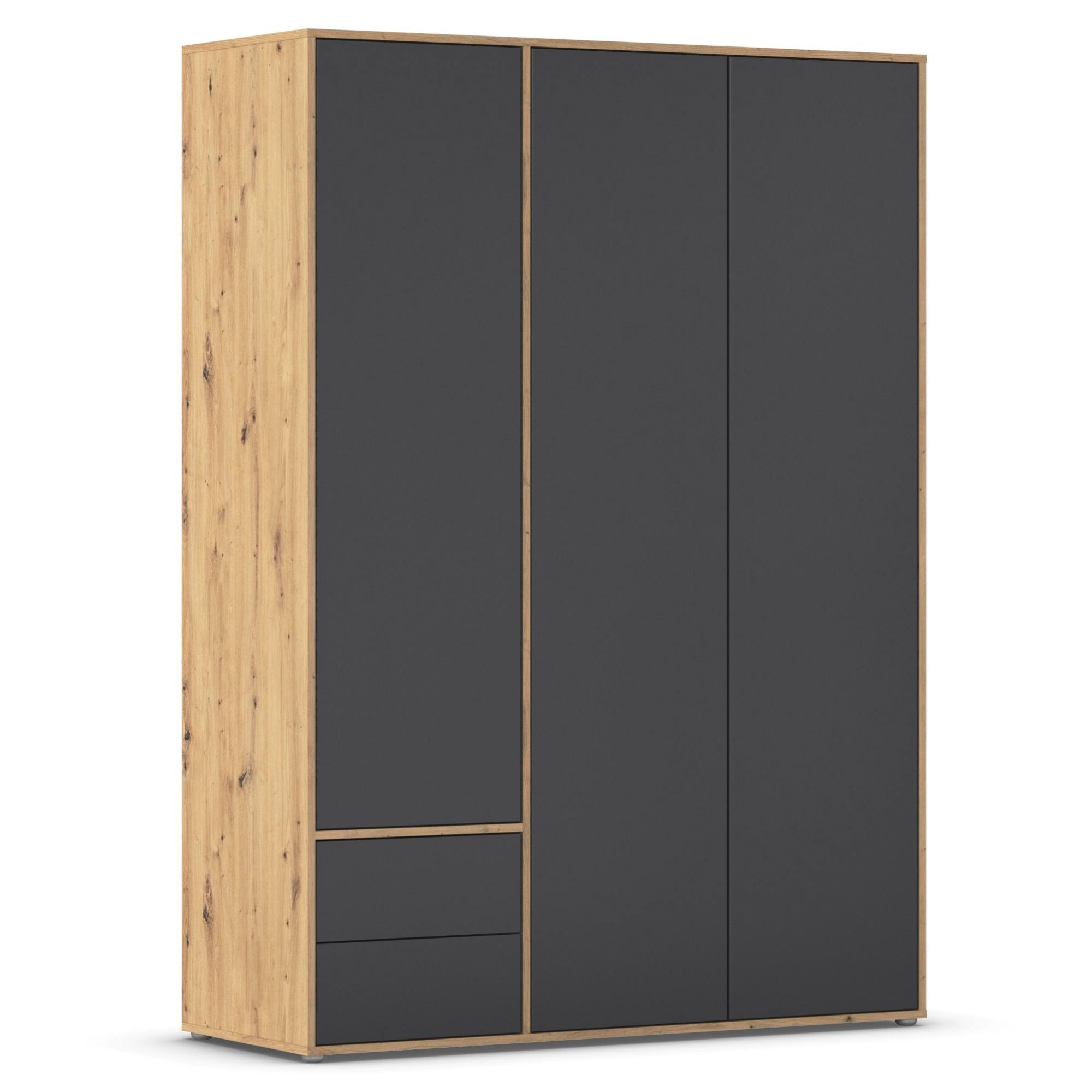 Skriňa je vybavená 3 otočnými dverami ktorých ľahké otváranie umožňuje systém push to open. Pár dverí na pravej strane za sebou ukrýva prepojený priestor s výškovo nastaviteľnou šatníkovou tyčou na zavesenie krčivých a objemnejších kúskov a vloženou policou. Za samostatnými dverami nájdete 2 vložené police na prehľadné skladovanie poskladaného oblečenia a ďalšieho textilu, ktoré je možné voľne usporiadať. Na oddelenie drobného oblečenia a doplnkov môžete využiť ešte 2 zásuvky v spodnej časti. Konštrukcia skrine je vyrobená z drevotriesky s povrchom nenáročným na údržbu.
