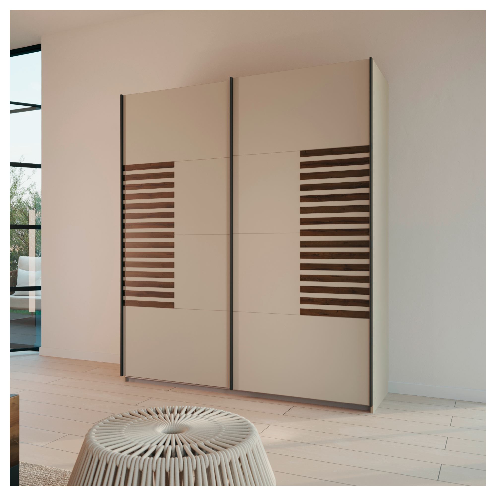 Skriňa je uzatvárateľná pomocou páru posuvných dverí, ktoré dokonale šetria miesto vo vnútri aj mimo skrine. Minimalistické jednofarebné vyhotovenie ozvláštňujú kontrastné, dekoratívne detaily predných plôch. Skriňa je vybavená vloženými policami a šatníkovými tyčami, ktoré si môžete nastaviť a jednoducho tak prispôsobiť obsah skrine svojim potrebám. Skriňa je vyrobená z laminovanej drevotriesky nenáročnej na údržbu.
