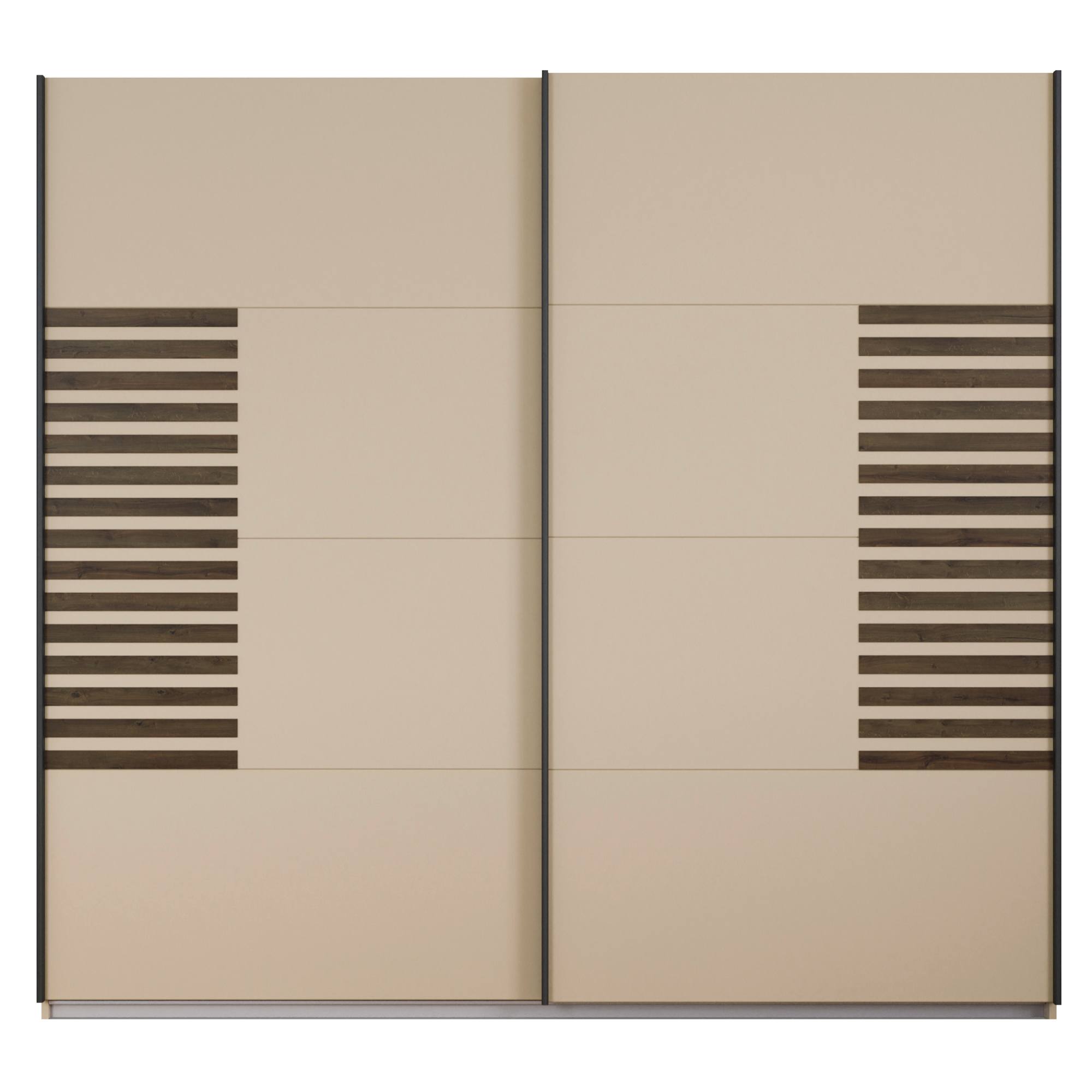 Skriňa je uzatvárateľná pomocou páru posuvných dverí, ktoré dokonale šetria miesto vo vnútri aj mimo skrine. Minimalistické jednofarebné vyhotovenie ozvláštňujú kontrastné, dekoratívne detaily predných plôch. Skriňa je vybavená vloženými policami a šatníkovými tyčami, ktoré si môžete nastaviť a jednoducho tak prispôsobiť obsah skrine svojim potrebám. Skriňa je vyrobená z laminovanej drevotriesky nenáročnej na údržbu.