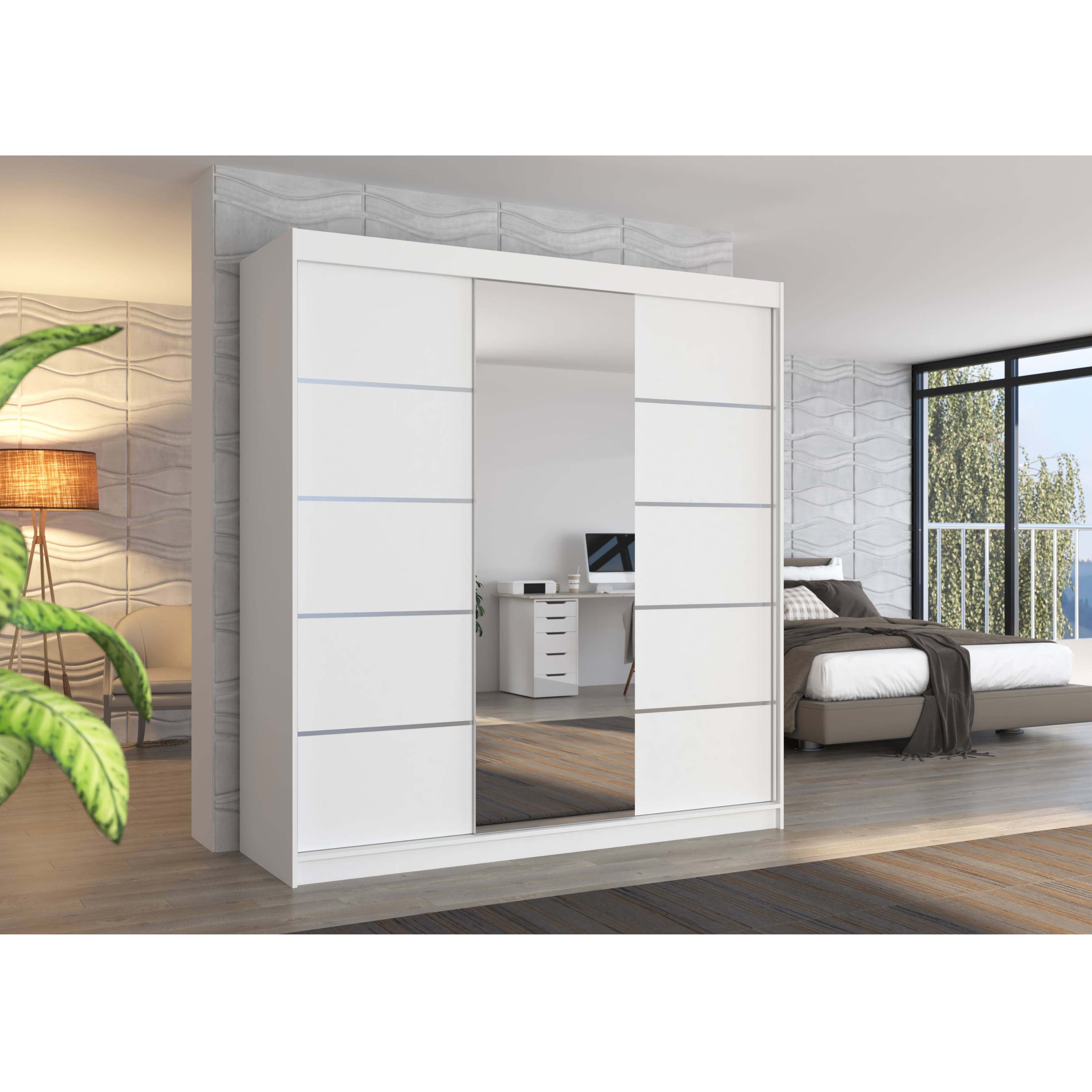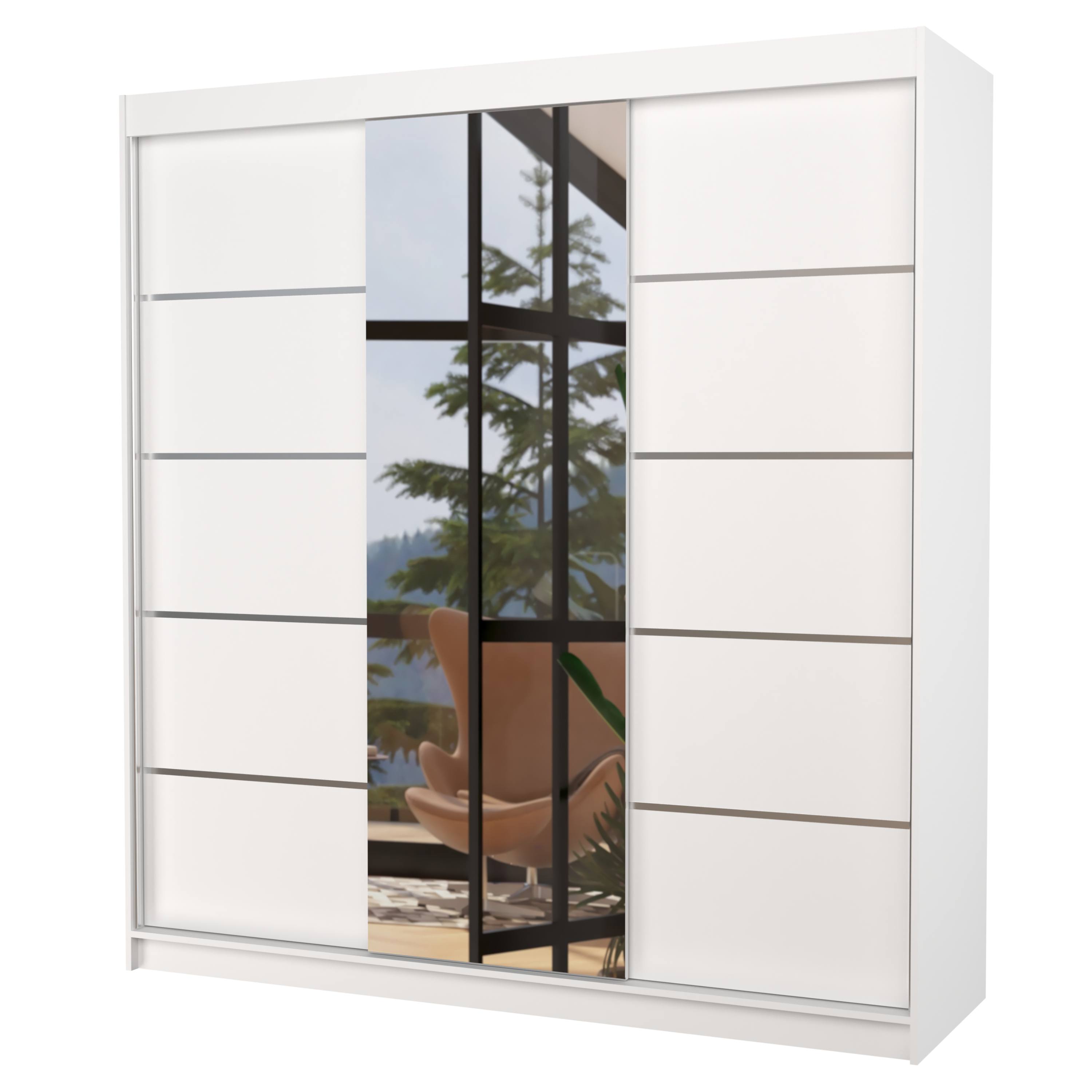 Skriňu uzatvárajú posuvné dvere, ktoré šetria cenný priestor vo vnútri aj mimo skriňu. Prostredné dvere sú navyše doplnené o zrkadlo na optické zväčšenie a presvetlenie interiéru. Zároveň si v ňom môžete kedykoľvek skontrolovať svoj vzhľad. Za dverami sa nachádza celkom 9 políc, ktoré umožňujú prehľadné uskladnenie poskladaného oblečenia, posteľnej bielizne a doplnkov. Skriňa ďalej obsahuje 1 šatníkovú tyč, ktorá je ideálna na zavesenie krčivého oblečenia, búnd alebo kabátov. Skriňa je vyrobená z laminovaného dreveného materiálu s povrchom nenáročným na údržbu.