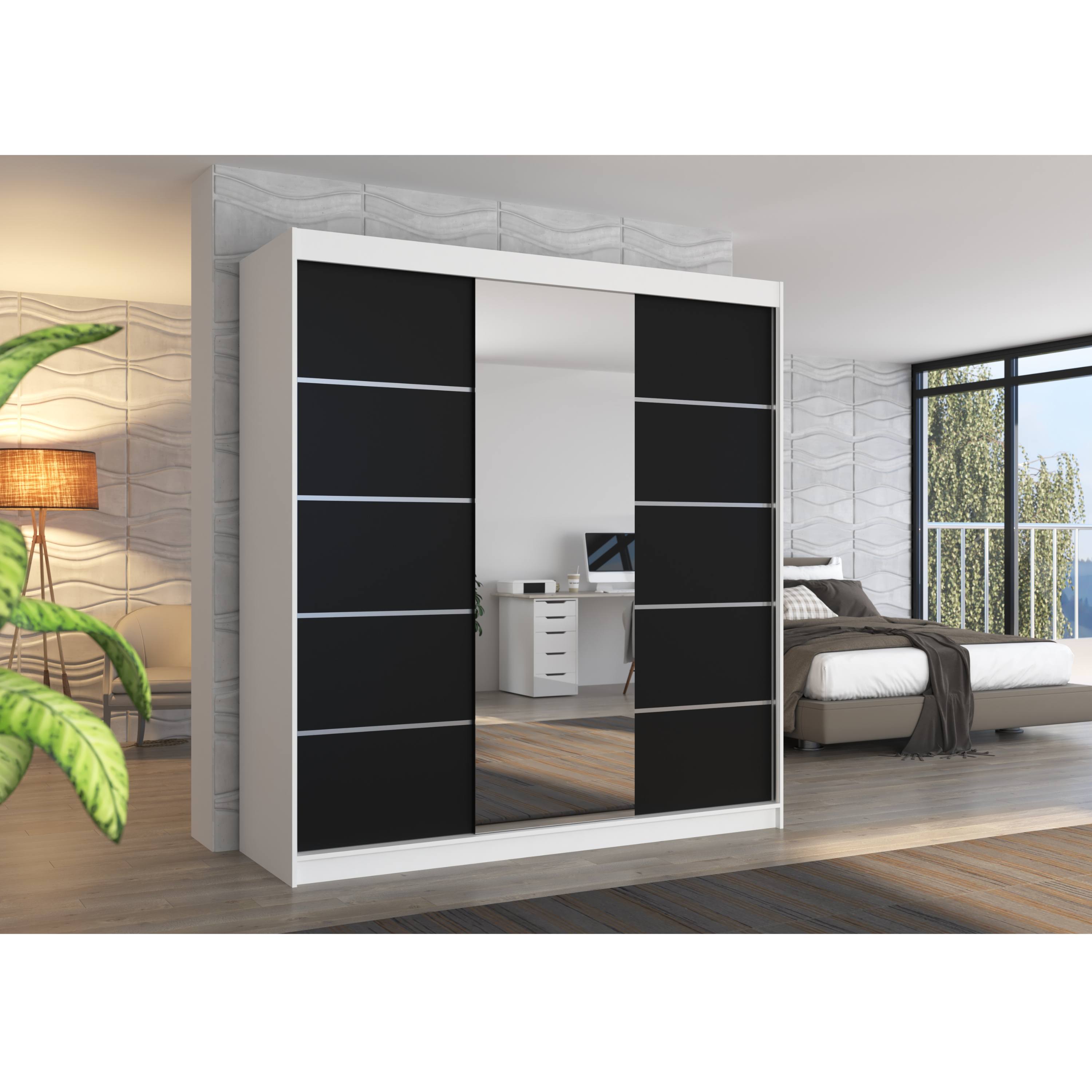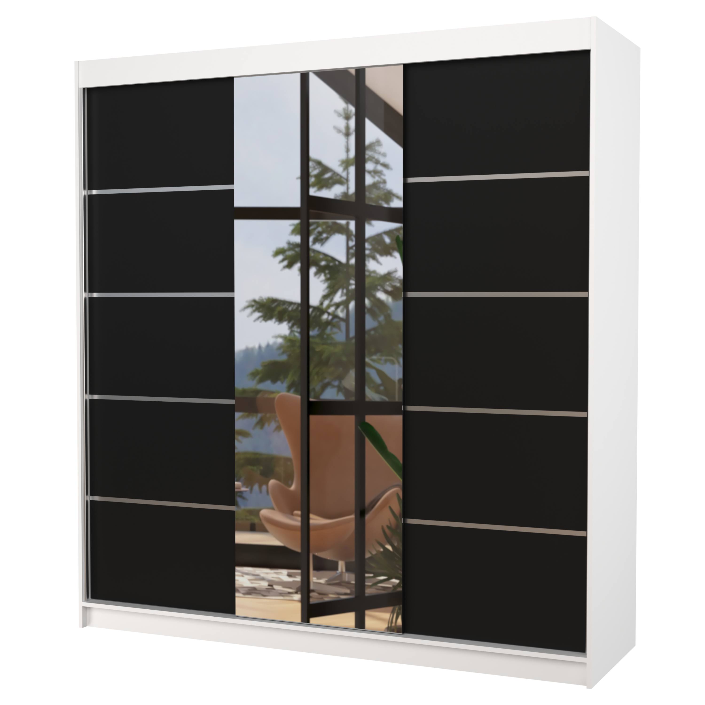 Skriňu uzatvárajú posuvné dvere, ktoré šetria cenný priestor vo vnútri aj mimo skriňu. Prostredné dvere sú navyše doplnené o zrkadlo na optické zväčšenie a presvetlenie interiéru. Zároveň si v ňom môžete kedykoľvek skontrolovať svoj vzhľad. Za dverami sa nachádza celkom 9 políc, ktoré umožňujú prehľadné uskladnenie poskladaného oblečenia, posteľnej bielizne a doplnkov. Skriňa ďalej obsahuje 1 šatníkovú tyč, ktorá je ideálna na zavesenie krčivého oblečenia, búnd alebo kabátov. Skriňa je vyrobená z laminovaného dreveného materiálu s povrchom nenáročným na údržbu.