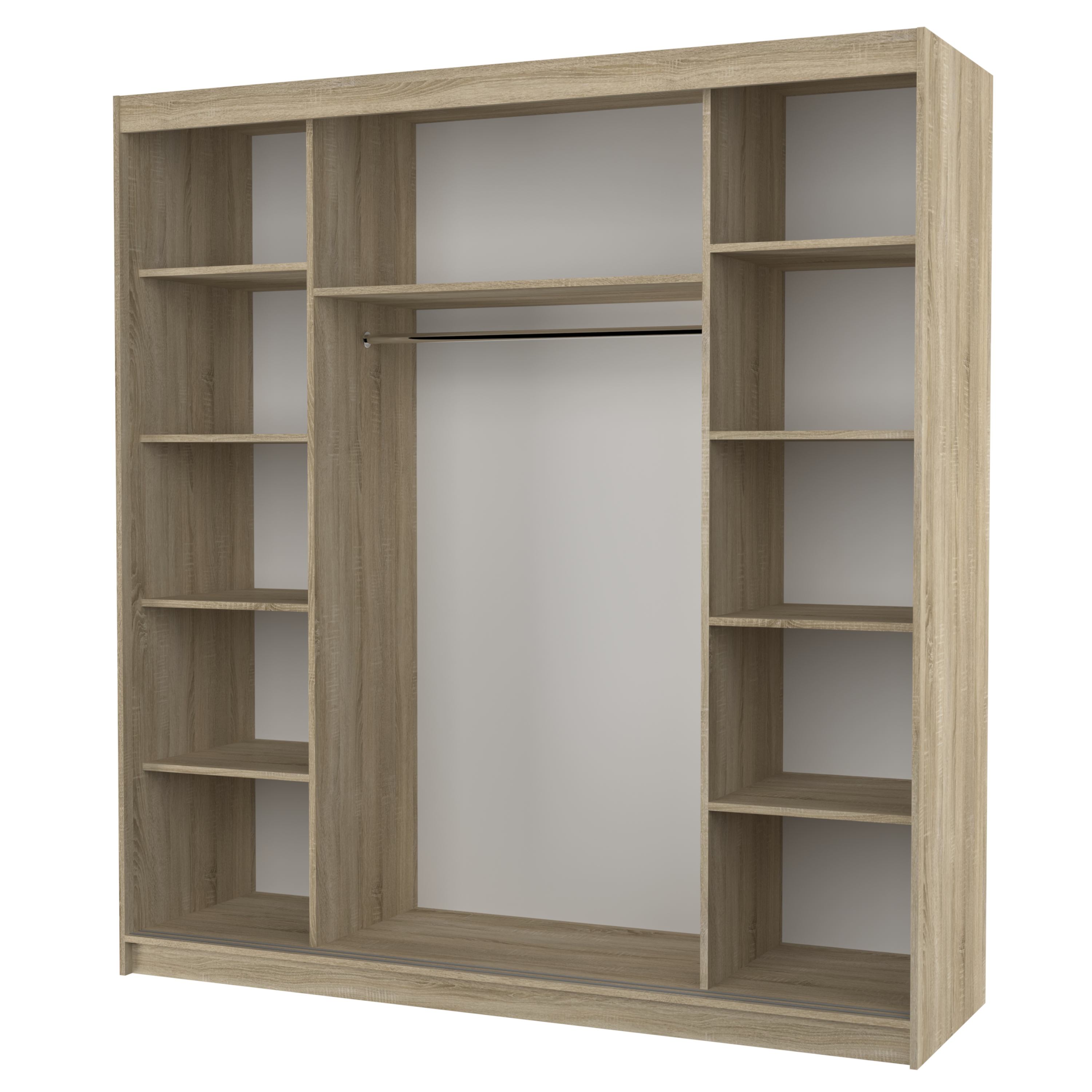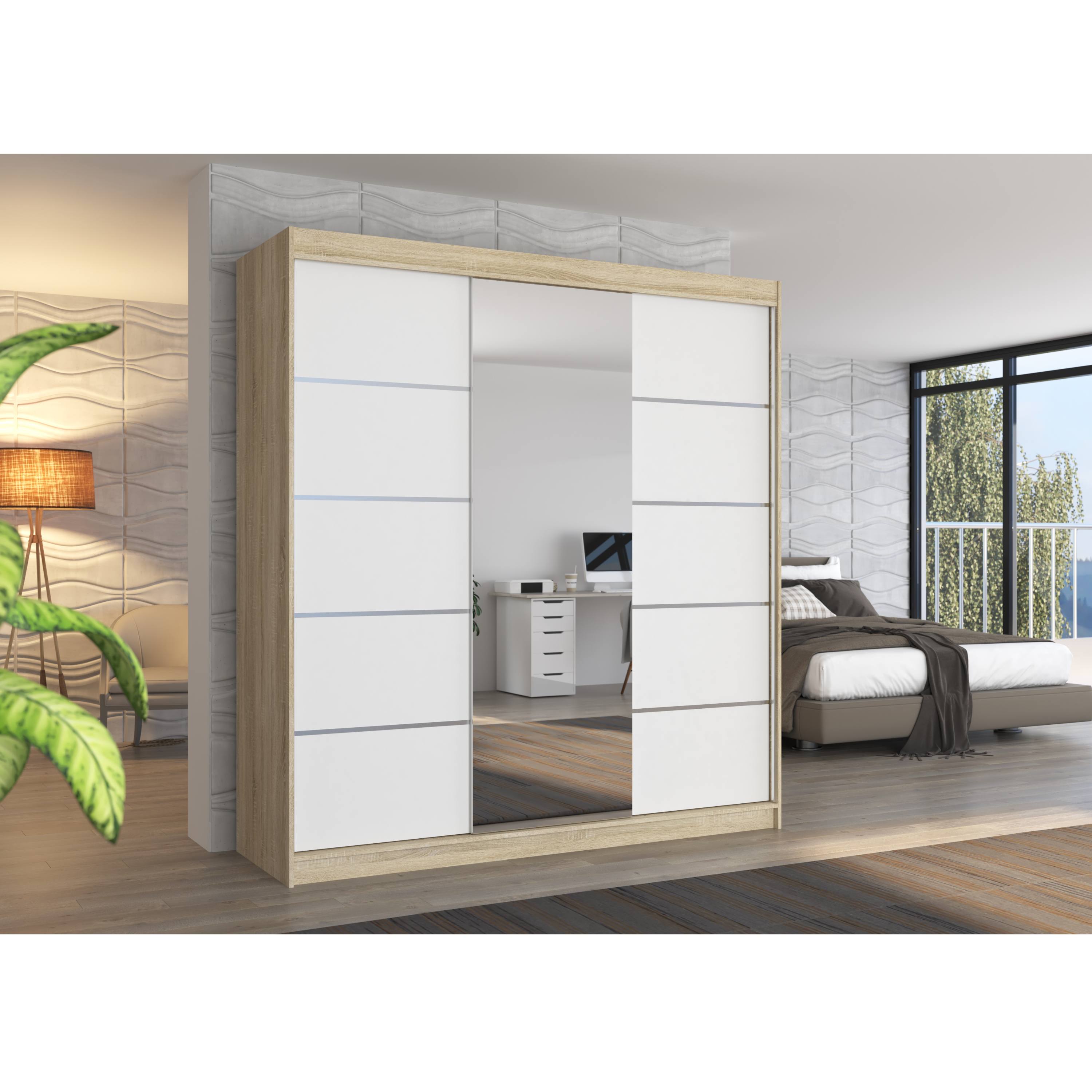 Skriňu uzatvárajú posuvné dvere, ktoré šetria cenný priestor vo vnútri aj mimo skriňu. Prostredné dvere sú navyše doplnené o zrkadlo na optické zväčšenie a presvetlenie interiéru. Zároveň si v ňom môžete kedykoľvek skontrolovať svoj vzhľad. Za dverami sa nachádza celkom 9 políc, ktoré umožňujú prehľadné uskladnenie poskladaného oblečenia, posteľnej bielizne a doplnkov. Skriňa ďalej obsahuje 1 šatníkovú tyč, ktorá je ideálna na zavesenie krčivého oblečenia, búnd alebo kabátov. Skriňa je vyrobená z laminovaného dreveného materiálu s povrchom nenáročným na údržbu.