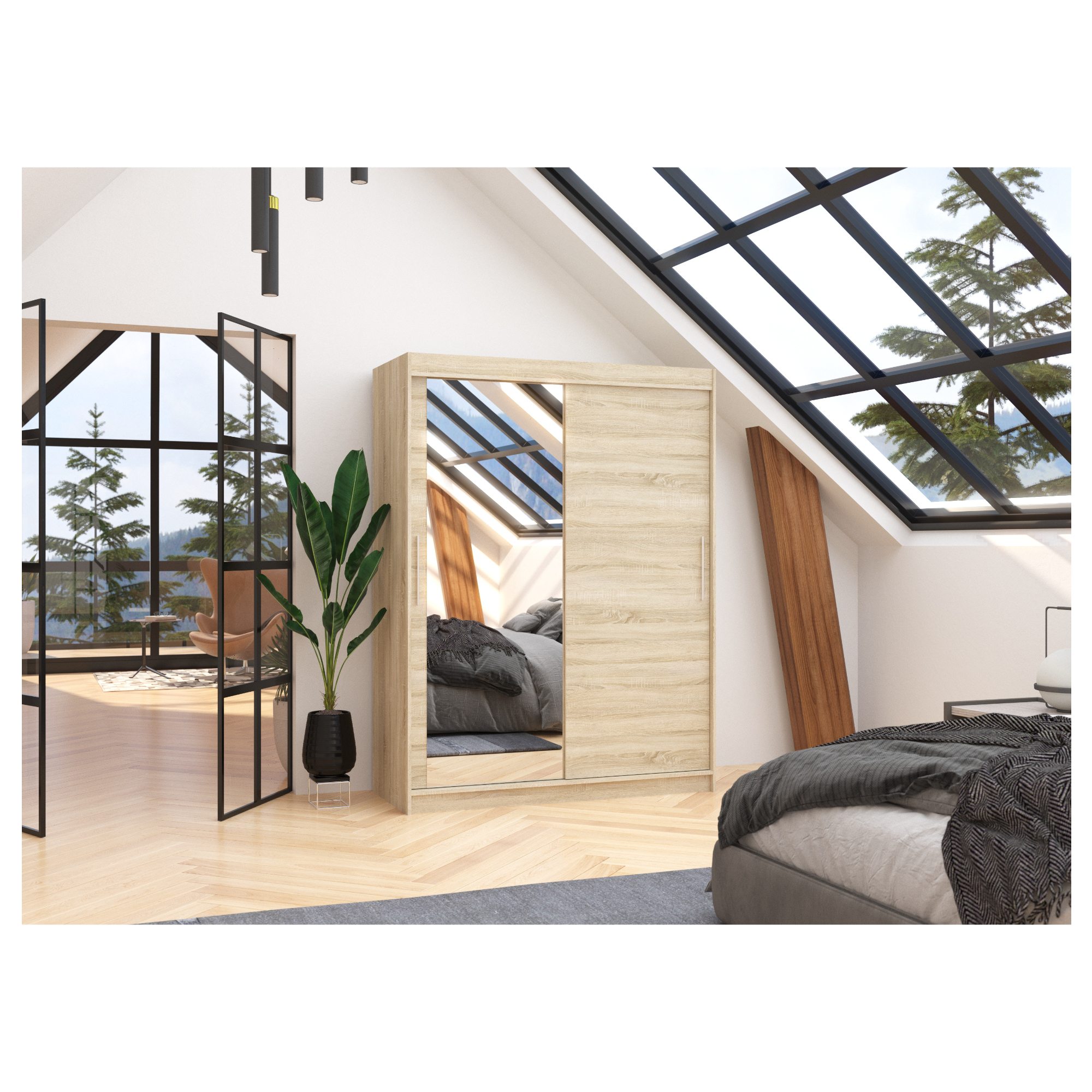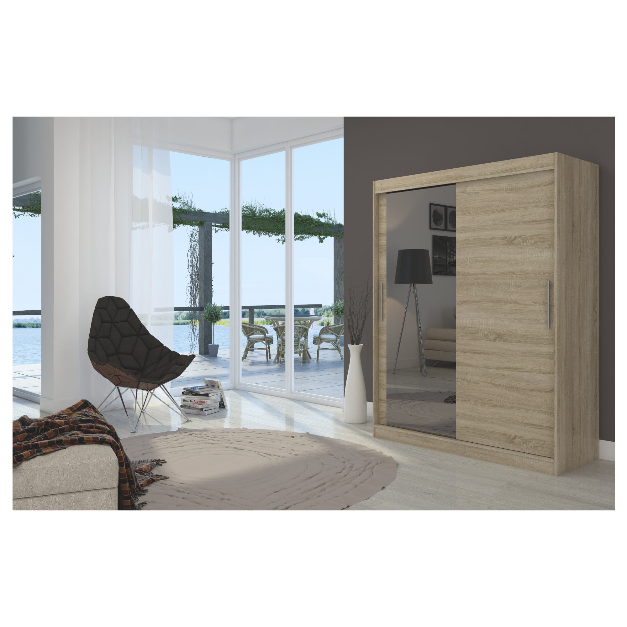 Disponuje posuvnými dverami s hliníkovými vodiacimi lištami na hladké a pohodlné otváranie. Ľavé dvere skrine sú doplnené zrkadlom, ktoré vám uľahčí prípravy počas ranného zhonu a zároveň opticky zväčší priestor. Tiež odráža viac svetla do miestnosti, čím pôsobí interiér svetlejšie.