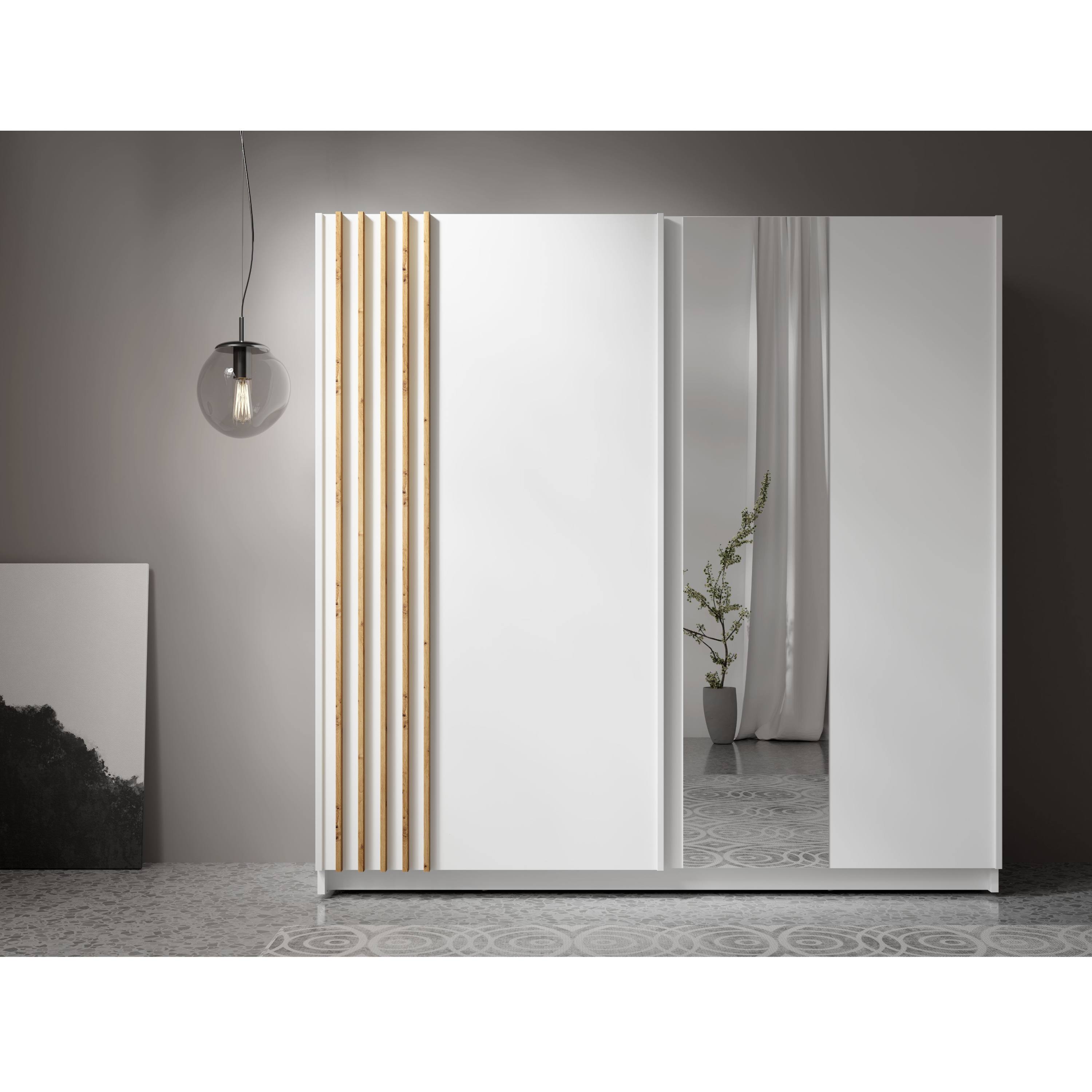Skriňu uzatvárajú posuvné dvere, ktoré šetria cenné miesto zvonku aj vo vnútri konštrukcie, a je tak vhodná aj do užších priestorov. Súčasťou jedných dverí je aj praktické zrkadlo, vďaka ktorému si môžete kedykoľvek upraviť svoj vzhľad. Vnútorný priestor je vybavený celkom 4 policami na prehľadné uloženie poskladaného oblečenia alebo sezónnych doplnkov a tiež šatníkovou tyčou, ktorá je ideálna na zavesenie objemných alebo krčivých odevov. Skriňa je vyrobená z laminovaného dreveného materiálu s povrchom nenáročným na údržbu.