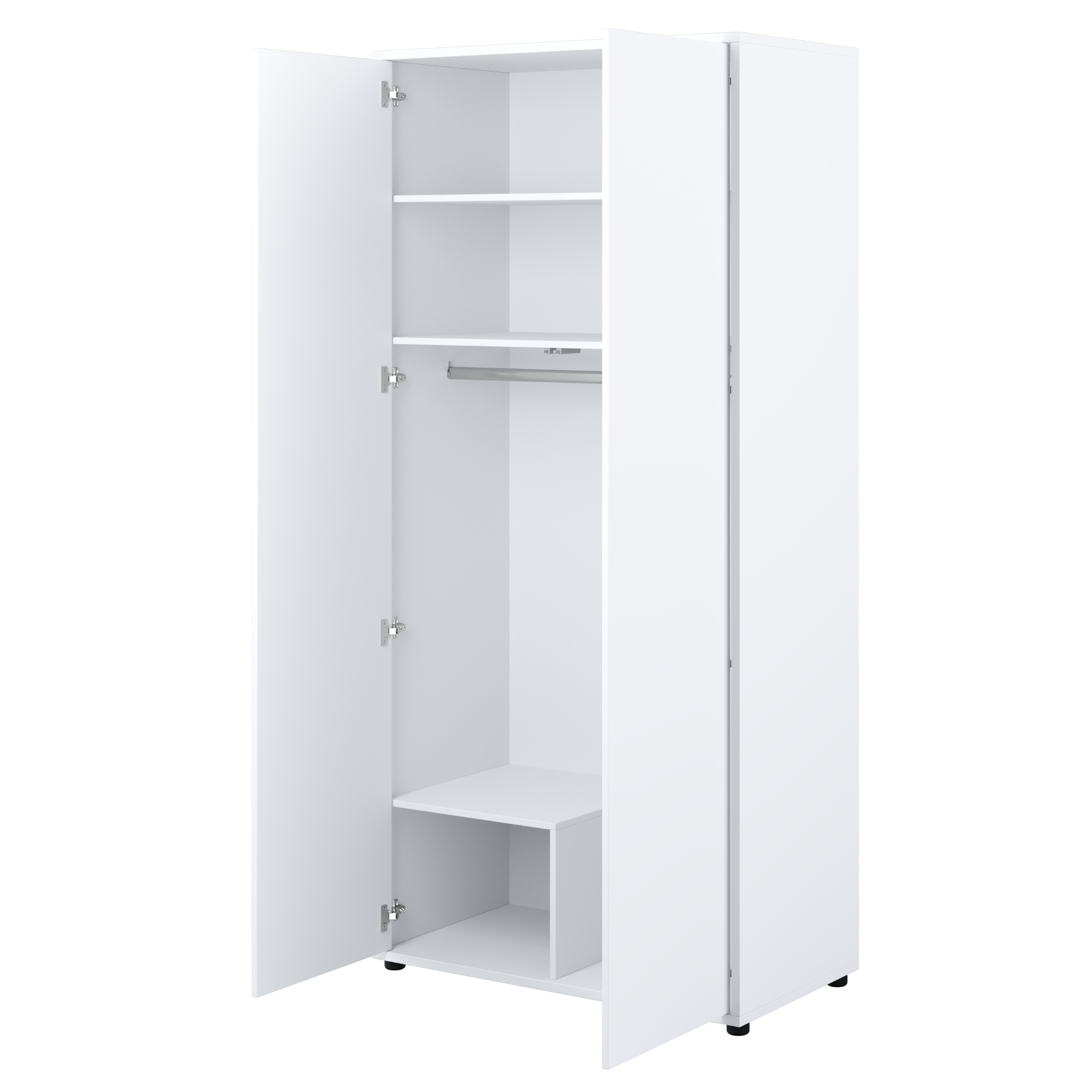 Skriňa je uzatvárateľná pomocou páru otočných dverí v minimalistickom bezrúčkovom vyhotovení so systémom push to open. Prepojený vnútorný priestor obsahuje celkom 2 klasické vložené police, 1 šatníkovú tyč a 1 menšiu policu, ktorá zároveň vytvára oddelené miesto napr. na uloženie obuvi. Skriňa je vyrobená z laminovanej drevotriesky nenáročnej na údržbu.