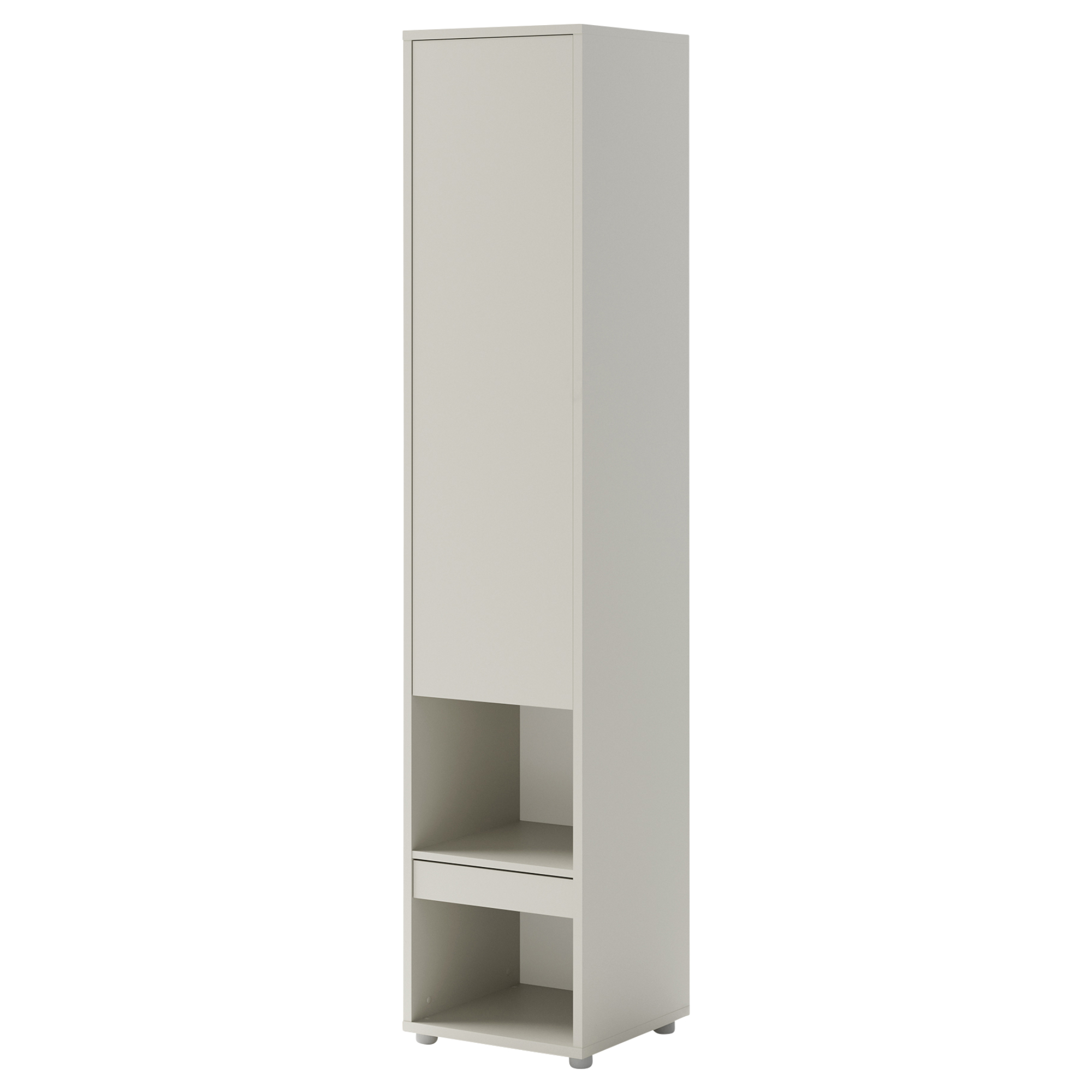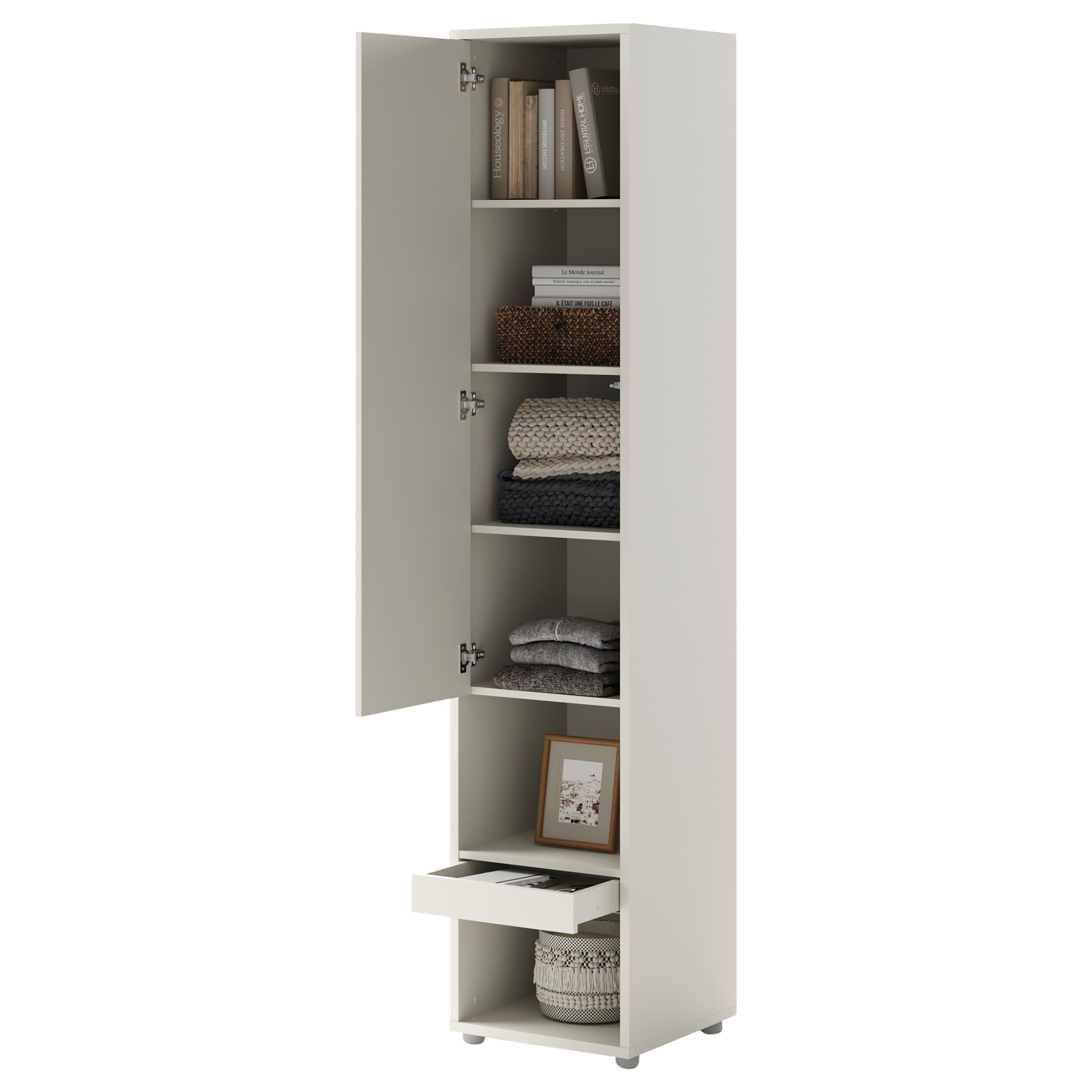 Funkčné usporiadanie skrine umožňuje uskladnenie oblečenia a zároveň vystavovanie kníh alebo dekorácií v otvorených policiach. Zásuvka je dobrým miestom na odkladanie drobností, napríklad šperkov. Vložené police vnútri skrine umožňujú prehľadné uloženie oblečenia. Nábytok je vyrobený z laminovanej dosky zakončenej hranou ABS, ktorá je odolná proti vlhkosti a opotrebovaniu rohov nábytku.