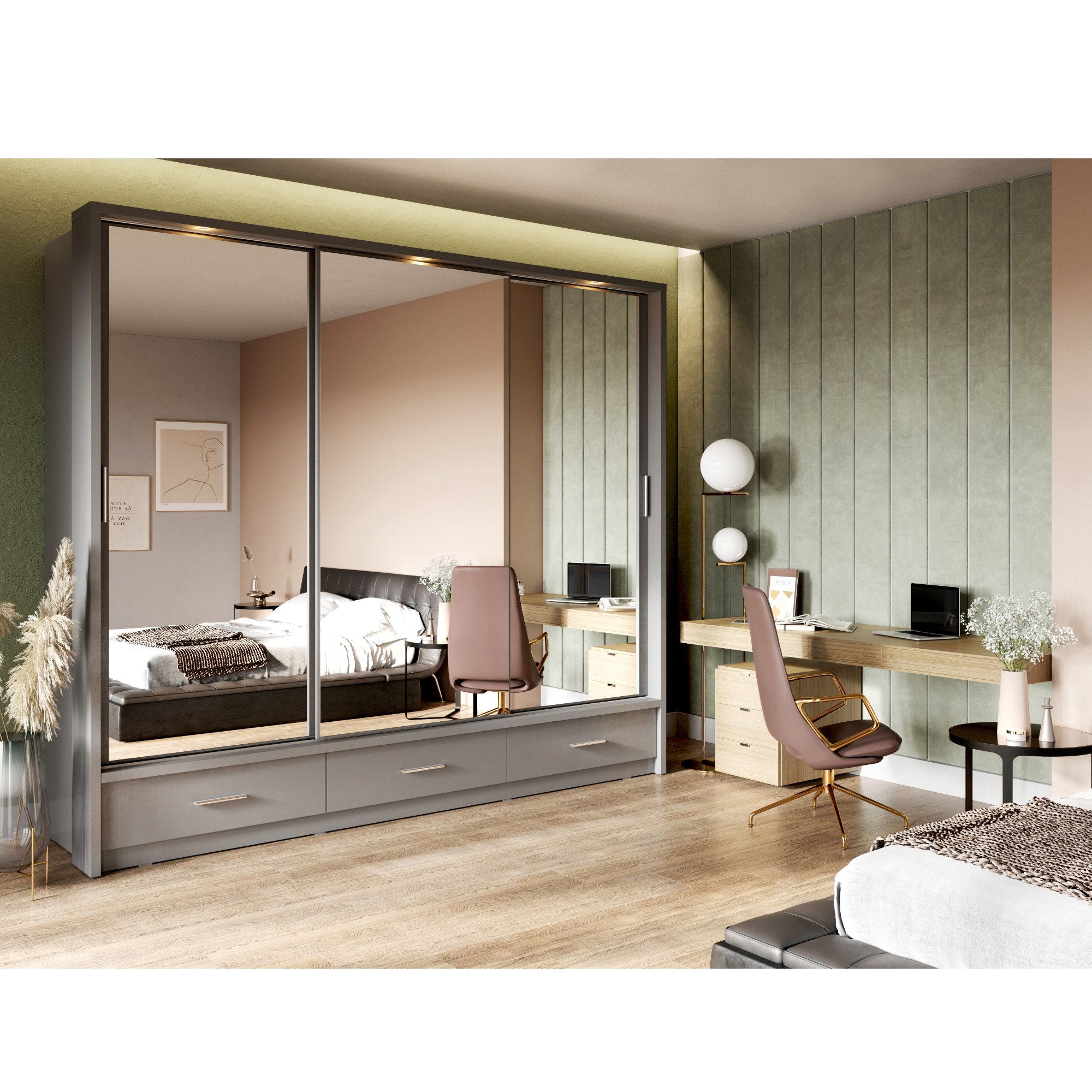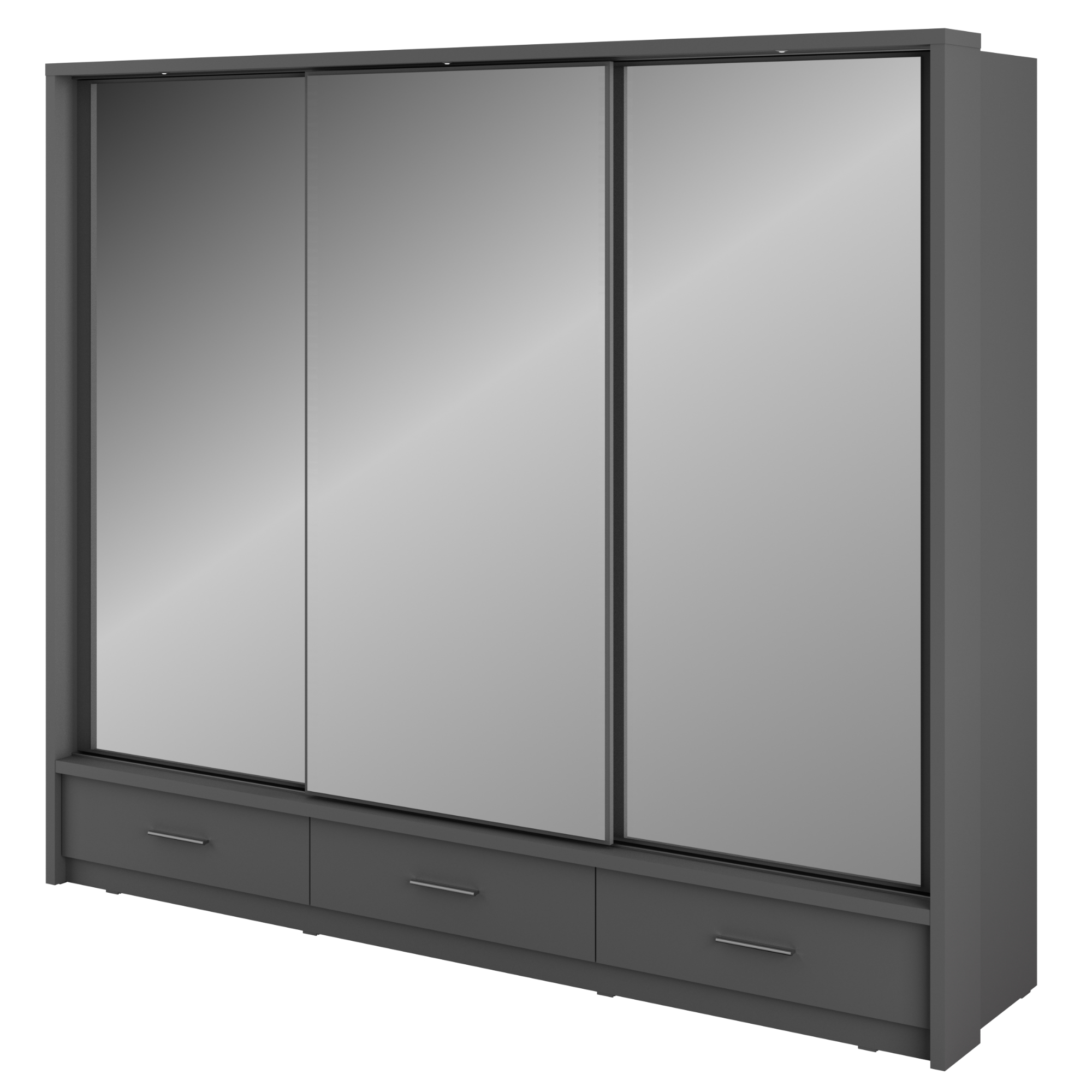 Šatníková skriňa disponuje hneď trojicou zrkadlových posuvných dverí, ktoré pomôžu k doladeniu vášho outfitu a zároveň ušetríte miesto pri otváraní. Bohatý úložný priestor zaisťuje šesť políc, jedna šatníková tyč v pravom a druhá v ľavom segmente a tri spodné zásuvky s rúčkami. Všetko oblečenie tak bude vždy logicky a prehľadne usporiadané. Praktické osvetlenie navyše zaistí dostatok svetla pri výbere a ukladaní odevov. Skriňa je vyrobená z laminovaného dreveného materiálu, ktorý sa vyznačuje ľahkou udržiavateľnosťou aj dlhou životnosťou.