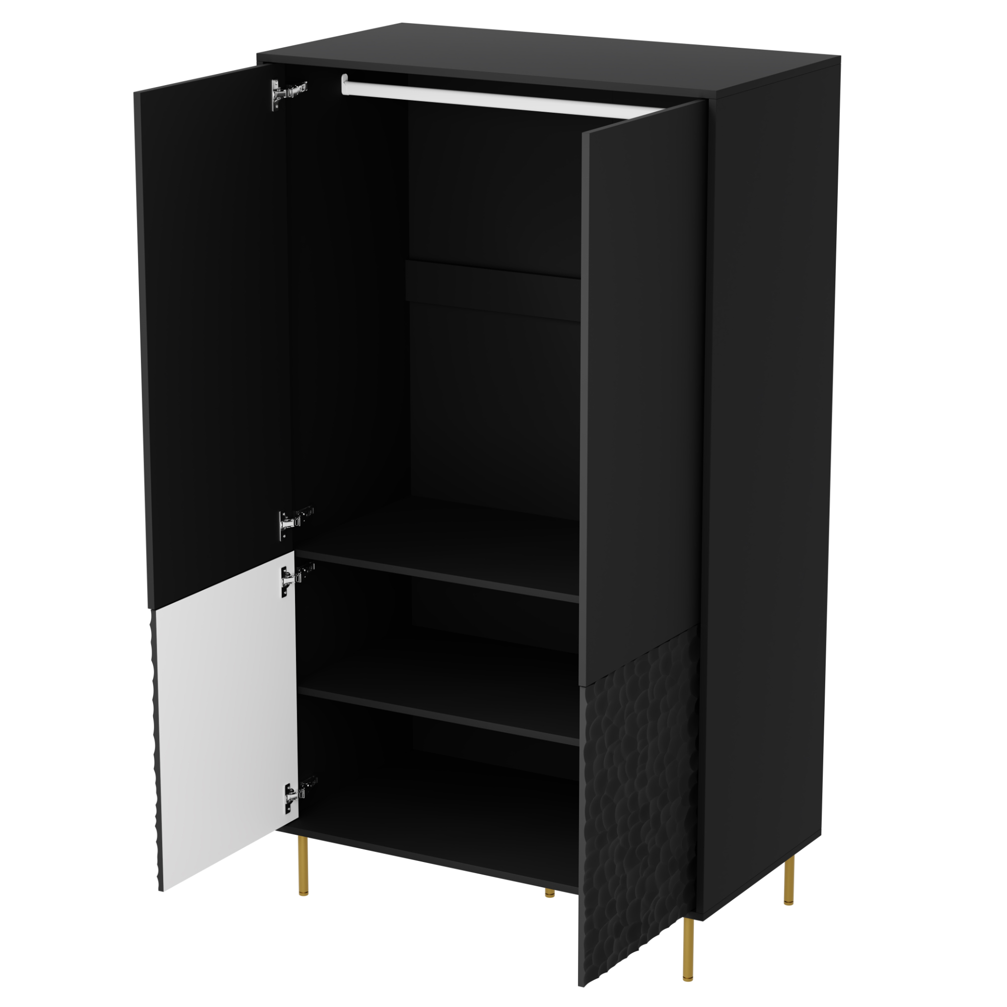 Skriňa je rozdelená do dvoch častí, hornej a spodnej. Každá časť ukrýva za 2 otočnými dvierkami odlišný priestor. V hornej časti sa nachádza 1 šatníková tyč, ktorá poslúži na zavesenie ošatenia, v spodnej časti je umiestnená vložená polica, ktorú je možné využiť na uloženie oblečenia, lôžkovín a ďalšieho textilu.