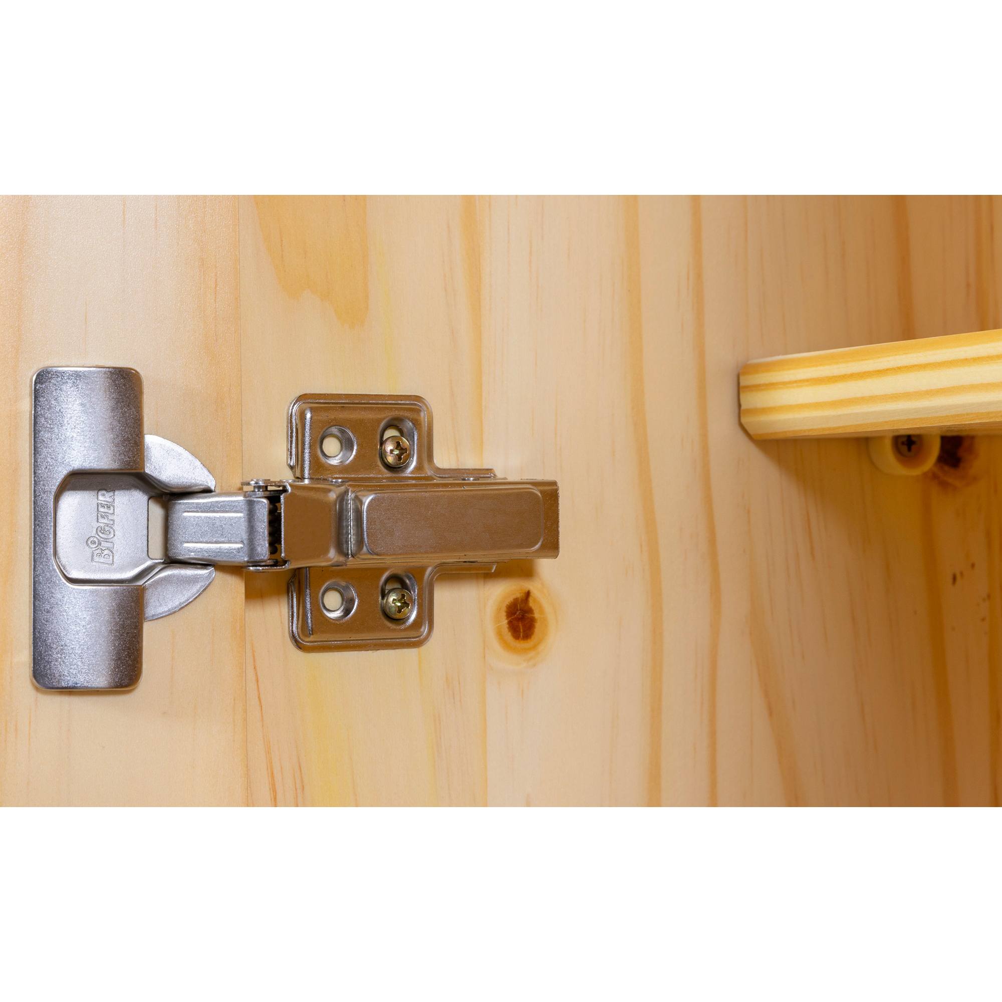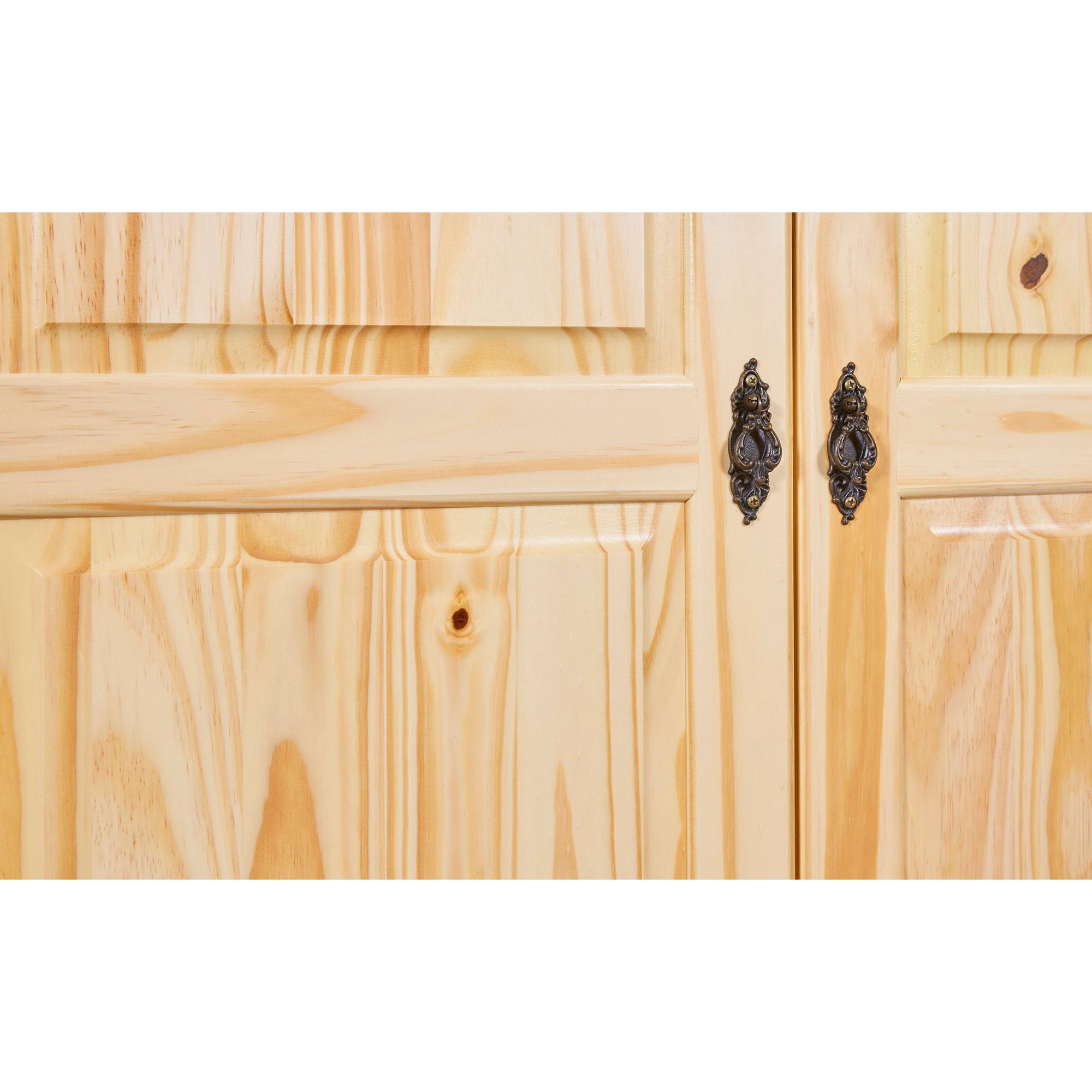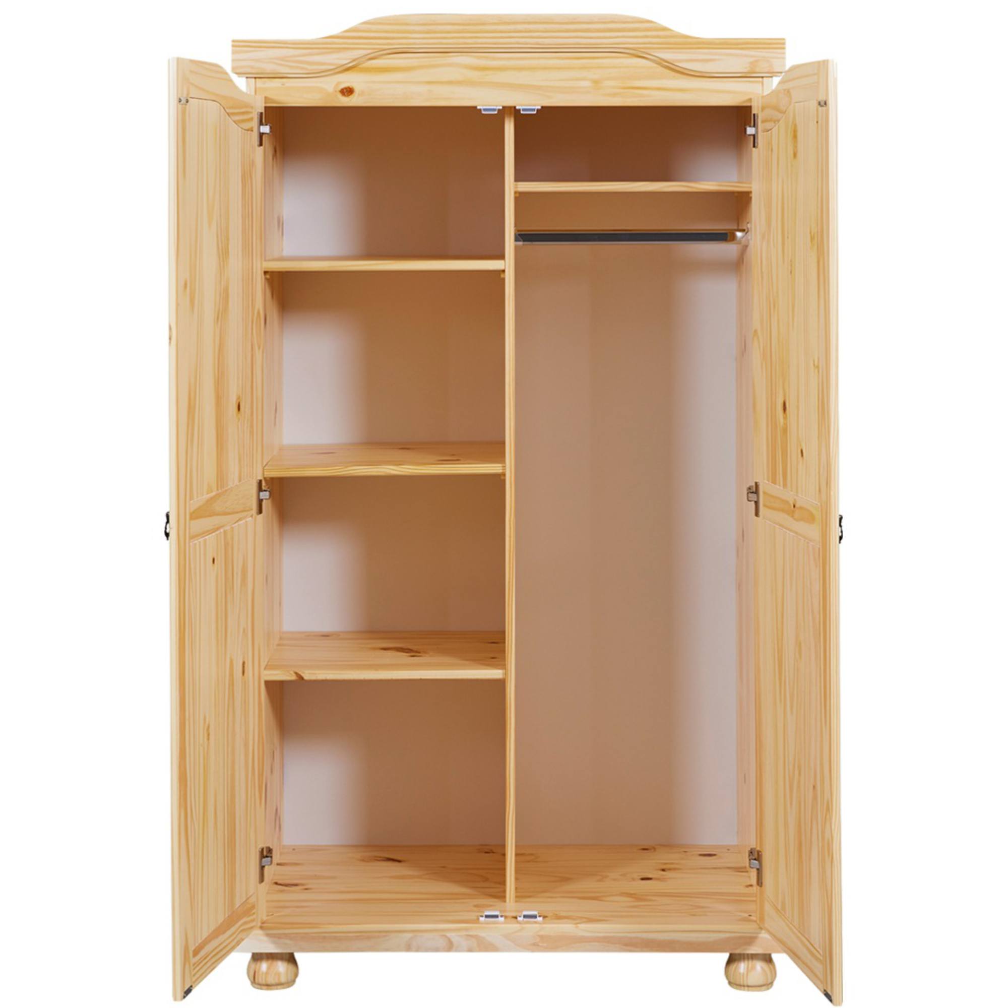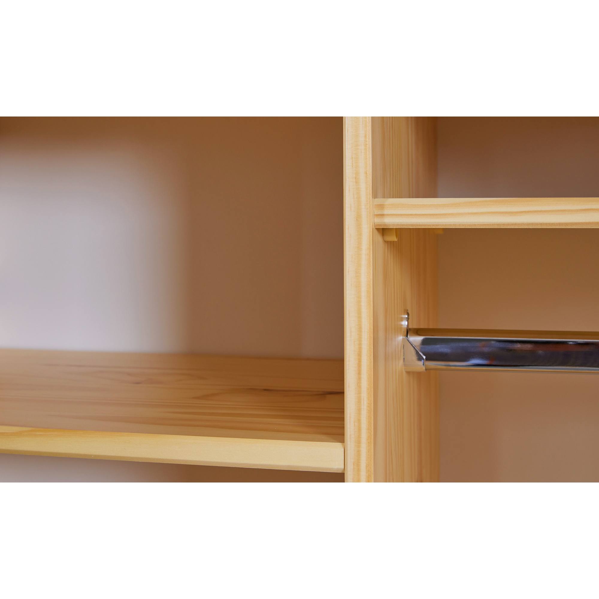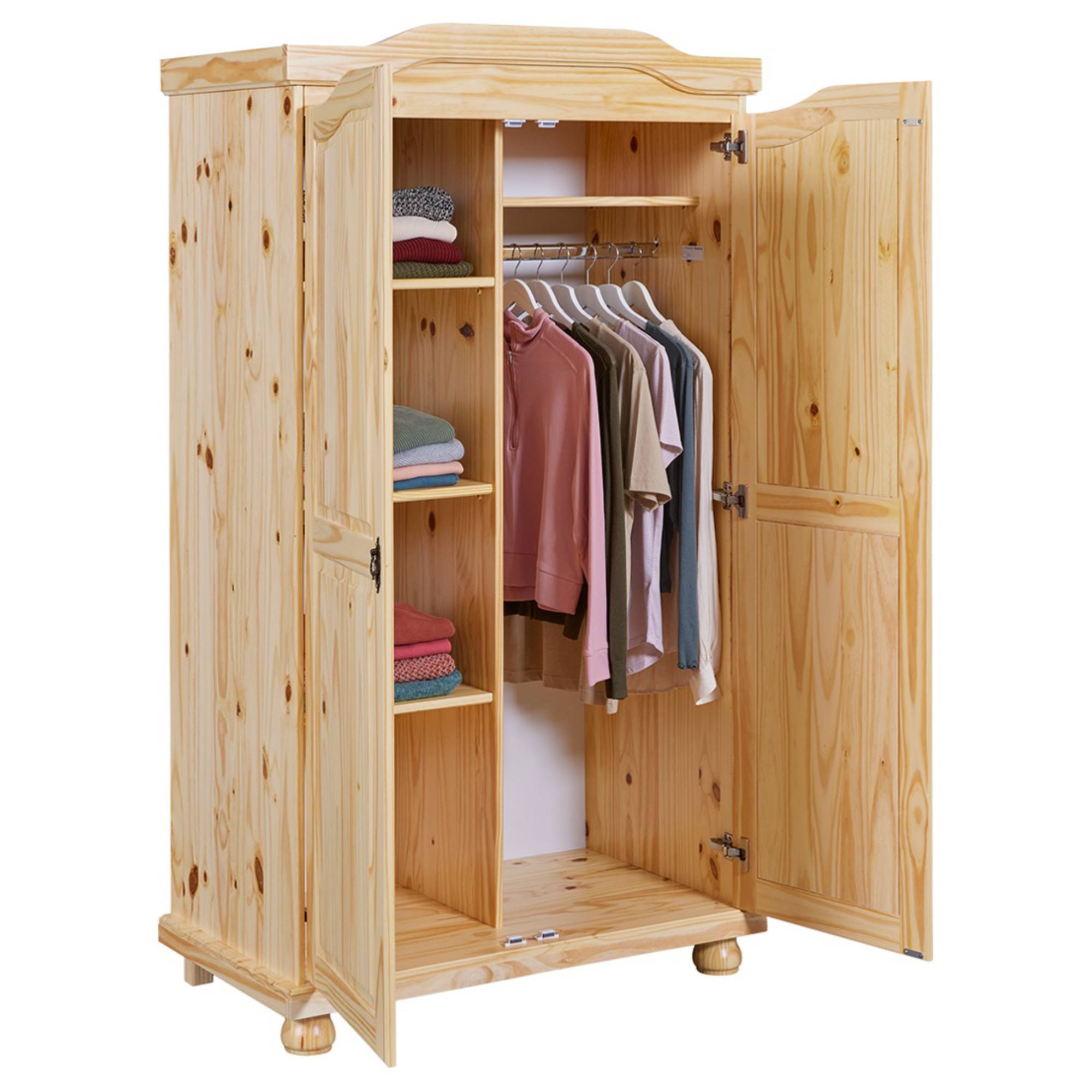 Vnútorné vybavenie skrine je bohato členené a umožní vám prehľadne zorganizovať všetko vaše oblečenie. Štyri priestranné police a vložená šatníková tyč sú kryté otočnými dvierkami, ktoré disponujú magnetickým zatváraním. Vďaka magnetom držia dvere v uzavretej polohe a nebudú sa samovoľne otvárať. Skriňa je vyrobená z masívneho dreva, ktoré má dlhú životnosť.