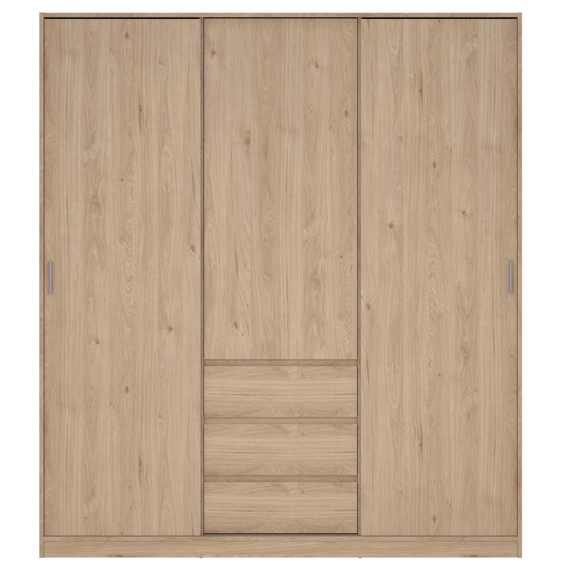Skriňa disponuje tromi dverami, kedy jedny sú otočné a zvyšné 2 posuvné. Priestor za prostrednými dverami je vybavený 3 vloženými policami na prehľadné skladovanie poskladaných odevov. Ľavé dvere, rovnako ako tie pravé, za sebou ukrývajú šatníkovú tyč a vloženú policu nad ňou. Skriňa obsahuje aj 3 praktické zásuvky ideálne na oddelenie drobného oblečenia a doplnkov. Vyrobená je z laminovanej drevotriesky s povrchom nenáročným na údržbu.