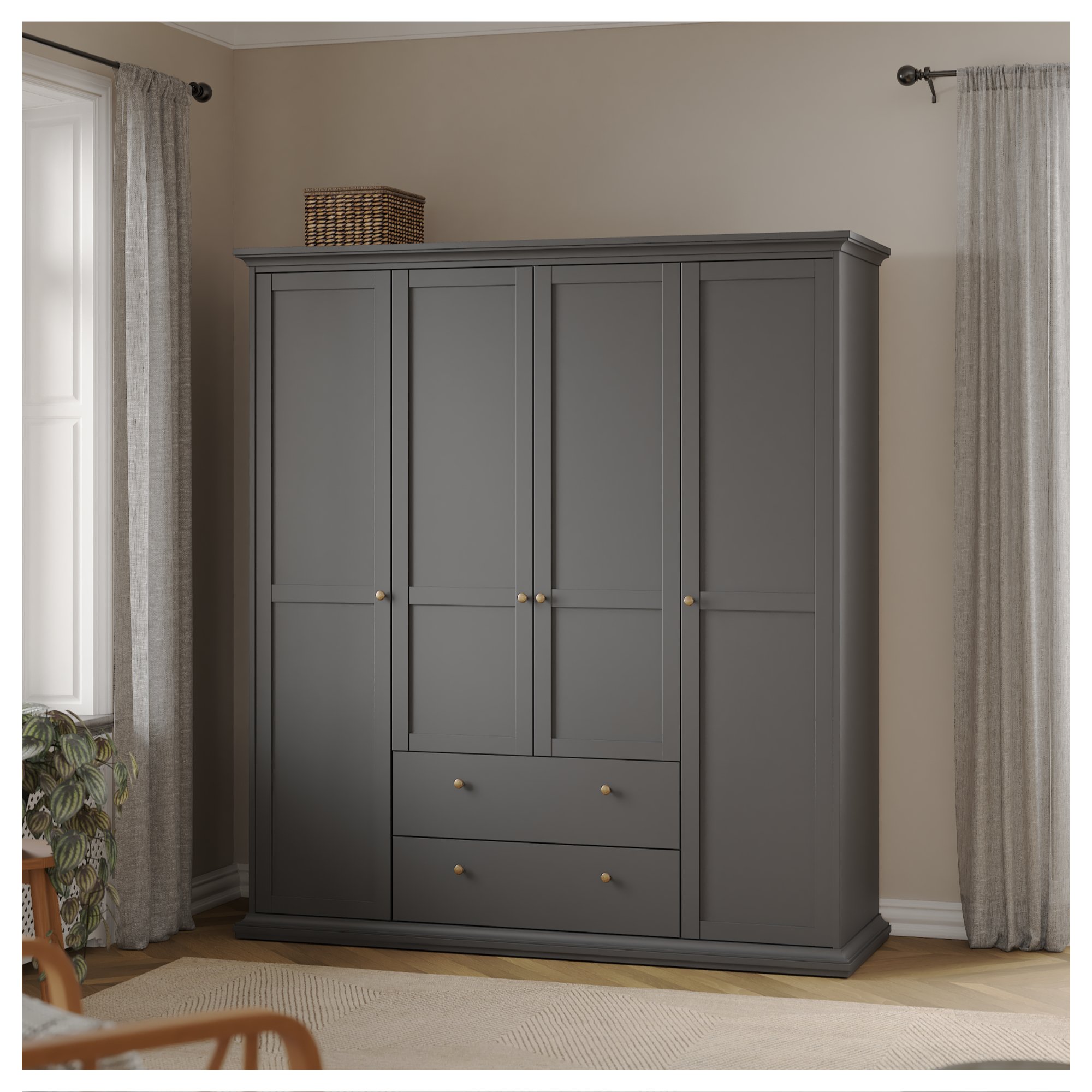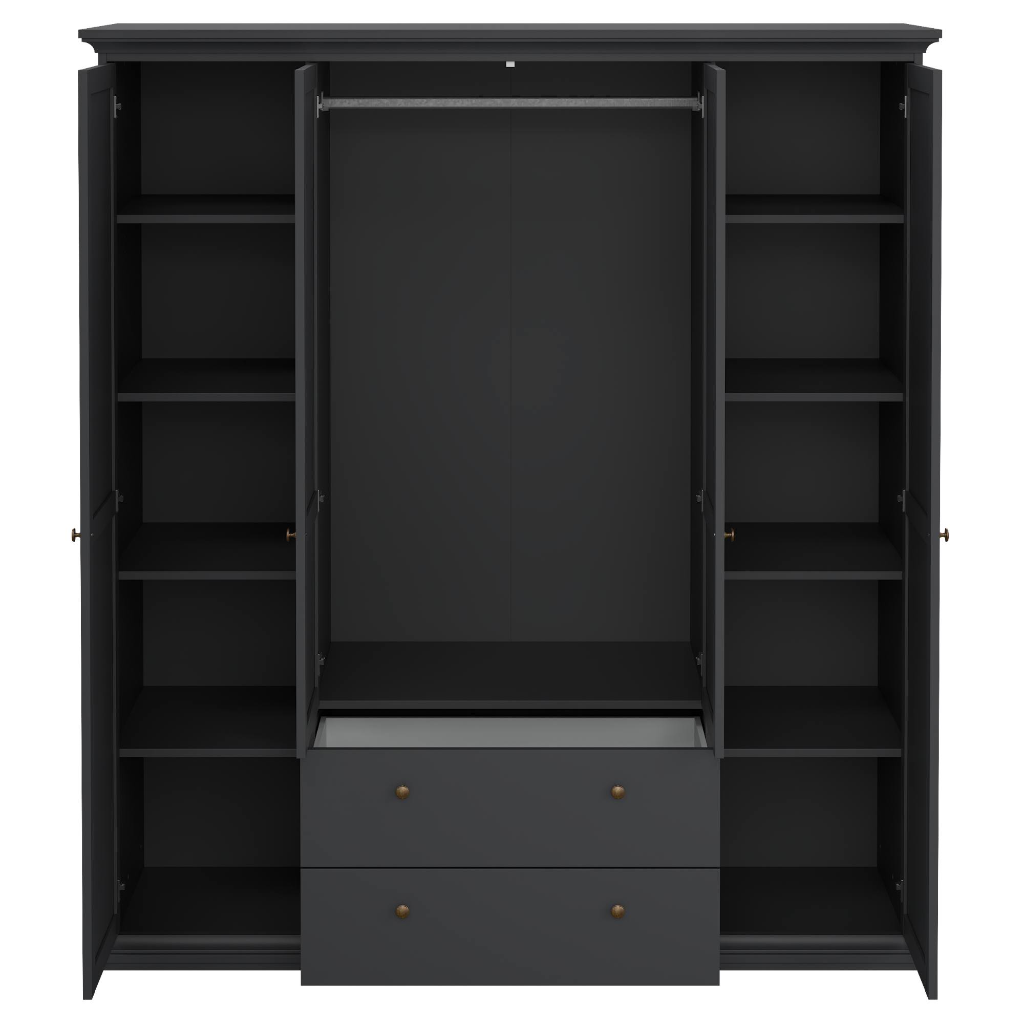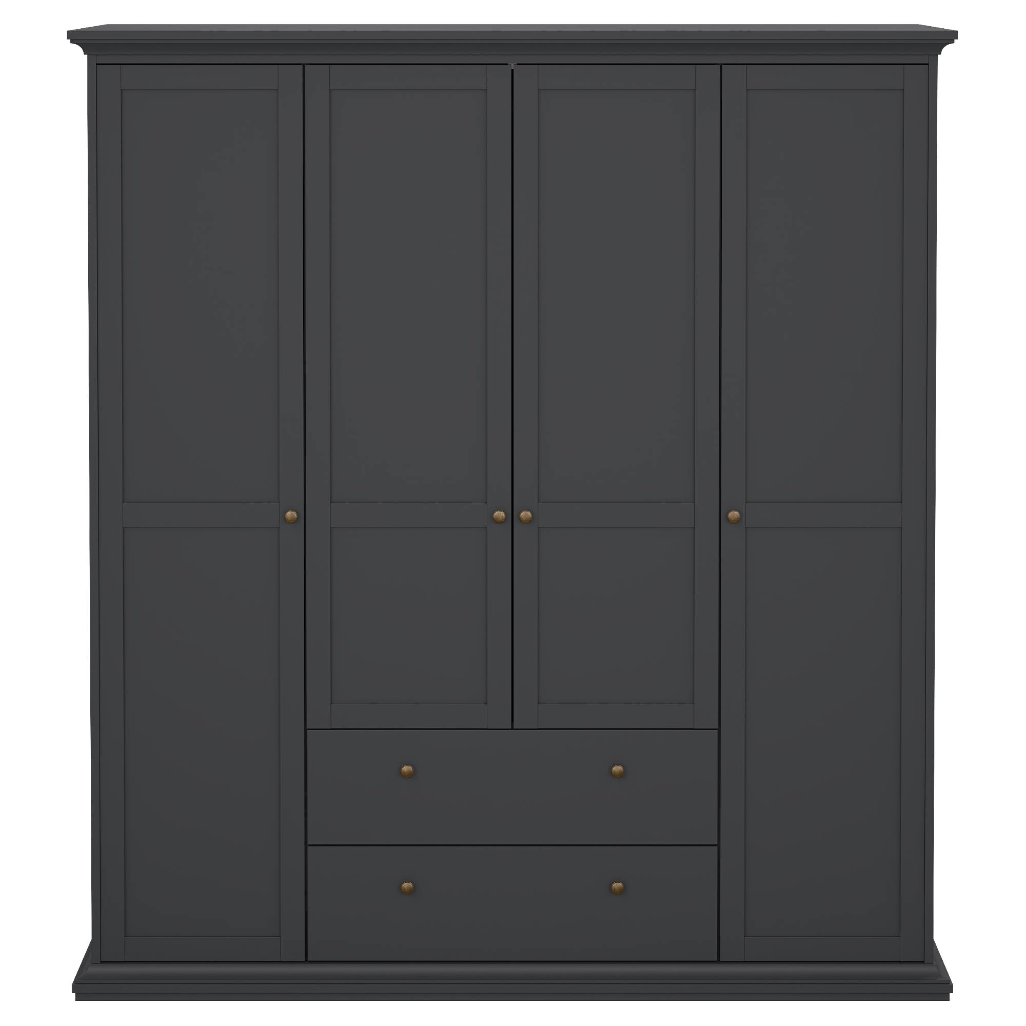 Skriňa je uzatvárateľná 4 otočnými dverami, vďaka ktorým môžete naplno využiť vnútorný priestor. Za prostredným párom dverí sa nachádza prepojený priestor so šatníkovou tyčou na zavesenie krčivých a objemnejších odevov. Pod touto sekciou sa nachádzajú ešte 2 zásuvky na oddelenie drobnejších predmetov. Samostatné ľavé dvere, rovnako ako tie pravé, za sebou ukrývajú 4 vložené police. Všetky predné plochy sú navyše na ľahšiu manipuláciu osadené decentnými oceľovými rúčkami. Konštrukcia skrine je vyrobená z fóliovanej drevotriesky s povrchom nenáročným na údržbu.