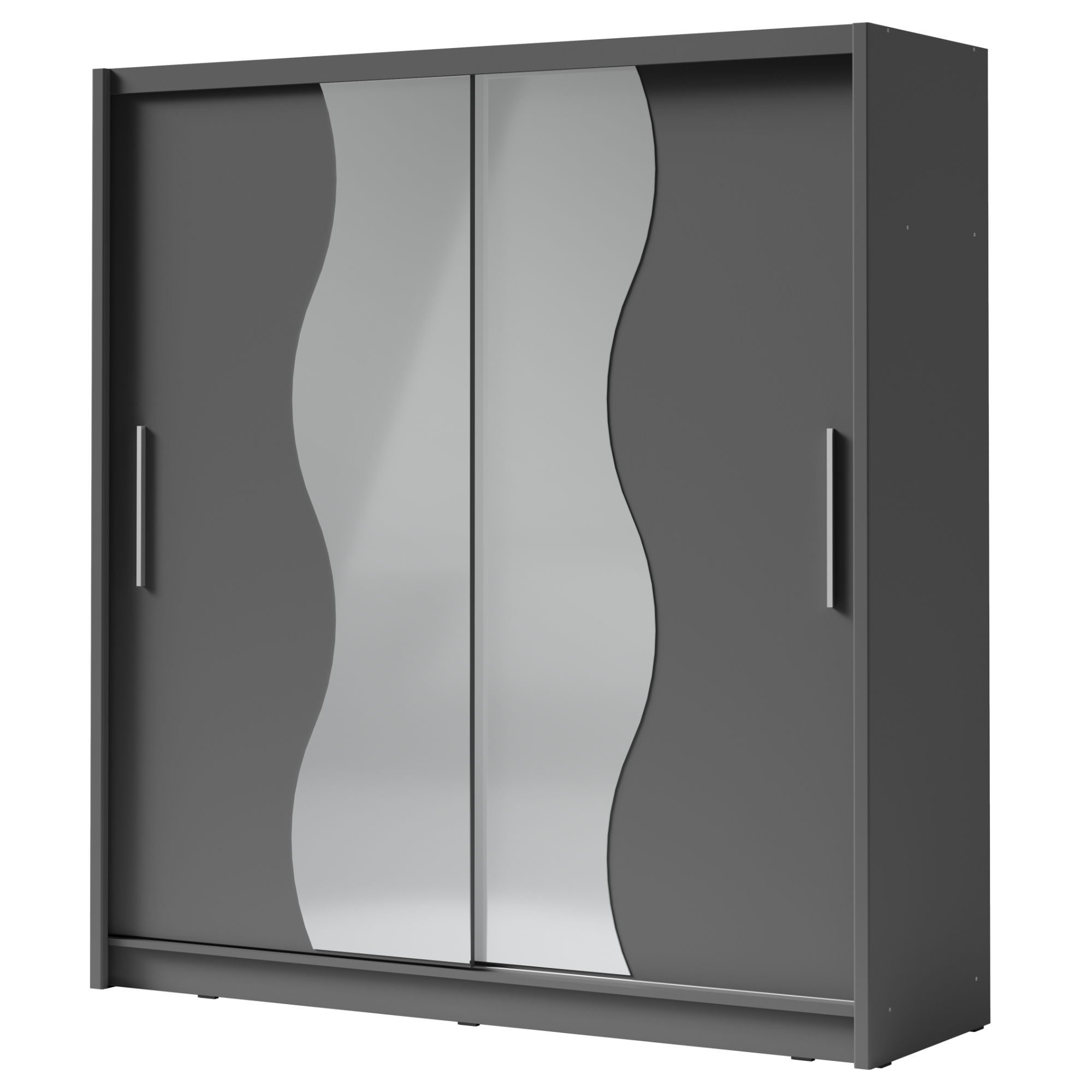 Za posuvnými dverami nájdete 8 vložených políc na uskladnenie oblečenia, lôžkovín, alebo iných predmetov, ktoré nepotrebujete mať práve na očiach. Na zavesenie ramienok je tu šatníková tyč. Dvere s deleným zrkadlom, opticky zväčšia váš interiér.