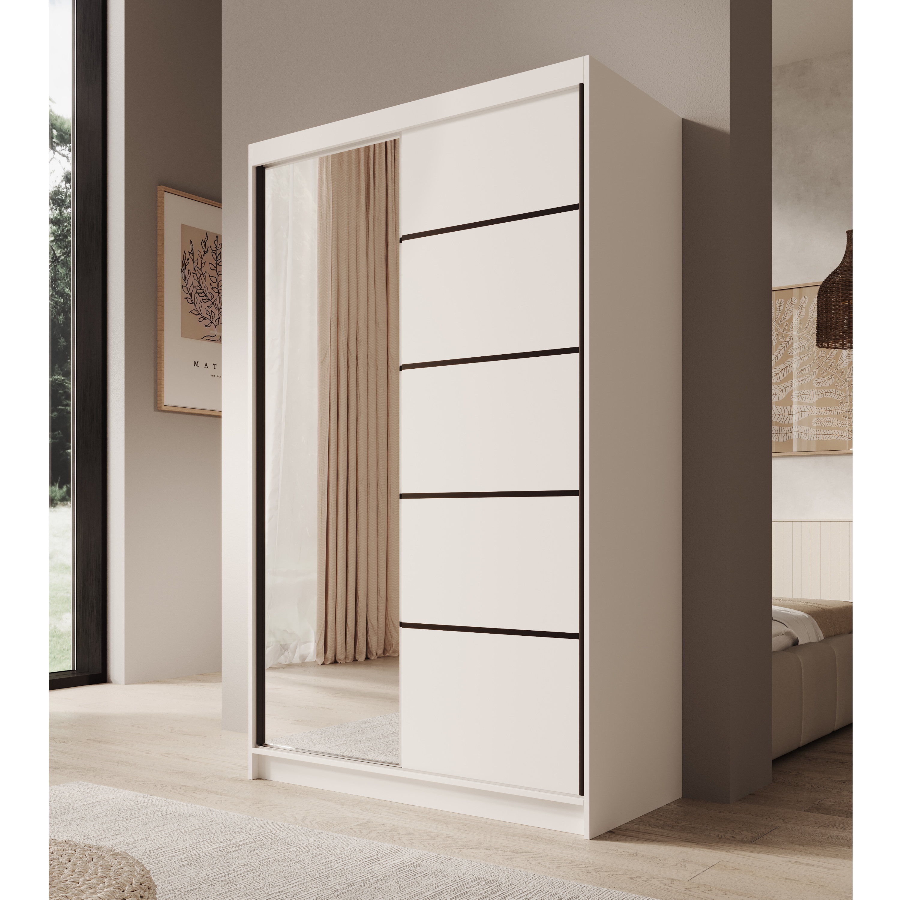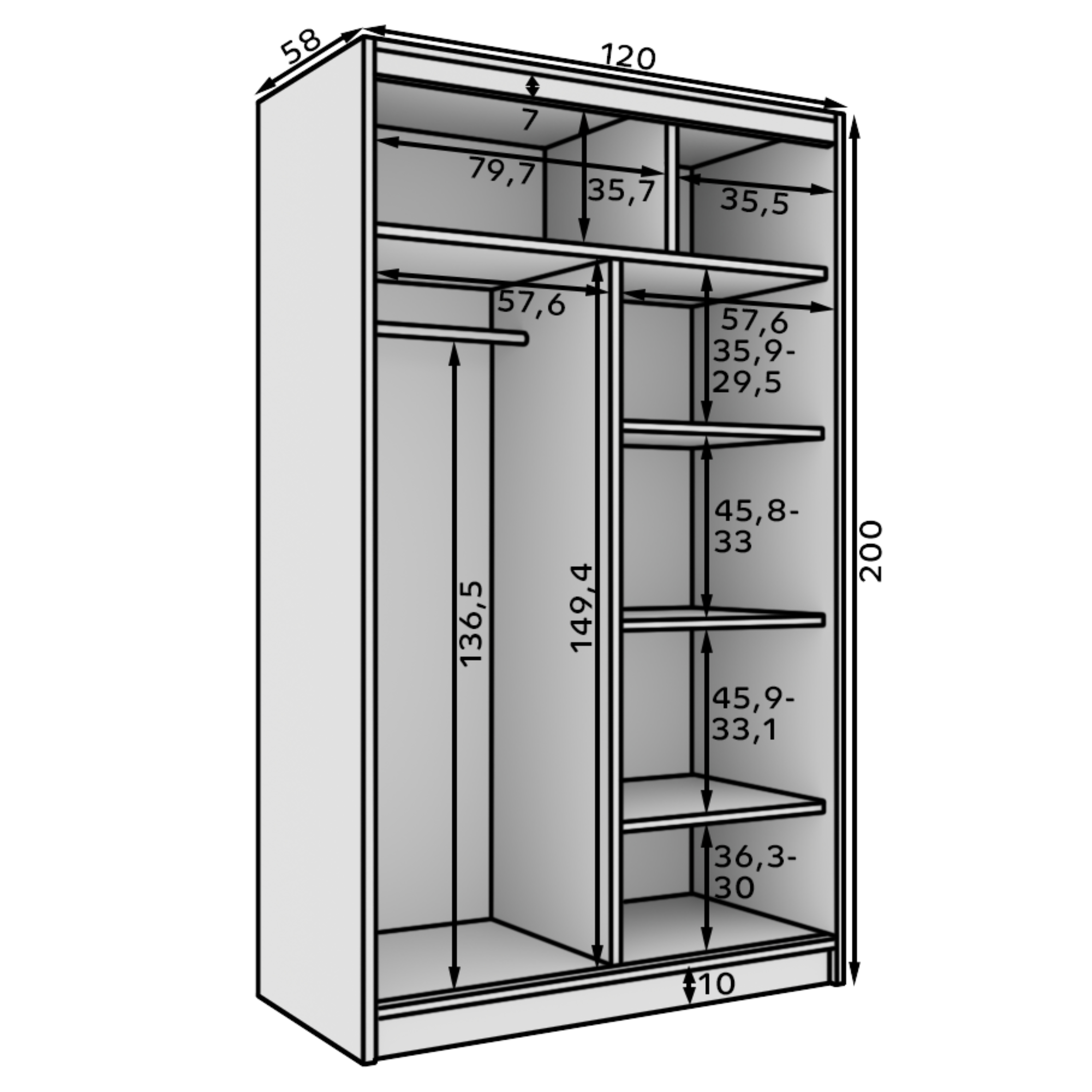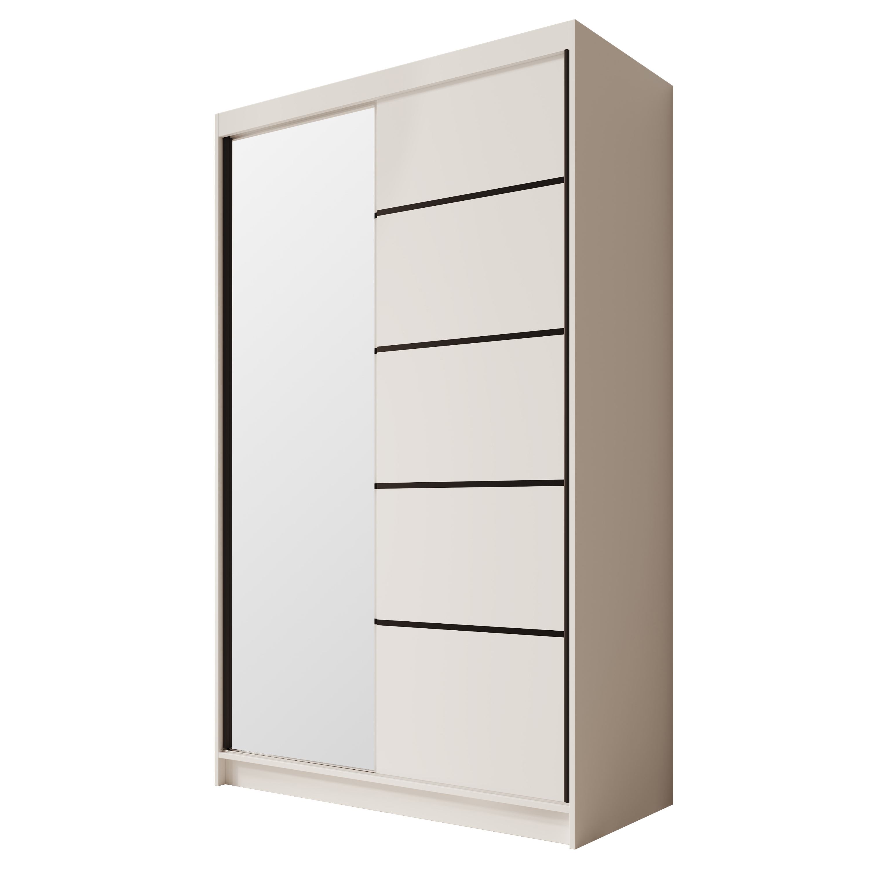 Vnútorné vybavenie pozostáva celkovo z 5 políc a 1 šatníkovej tyče na rôzne typy odevov. Skriňa je uzatváraná posuvnými dverami, ktoré šetria cenný priestor pred skriňou aj v jej vnútri. Jedny z dverí sú navyše vybavené praktickým zrkadlom, v ktorom si môžete kedykoľvek upraviť svoj vzhľad a zároveň skvele presvetlí miestnosť. Korpus je vyrobený z laminovaného dreveného materiálu doplneného o ABS hrany, ktoré chránia pred mechanickým poškodením.