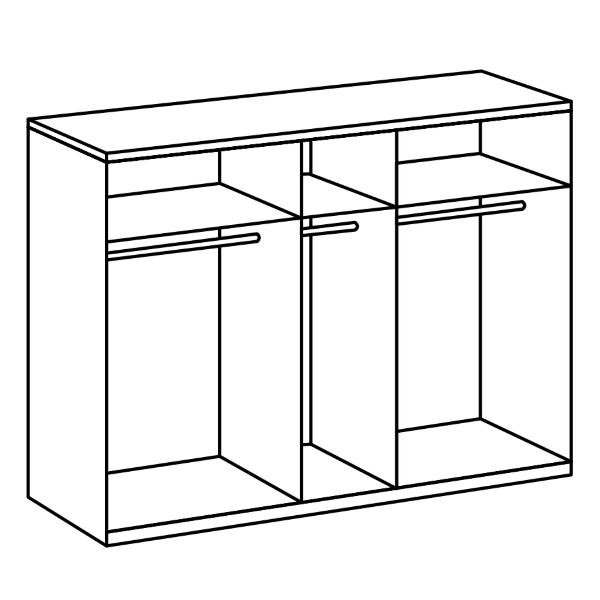 Vnútorný priestor skrine je rozdelený do 3 blokov, kedy v každom z nich sa nachádza šatníková tyč a vložená polica nad ňou. Úložný priestor je krytý 5 otočnými dverami, z ktorých 3 prostredné sú vybavené zrkadlami, ktoré opticky zväčšia a presvetlia interiér. Všetky dvere sú doplnené o decentné kovové rúčky na jednoduchú každodennú manipuláciu. Skriňa je vyrobená z laminovaného dreveného materiálu s materiálom nenáročným na údržbu.