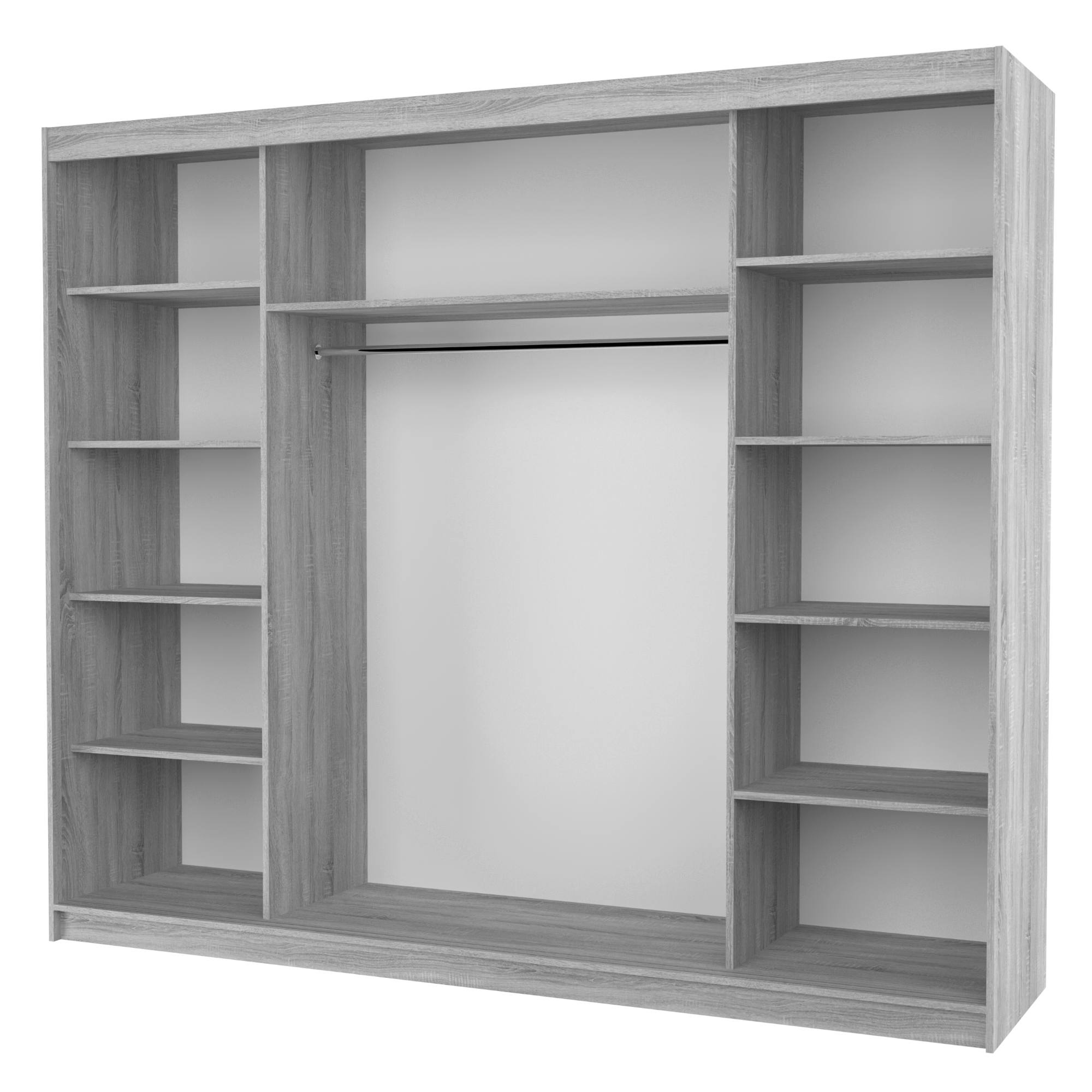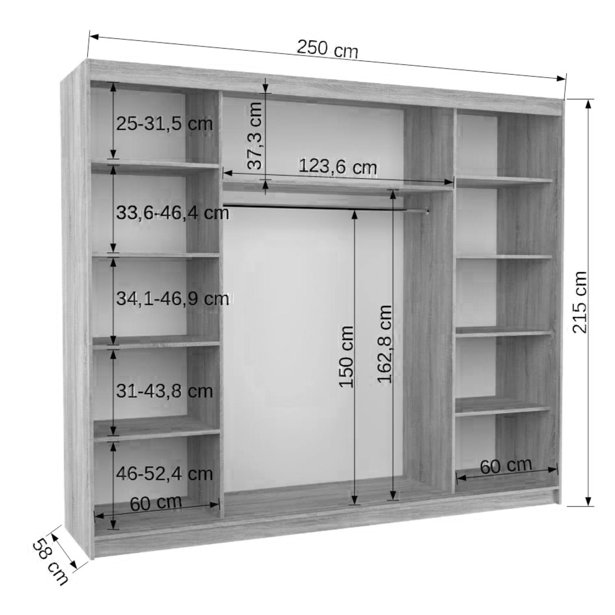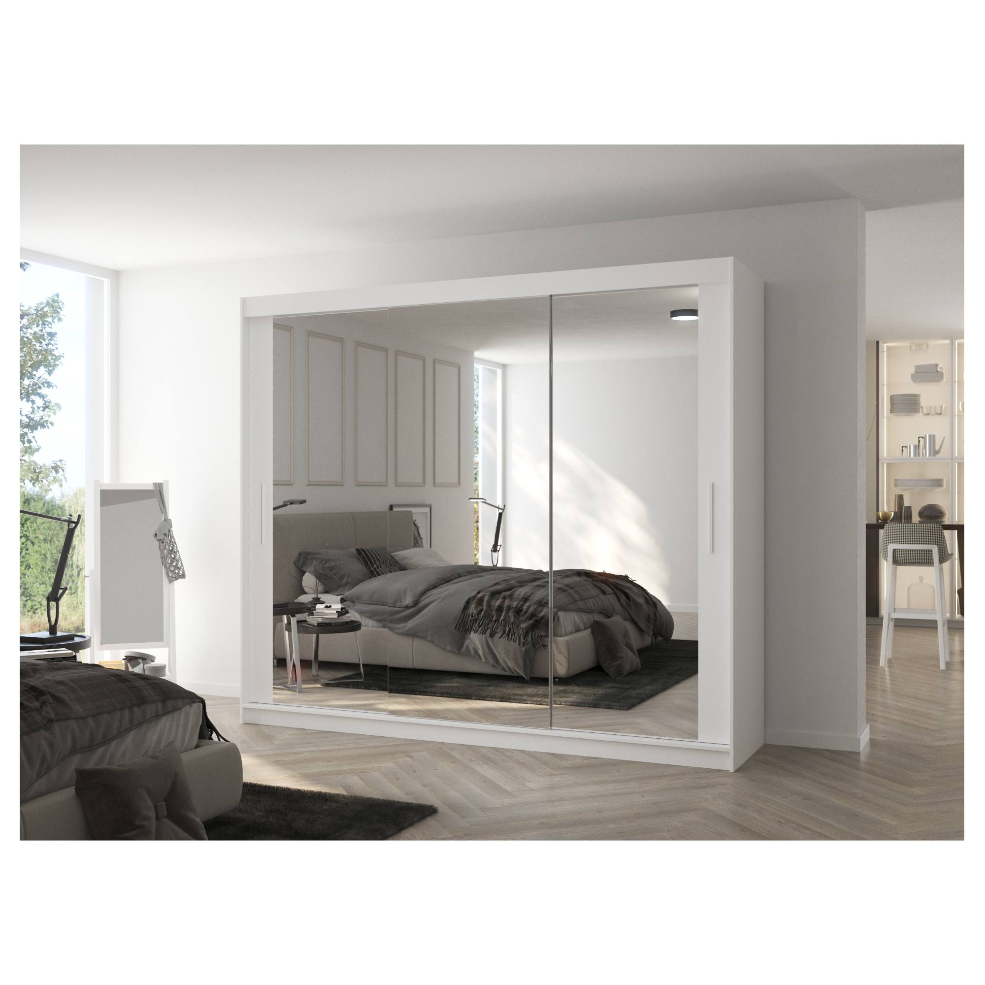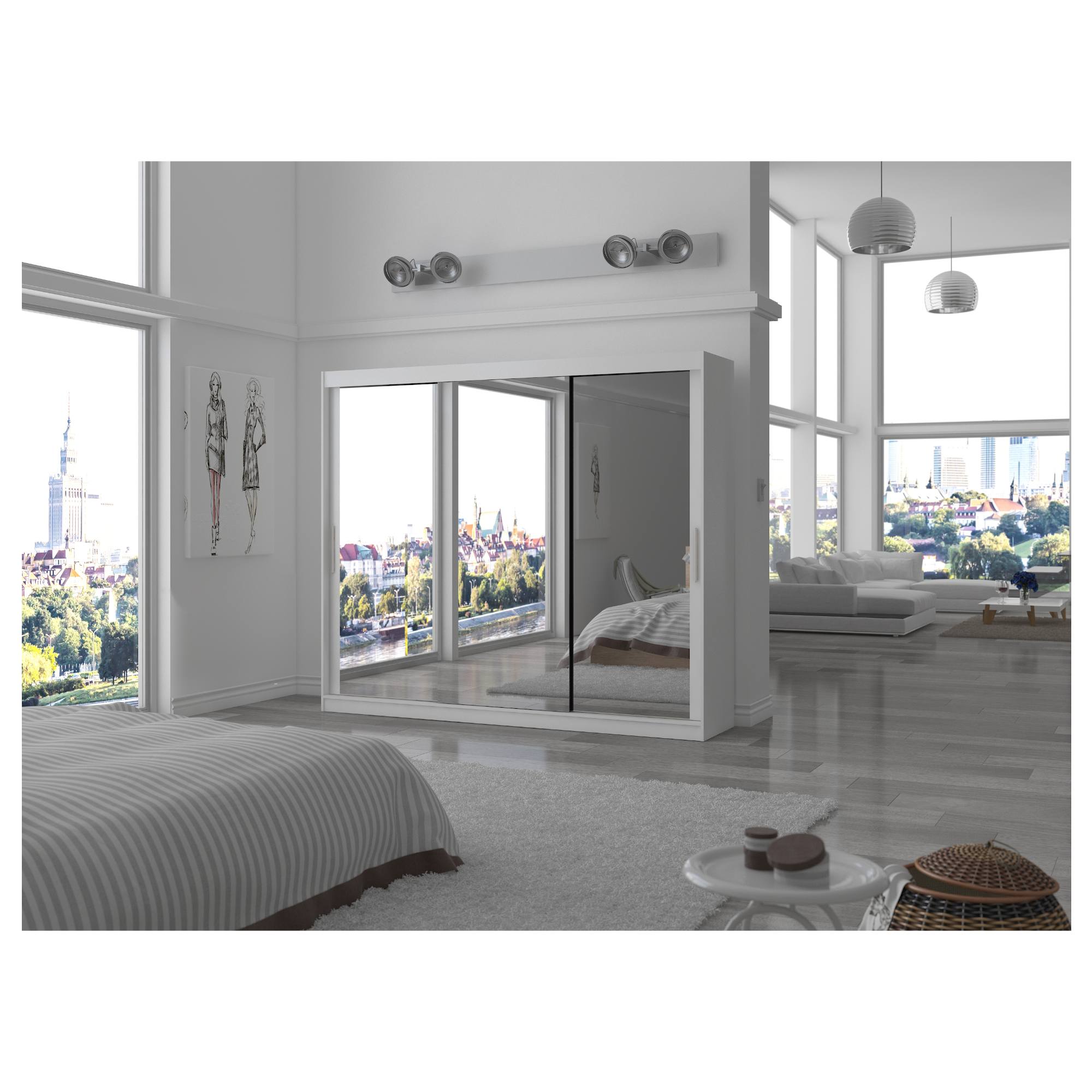 Disponuje posuvnými dverami s hliníkovými vodiacimi lištami pre hladké a pohodlné otváranie. Dvere skrine sú doplnené veľkou zrkadlovou plochou, ktorá uľahčí vaše prípravy počas ranného zhonu a zároveň opticky zväčší priestor. Zároveň odráža viac svetla do miestnosti, vďaka čomu pôsobí interiér svetlejšie.