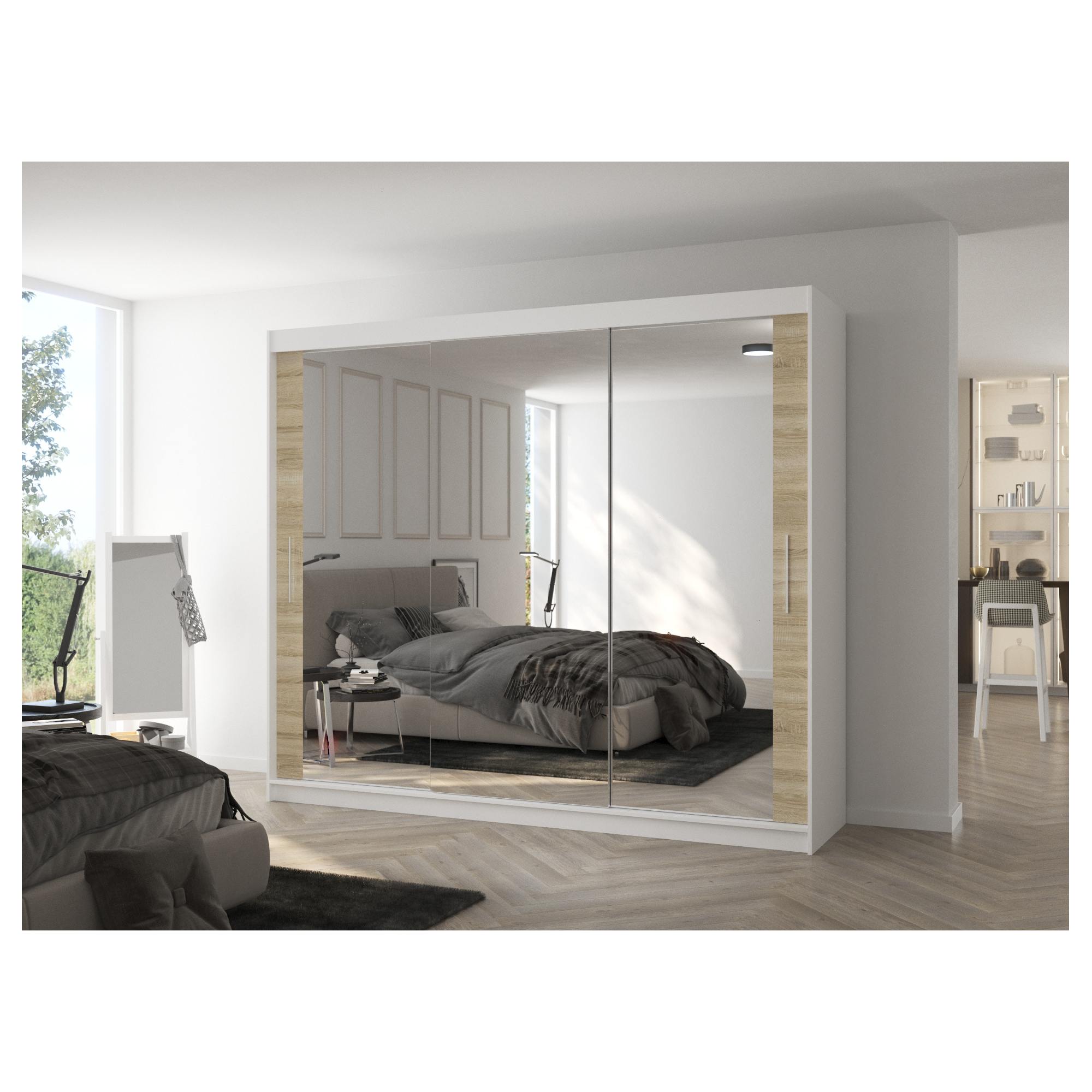 Disponuje posuvnými dverami s hliníkovými vodiacimi lištami pre hladké a pohodlné otváranie. Dvere skrine sú doplnené veľkou zrkadlovou plochou, ktorá uľahčí vaše prípravy počas ranného zhonu a zároveň opticky zväčší priestor. Zároveň odráža viac svetla do miestnosti, vďaka čomu pôsobí interiér svetlejšie.