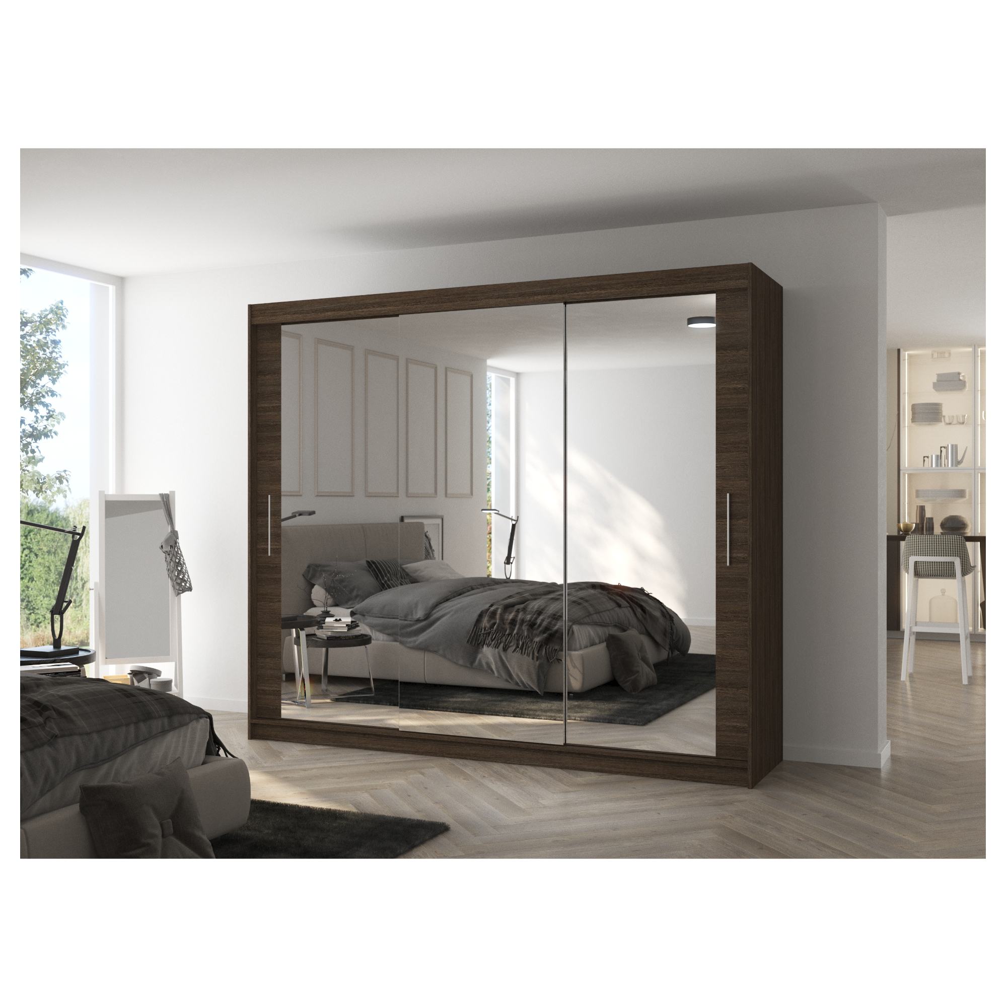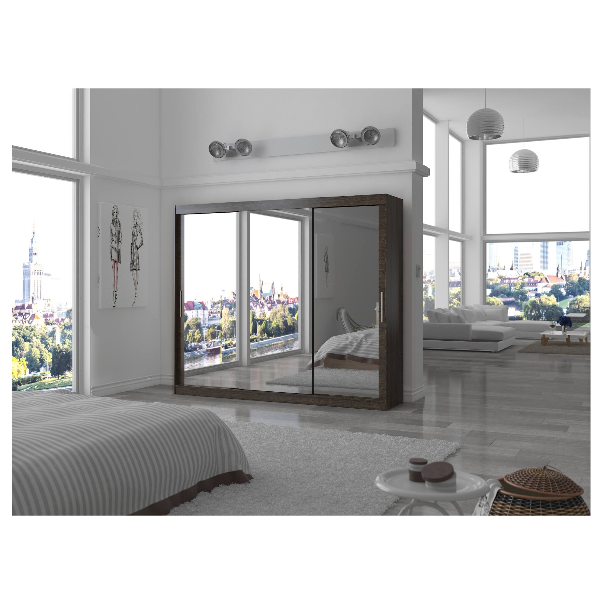 Disponuje posuvnými dverami s hliníkovými vodiacimi lištami pre hladké a pohodlné otváranie. Dvere skrine sú doplnené veľkou zrkadlovou plochou, ktorá uľahčí vaše prípravy počas ranného zhonu a zároveň opticky zväčší priestor. Zároveň odráža viac svetla do miestnosti, vďaka čomu pôsobí interiér svetlejšie.