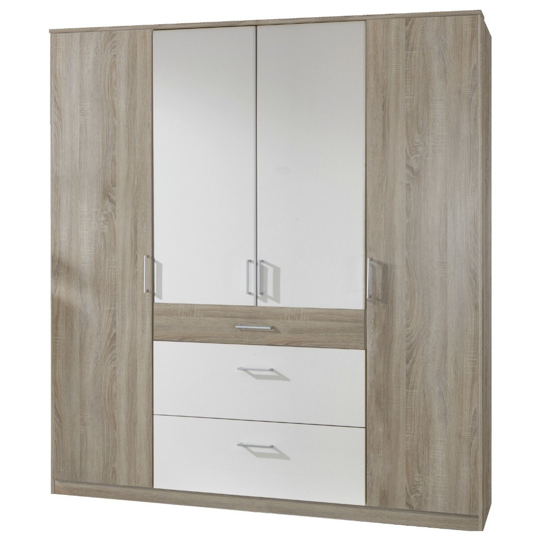 Praktická 4-dverová skriňa CLICK je vyrobená v obľúbenej kombinácii bielej a dekoru dreva. Vnútorný priestor sa skladá zo 4 políc, 3 zásuviek a 2 šatníkových tyčí. Ku skrini je možné dokúpiť nadstavbu.