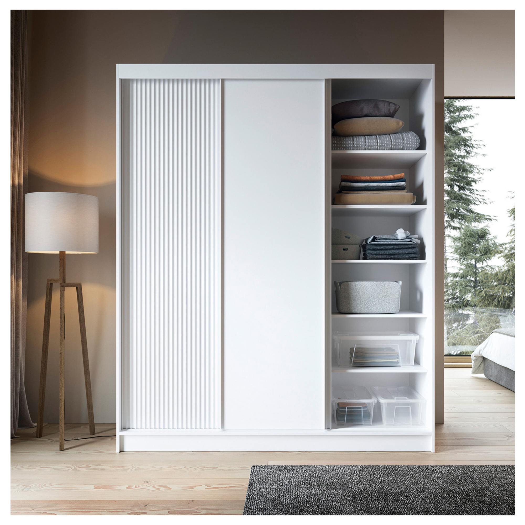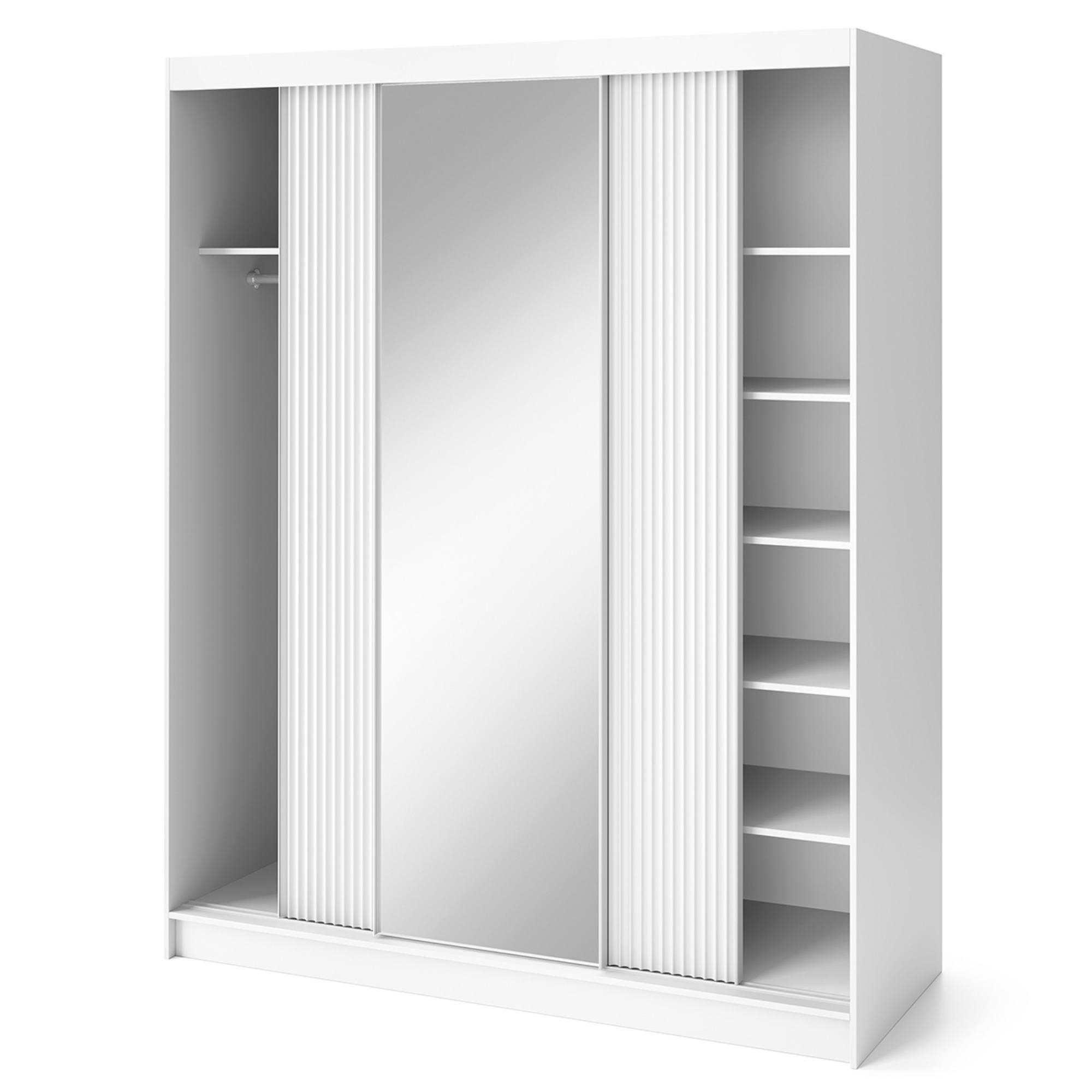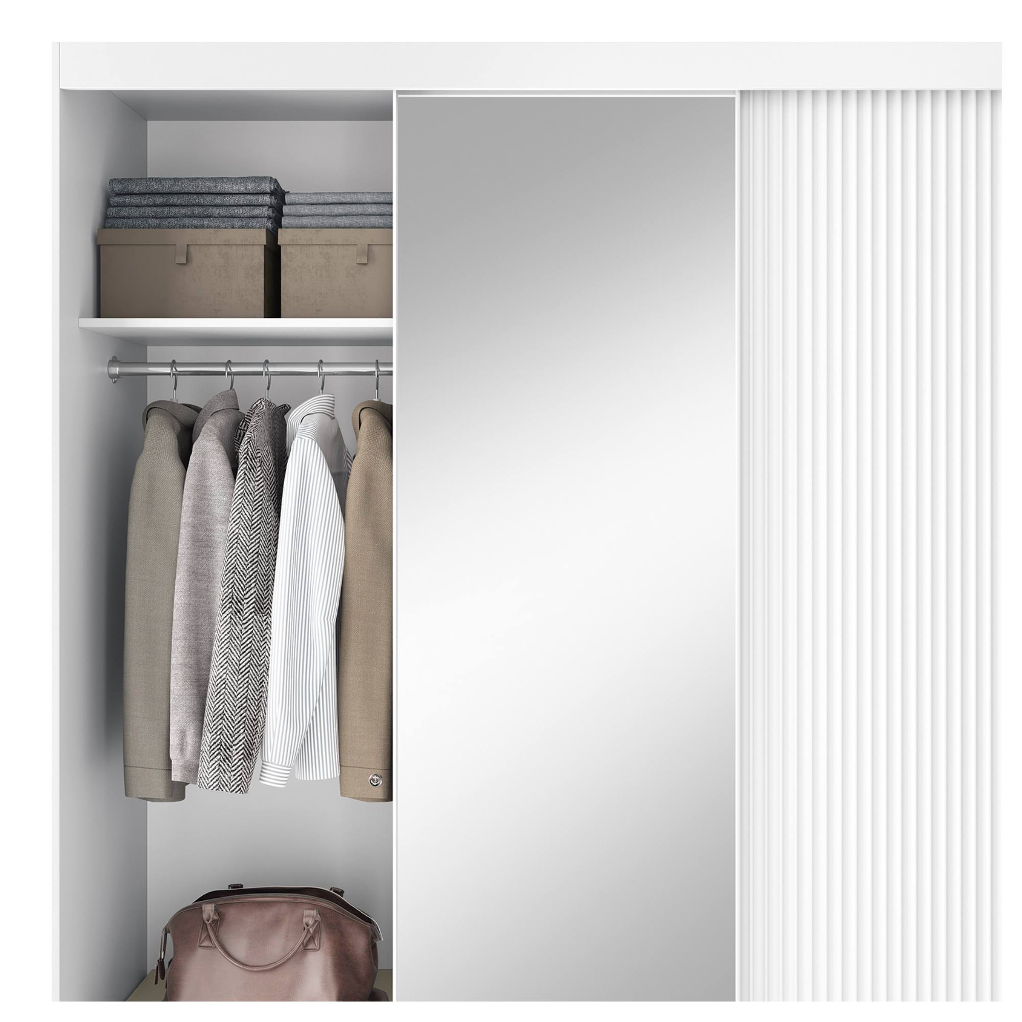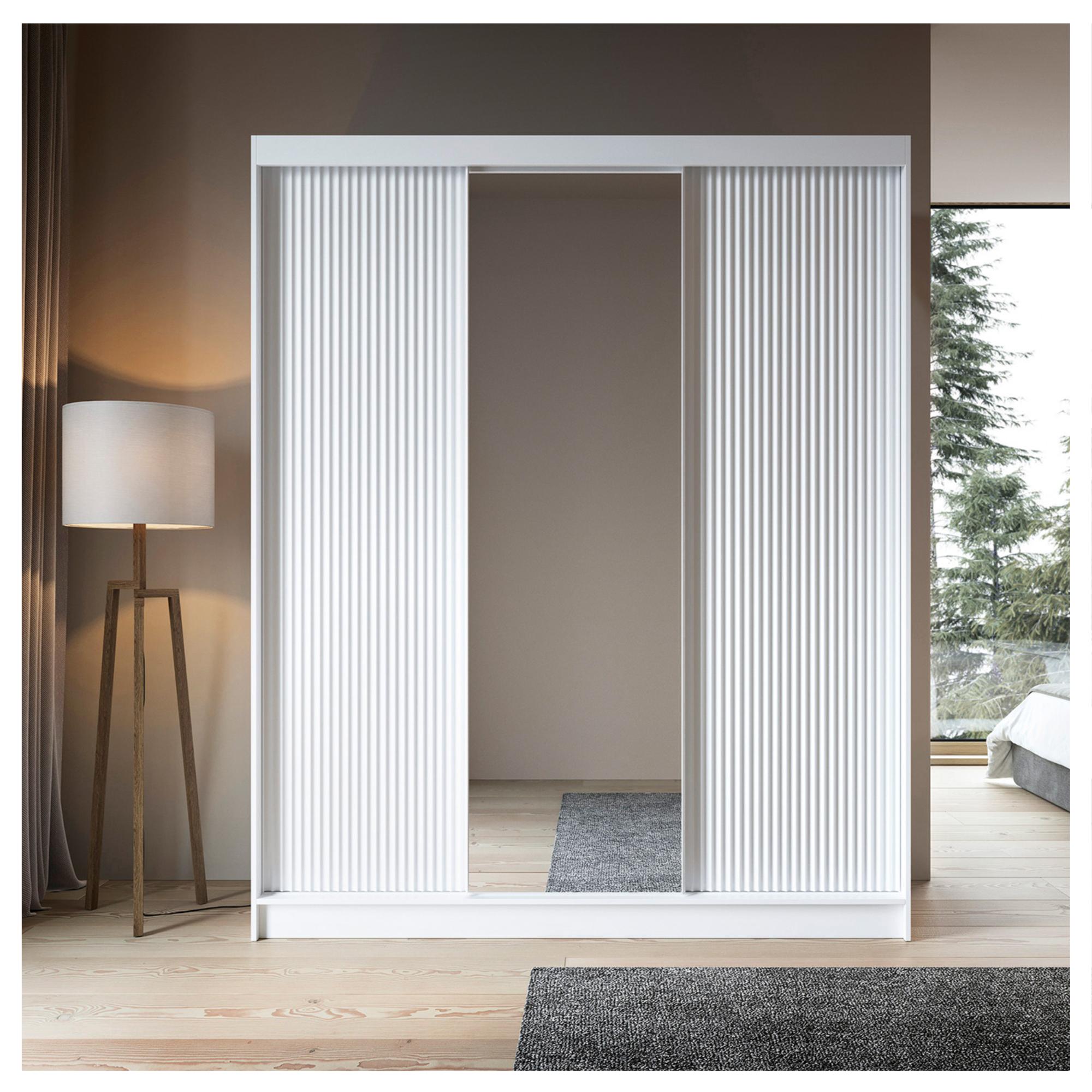 Skriňu uzatvárajú posuvné dvere, ktoré šetria cenný priestor zvonku aj vo vnútri skrine. Dizajnový povrch bočných dverí ozvláštňuje inak minimalistický vzhľad celku. Prepojený priestor za 2 dverami na ľavej strane je vybavený šatníkovou tyčou a vloženou policou nad ňou, zatiaľ čo na pravej strane sa nachádza 5 vložených políc. Súčasťou skrine je aj praktické zrkadlo, ktoré presvetlí a opticky zväčší interiér. Korpus je vyrobený z MDF dosiek, ktoré sú doplnené o ABS hrany chrániace pred mechanickým poškodením.