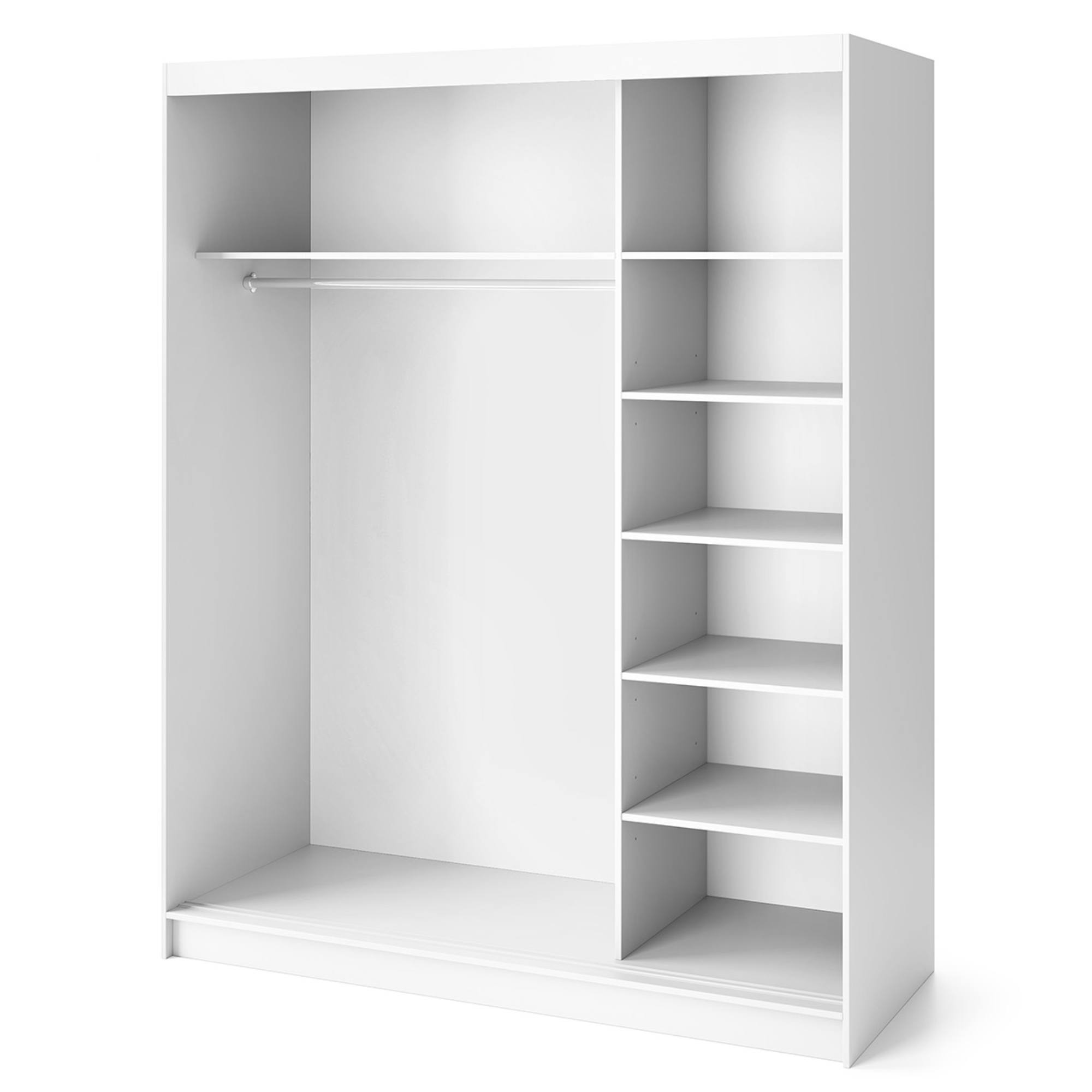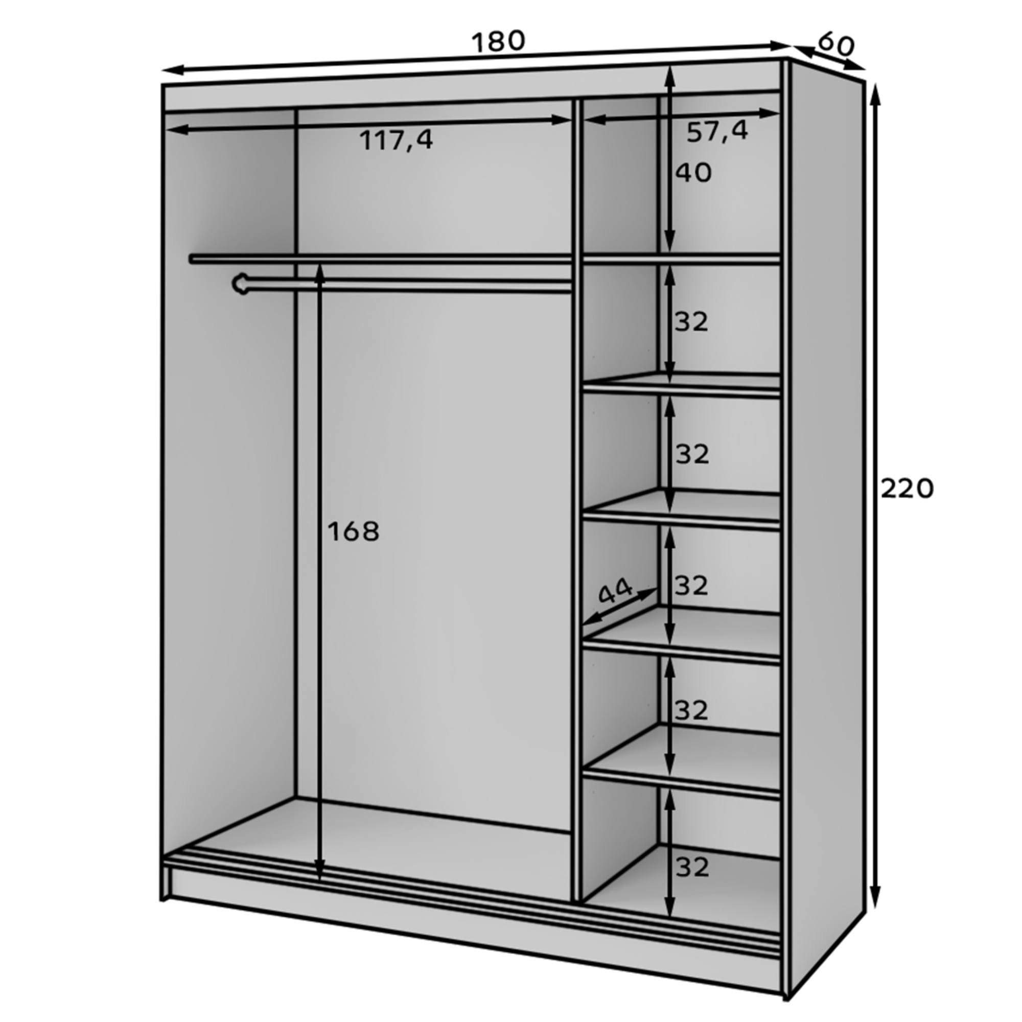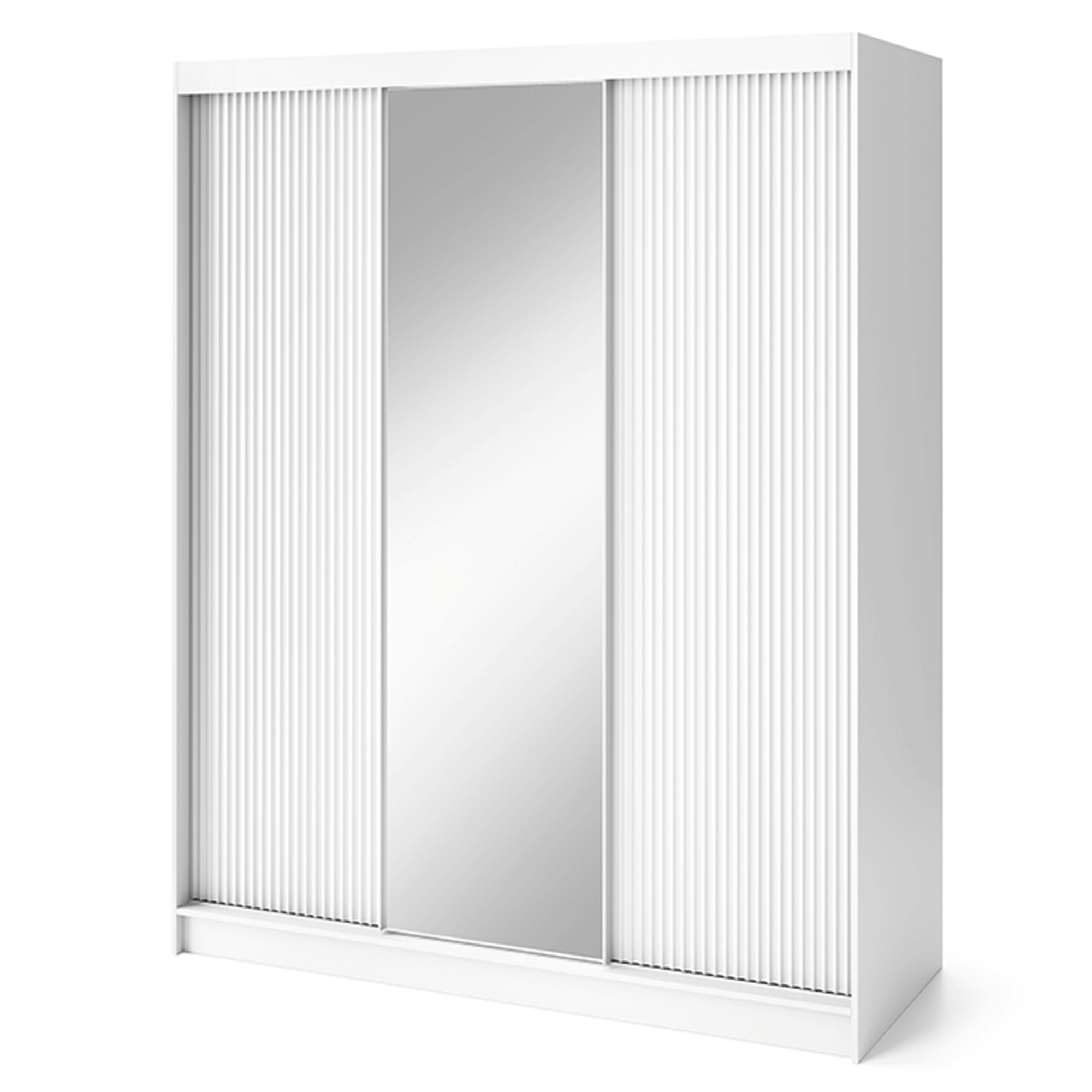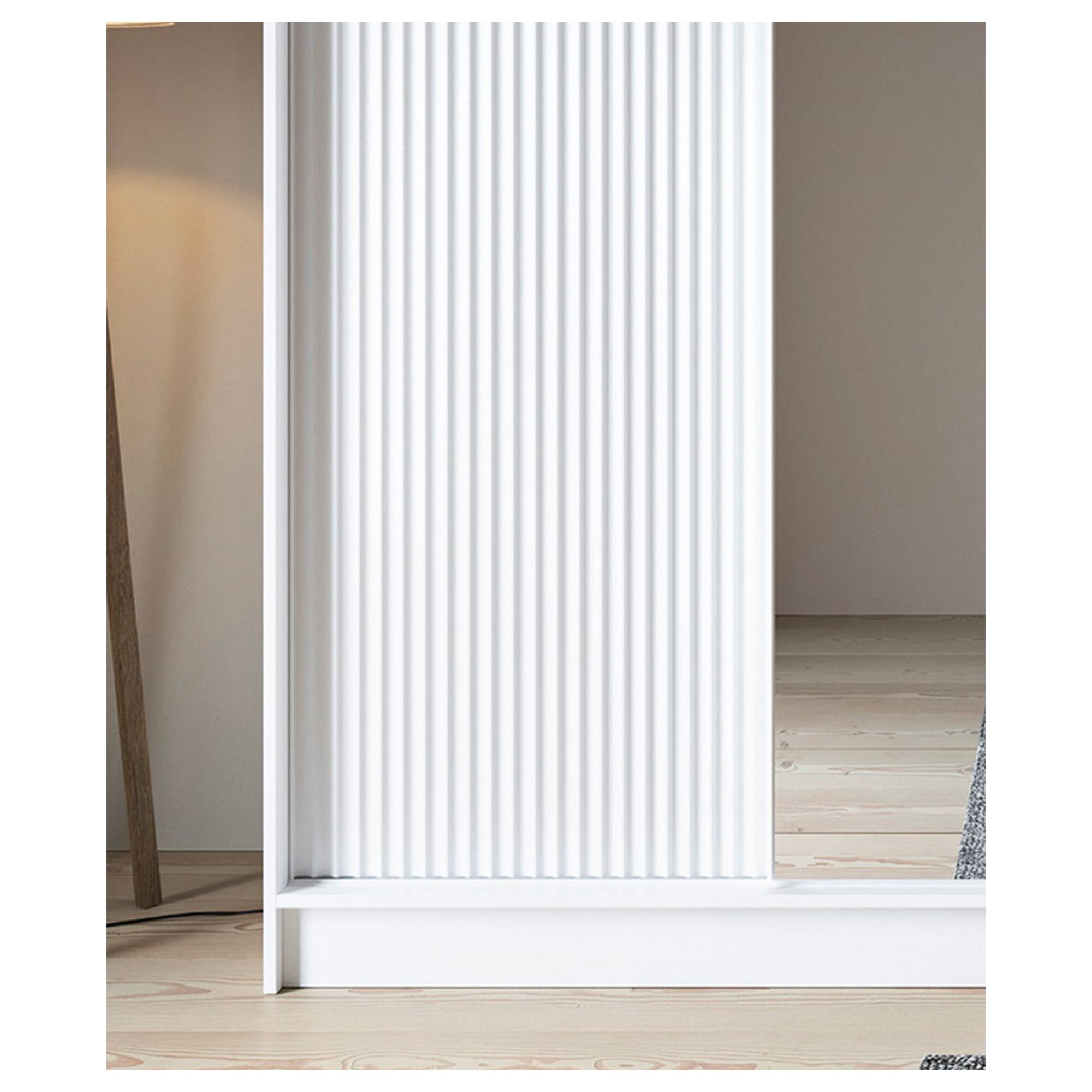 Skriňu uzatvárajú posuvné dvere, ktoré šetria cenný priestor zvonku aj vo vnútri skrine. Dizajnový povrch bočných dverí ozvláštňuje inak minimalistický vzhľad celku. Prepojený priestor za 2 dverami na ľavej strane je vybavený šatníkovou tyčou a vloženou policou nad ňou, zatiaľ čo na pravej strane sa nachádza 5 vložených políc. Súčasťou skrine je aj praktické zrkadlo, ktoré presvetlí a opticky zväčší interiér. Korpus je vyrobený z MDF dosiek, ktoré sú doplnené o ABS hrany chrániace pred mechanickým poškodením.