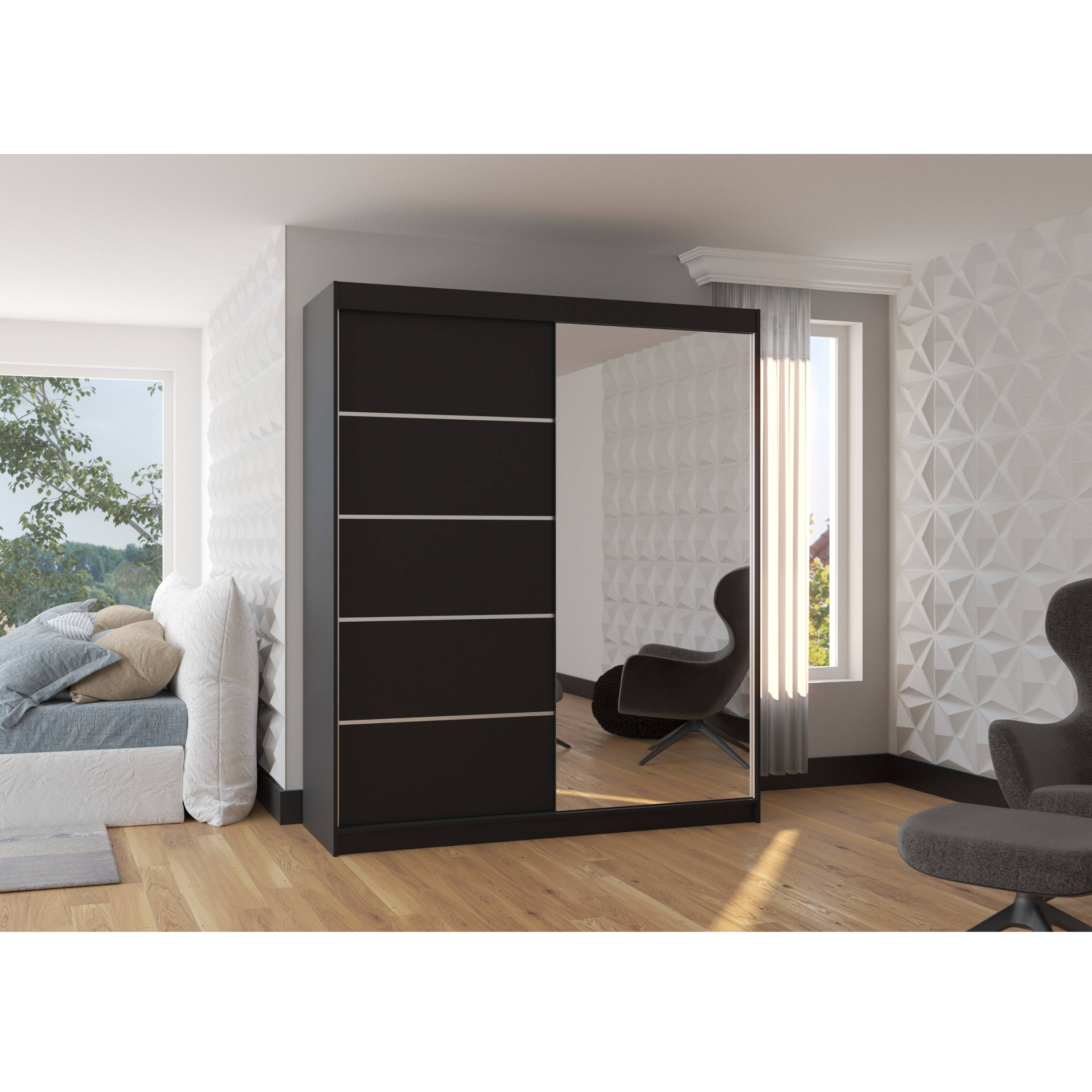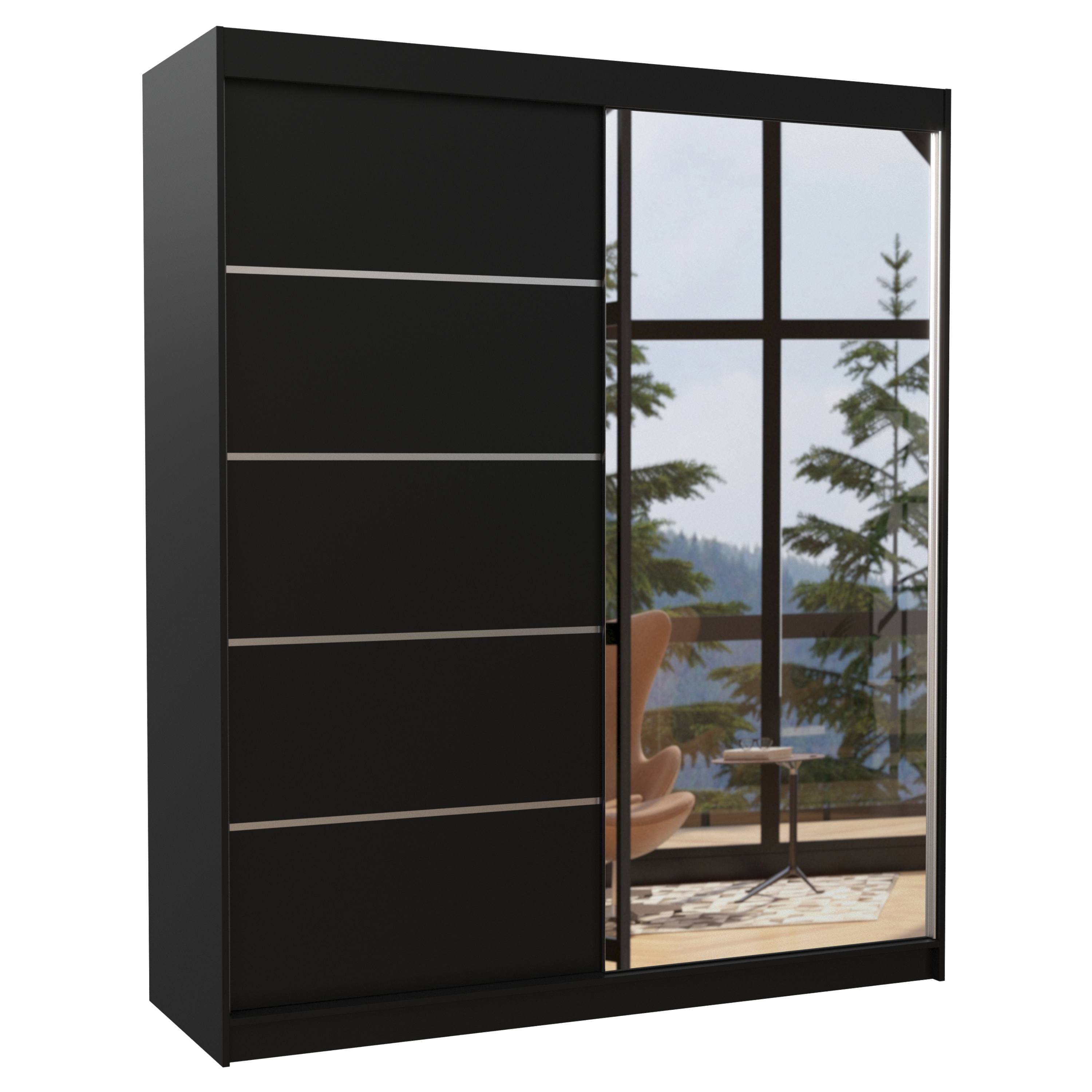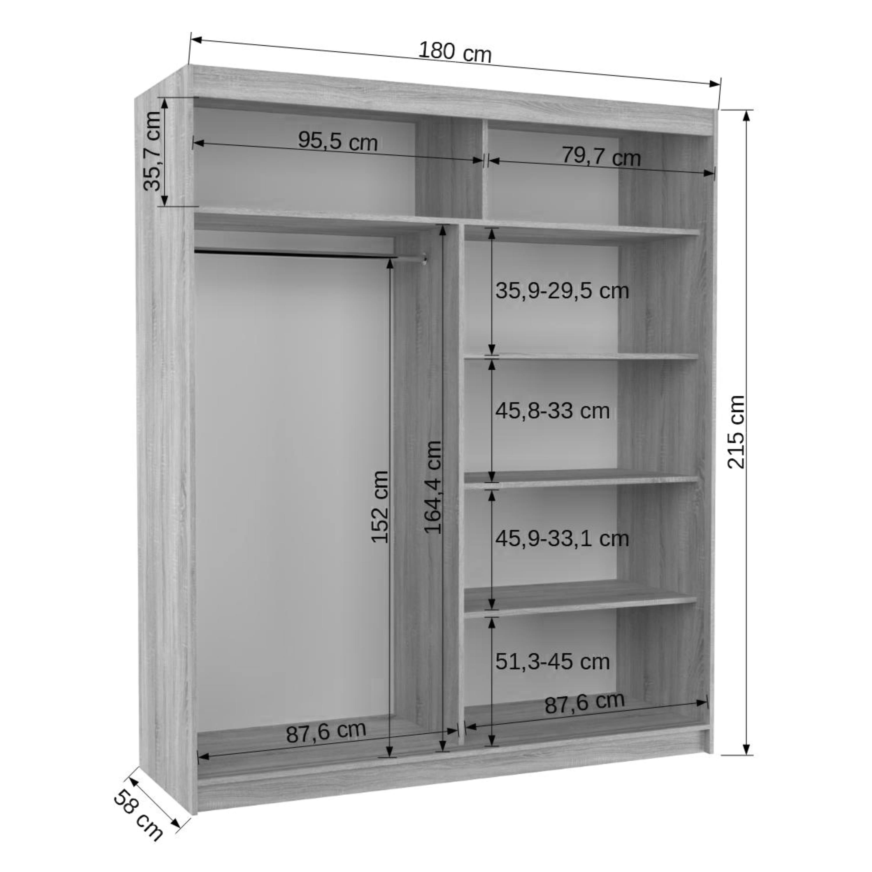 Skriňa je vybavená párom posuvných dverí, ktoré sa neotvárajú do priestoru, a tak šetria množstvo cenného miesta vo vnútri aj mimo skriňu. Súčasťou jedných dverí je aj praktické zrkadlo, vďaka ktorému si môžete kedykoľvek upraviť svoj vzhľad. Pravá časť skrine je vybavená 4 policami na prehľadné uloženie poskladaného oblečenia, zatiaľ čo na pravej strane sa nachádza 1 ďalšia polica a pod ňou šatníková tyč, ktorá je ideálna na zavesenie objemných alebo krčivých odevov.