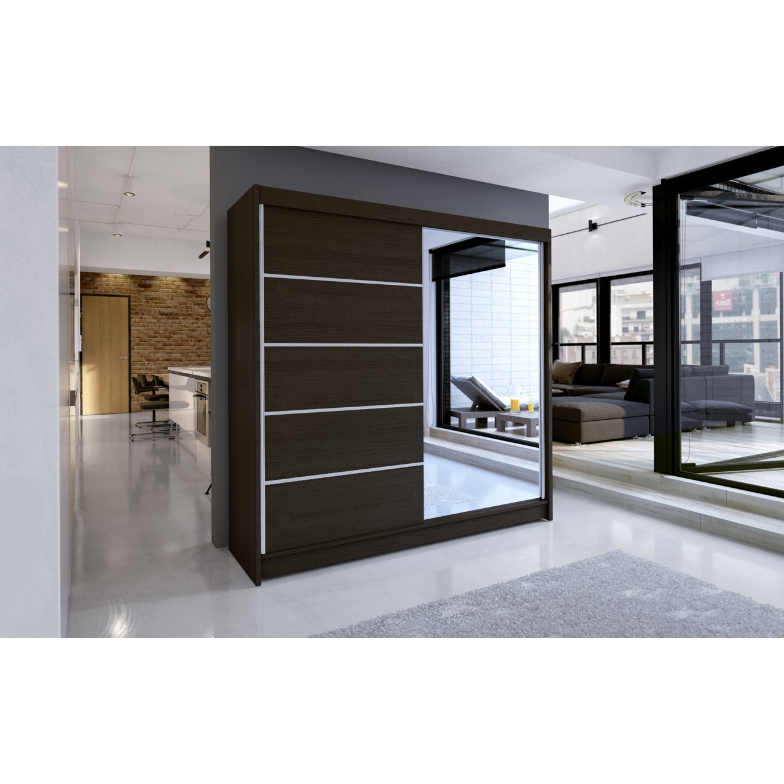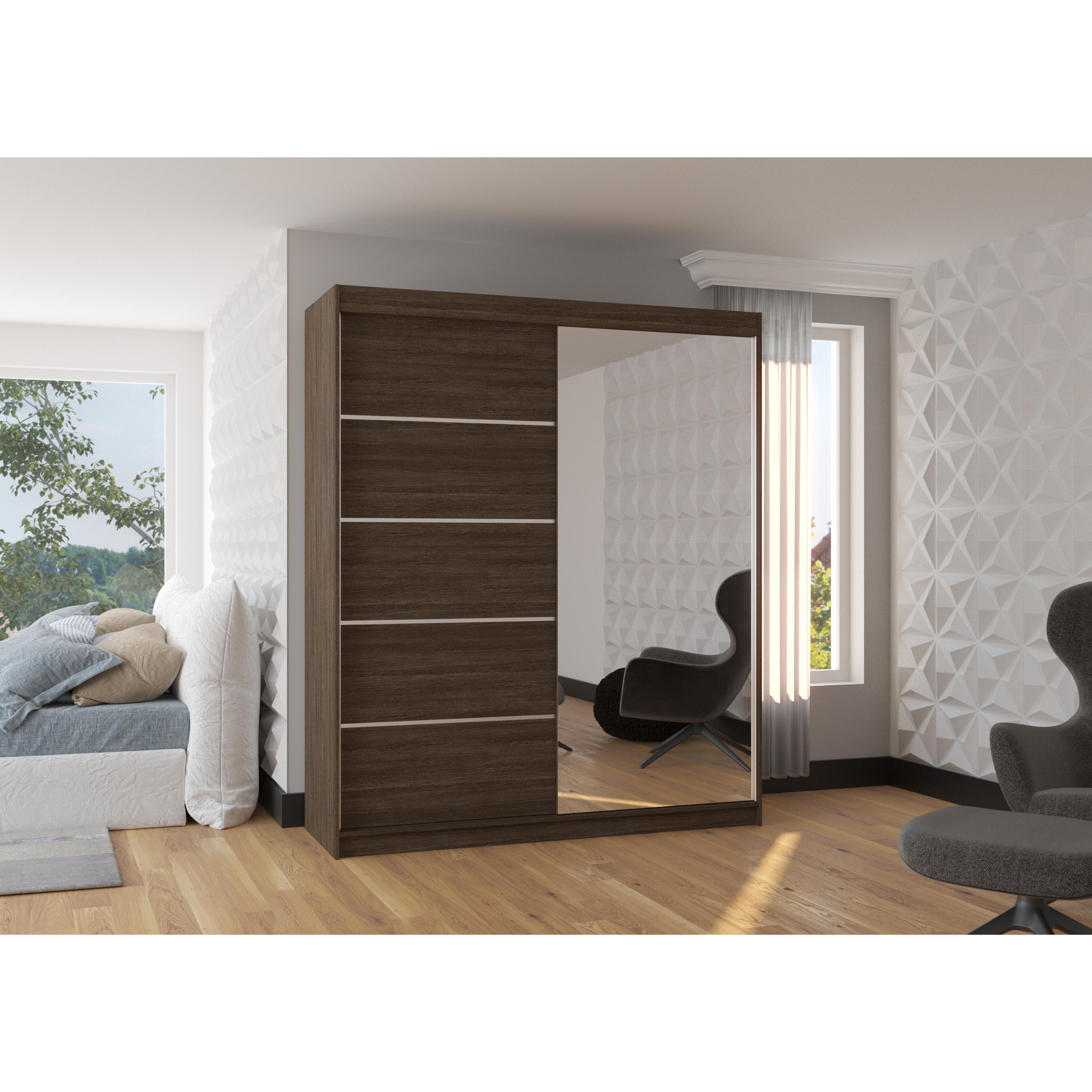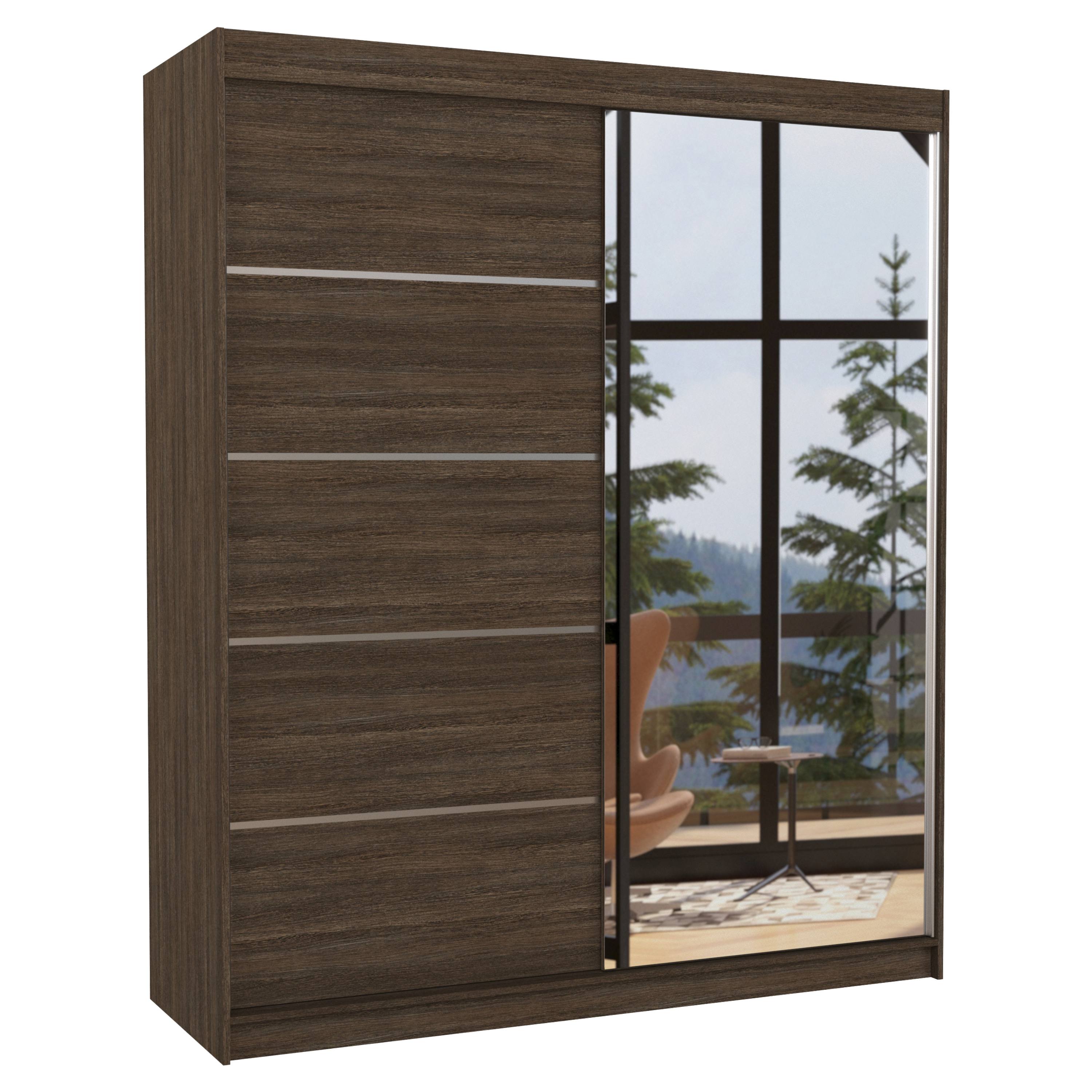 Skriňa je vybavená párom posuvných dverí, ktoré sa neotvárajú do priestoru, a tak šetria množstvo cenného miesta vo vnútri aj mimo skriňu. Súčasťou jedných dverí je aj praktické zrkadlo, vďaka ktorému si môžete kedykoľvek upraviť svoj vzhľad. Pravá časť skrine je vybavená 4 policami na prehľadné uloženie poskladaného oblečenia, zatiaľ čo na pravej strane sa nachádza 1 ďalšia polica a pod ňou šatníková tyč, ktorá je ideálna na zavesenie objemných alebo krčivých odevov.