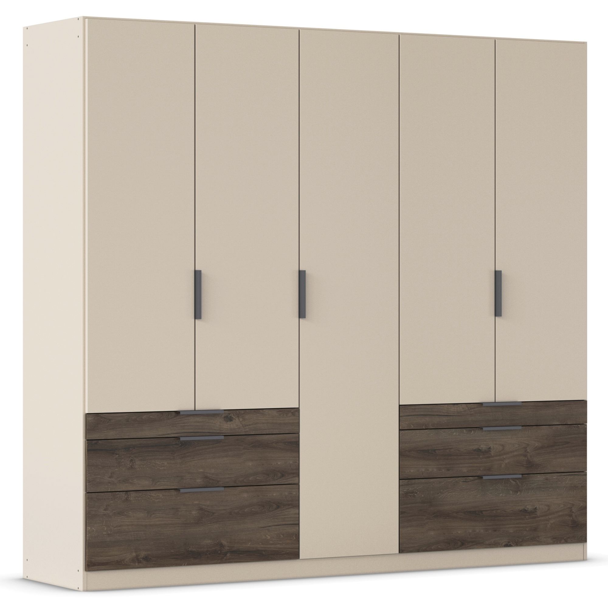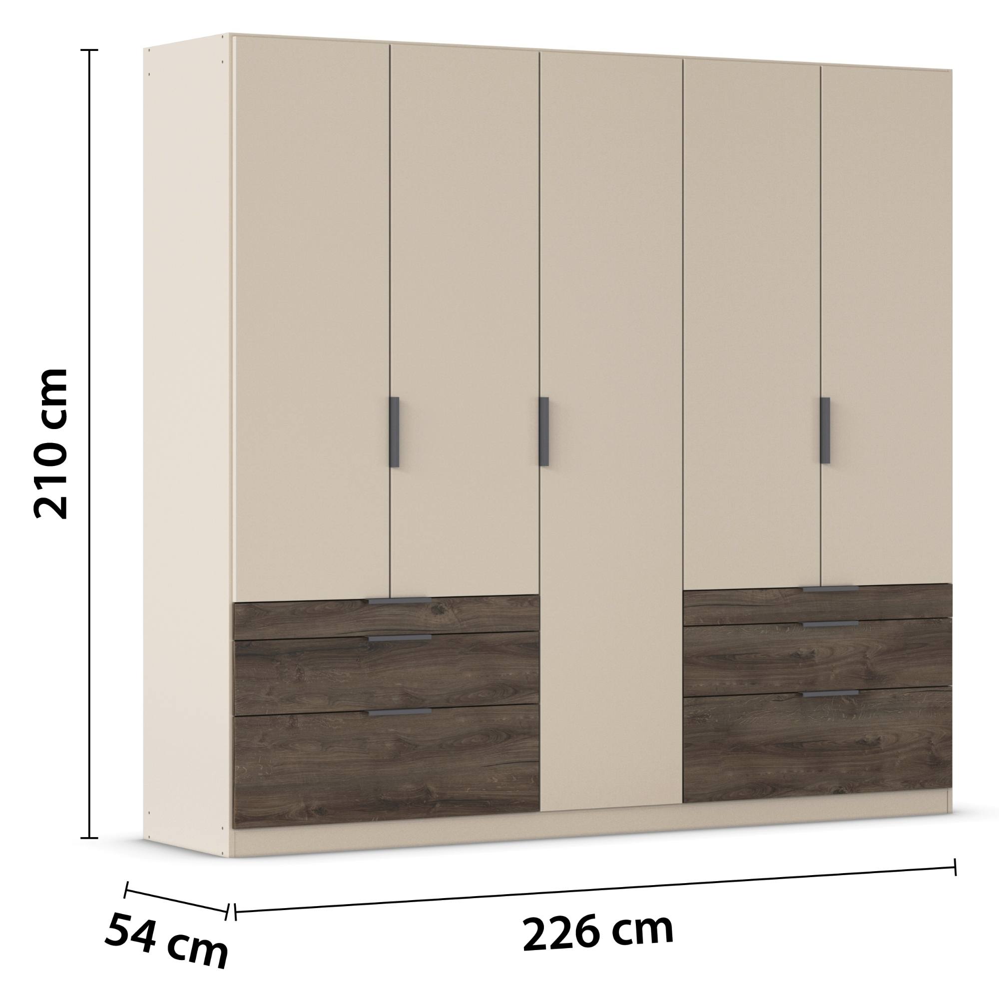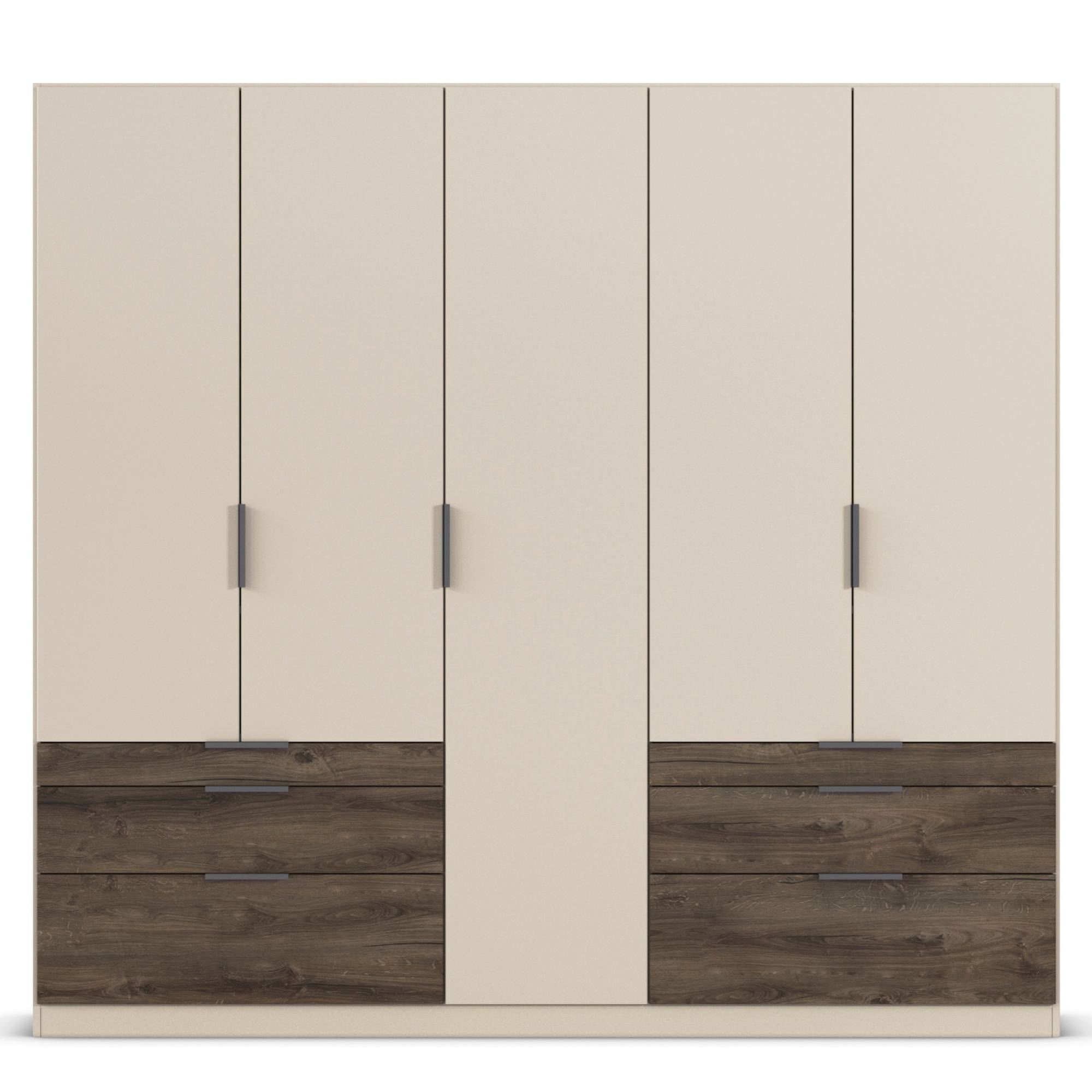 Skriňa je uzatvárateľná pomocou 5 otočných dverí, ktoré sú doplnené o rúčky na jednoduchšiu každodennú manipuláciu. Vnútorné vybavenie pozostáva celkom z 5 vložených políc a 3 šatníkových tyčí, ktoré si môžete voliteľne usporiadať. Využiť môžete tiež 6 priestranných zásuviek v spodnej časti konštrukcie. Skriňa je vyrobená z drevotriesky s povrchom nenáročným na údržbu.