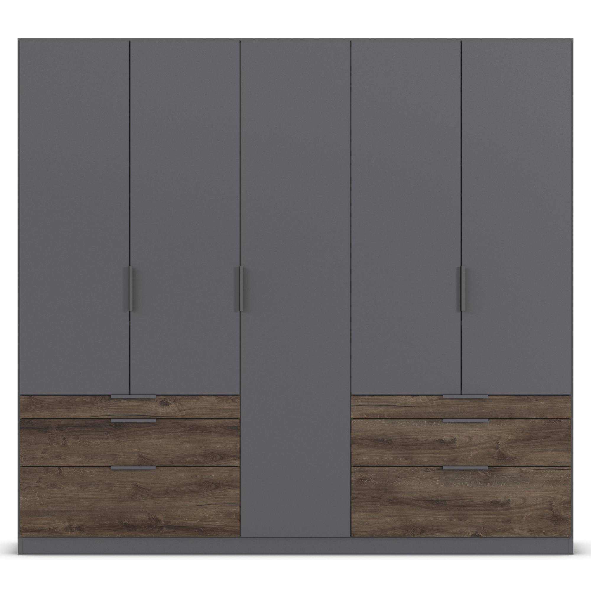 Skriňa je uzatvárateľná pomocou 5 otočných dverí, ktoré sú doplnené o rúčky na jednoduchšiu každodennú manipuláciu. Vnútorné vybavenie pozostáva celkom z 5 vložených políc a 3 šatníkových tyčí, ktoré si môžete voliteľne usporiadať. Využiť môžete tiež 6 priestranných zásuviek v spodnej časti konštrukcie. Skriňa je vyrobená z drevotriesky s povrchom nenáročným na údržbu.