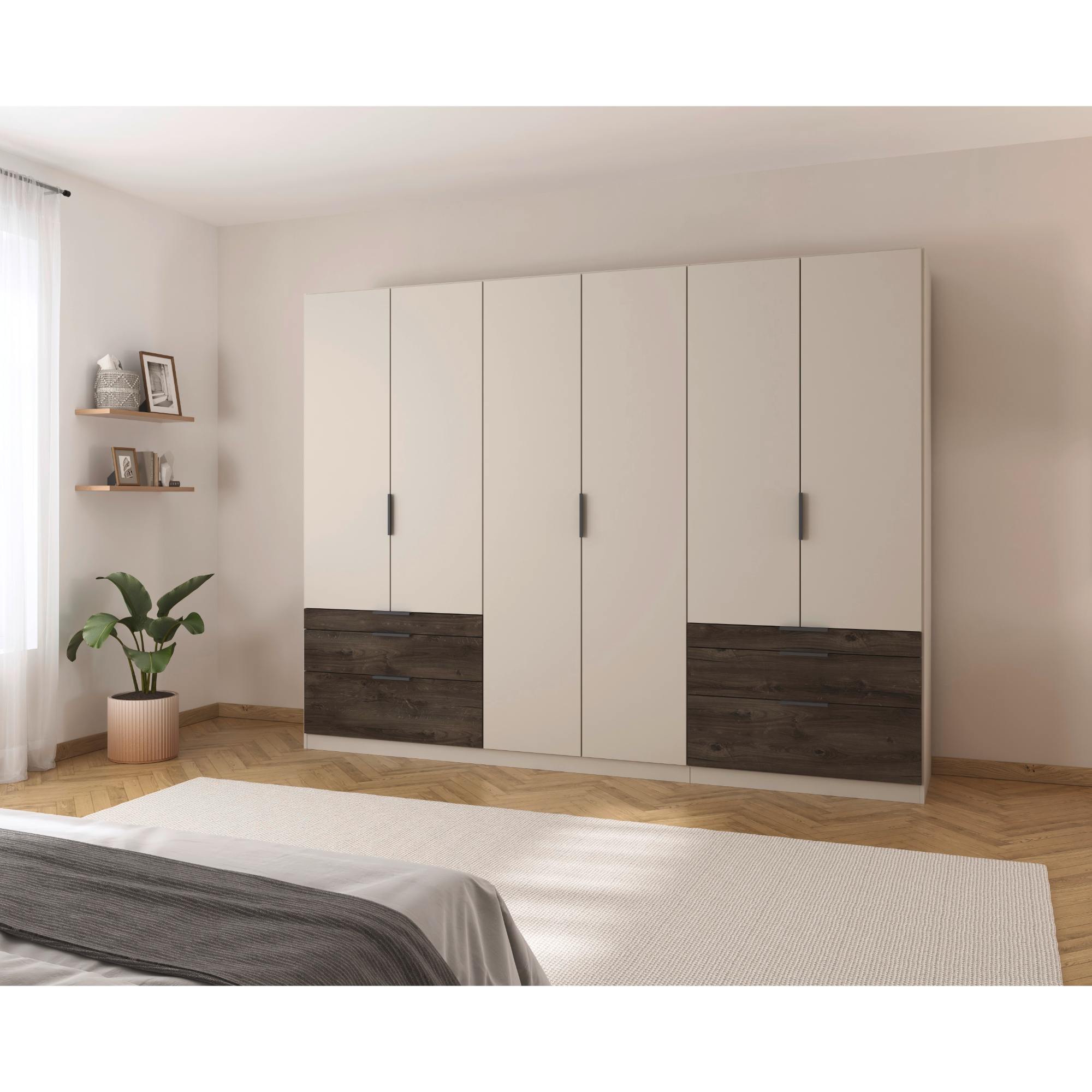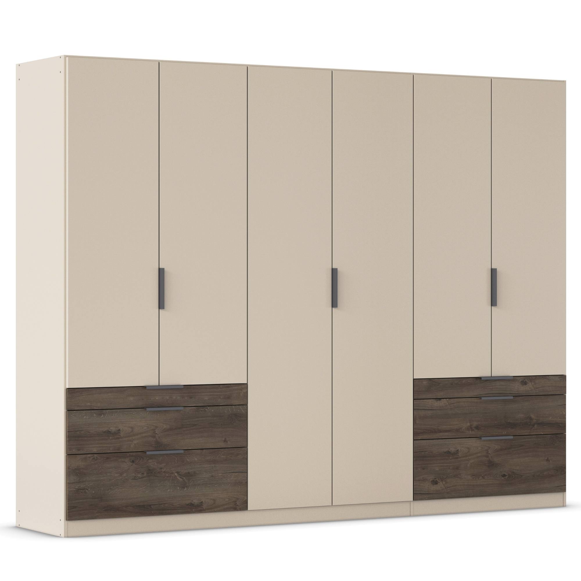 Skriňa je uzatvárateľná pomocou 6 otočných dverí, ktoré sú doplnené o rúčky na jednoduchšiu každodennú manipuláciu. Vnútorné vybavenie pozostáva celkom z 5 vložených políc a 3 šatníkových tyčí, ktoré si môžete voliteľne usporiadať. Využiť môžete tiež 6 priestranných zásuviek v spodnej časti konštrukcie. Skriňa je vyrobená z drevotriesky s povrchom nenáročným na údržbu.