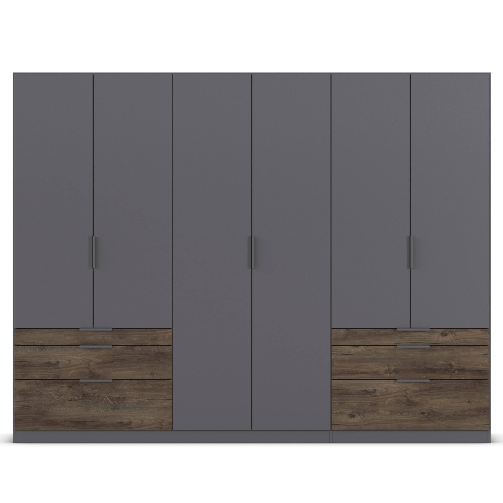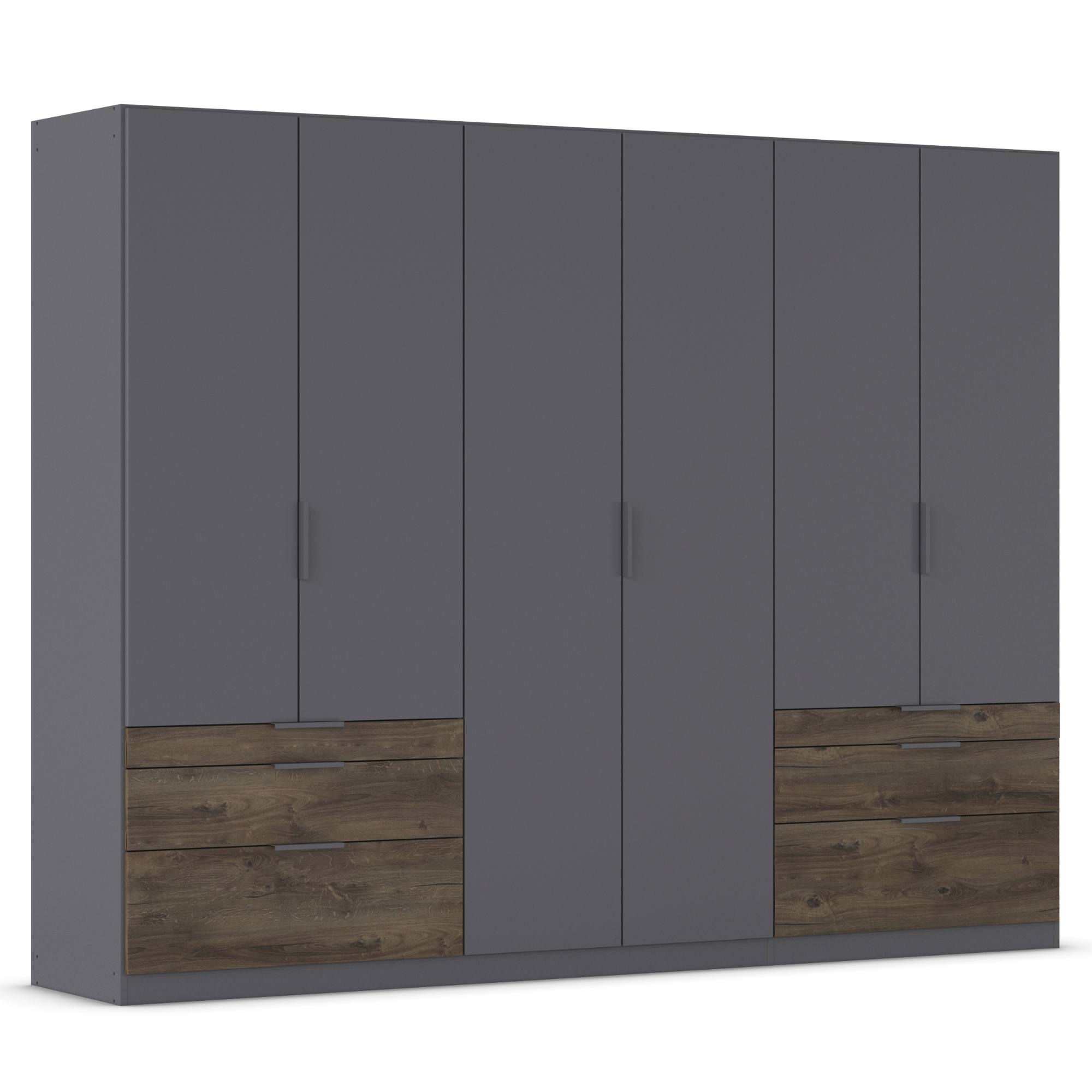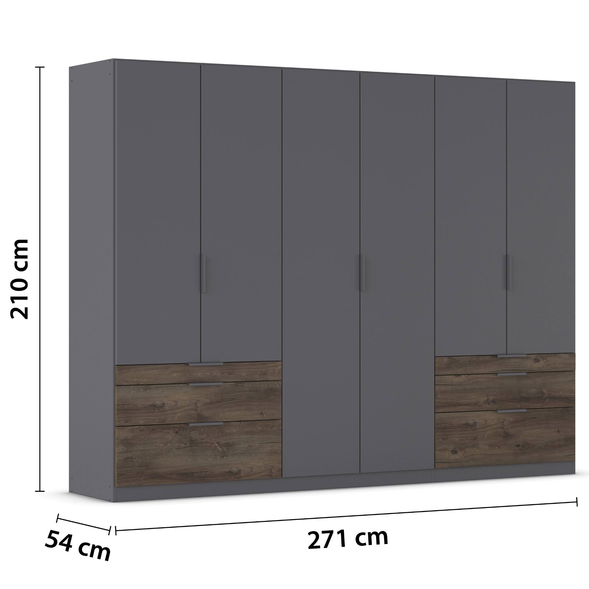 Skriňa je uzatvárateľná pomocou 6 otočných dverí, ktoré sú doplnené o rúčky na jednoduchšiu každodennú manipuláciu. Vnútorné vybavenie pozostáva celkom z 5 vložených políc a 3 šatníkových tyčí, ktoré si môžete voliteľne usporiadať. Využiť môžete tiež 6 priestranných zásuviek v spodnej časti konštrukcie. Skriňa je vyrobená z drevotriesky s povrchom nenáročným na údržbu.