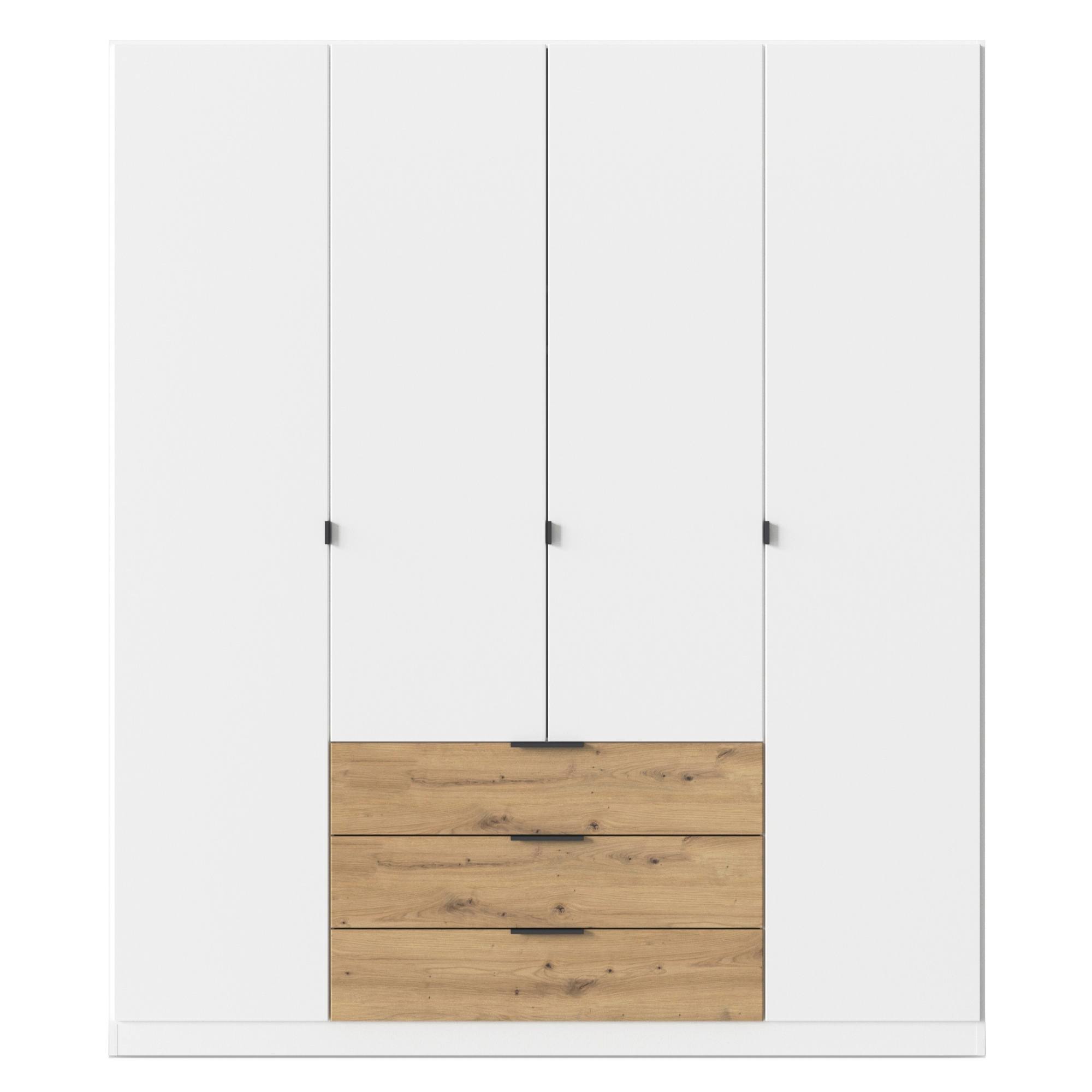 Konštrukcia je vybavená 4 otočnými dverami, ktoré za sebou ukrývajú prakticky riešený úložný priestor. Skriňa obsahuje celkom 3 šatníkové tyče a 3 vložené police na prehľadné skladovanie rôznych odevov. Doplnky, spodnú bielizeň a ďalšie drobné kúsky oblečenia môžete uložiť do 3 priestranných zásuviek. Všetky predné plochy sú doplnené o minimalistické rúčky na ľahkú každodennú manipuláciu. Skriňa je vyrobená z potlačenej ekologickej drevotriesky, ktorá má dlhú životnosť a nie je náročná na údržbu.