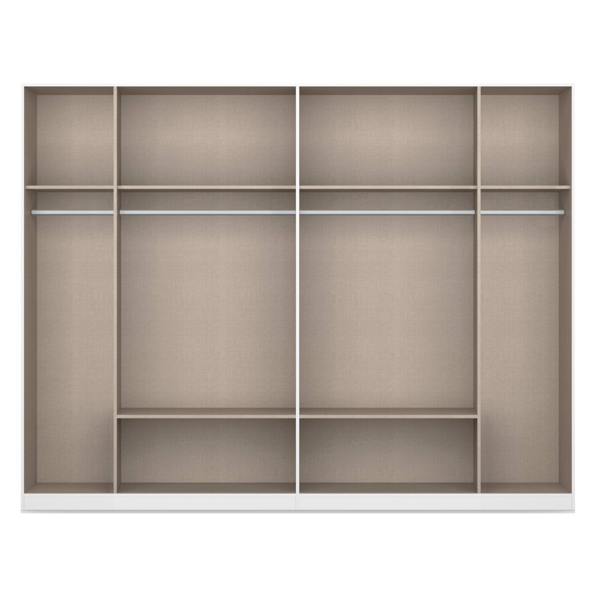 Skriňa je uzatvárateľná pomocou 6 otočných dverí, ktoré sa otvárajú do priestoru. Prakticky riešené vnútorné vybavenie pozostáva celkom zo 4 šatníkových tyčí a nad každou tyčou sa nachádza ešte 1 priestranná vložená polica, kam bez problémov uschováte lôžkoviny alebo aktuálne nevyužívané oblečenie. V neposlednom rade skriňa obsahuje 6 praktických zásuviek, ktoré sú ideálne na uskladnenie drobných predmetov a doplnkov, ako sú šperky, kravaty alebo ponožky. Všetky predné plochy sú vybavené minimalistickými rúčkami na ľahkú manipuláciu. Skriňa je vyrobená z potlačenej ekologickej drevotriesky nenáročnej na údržbu.