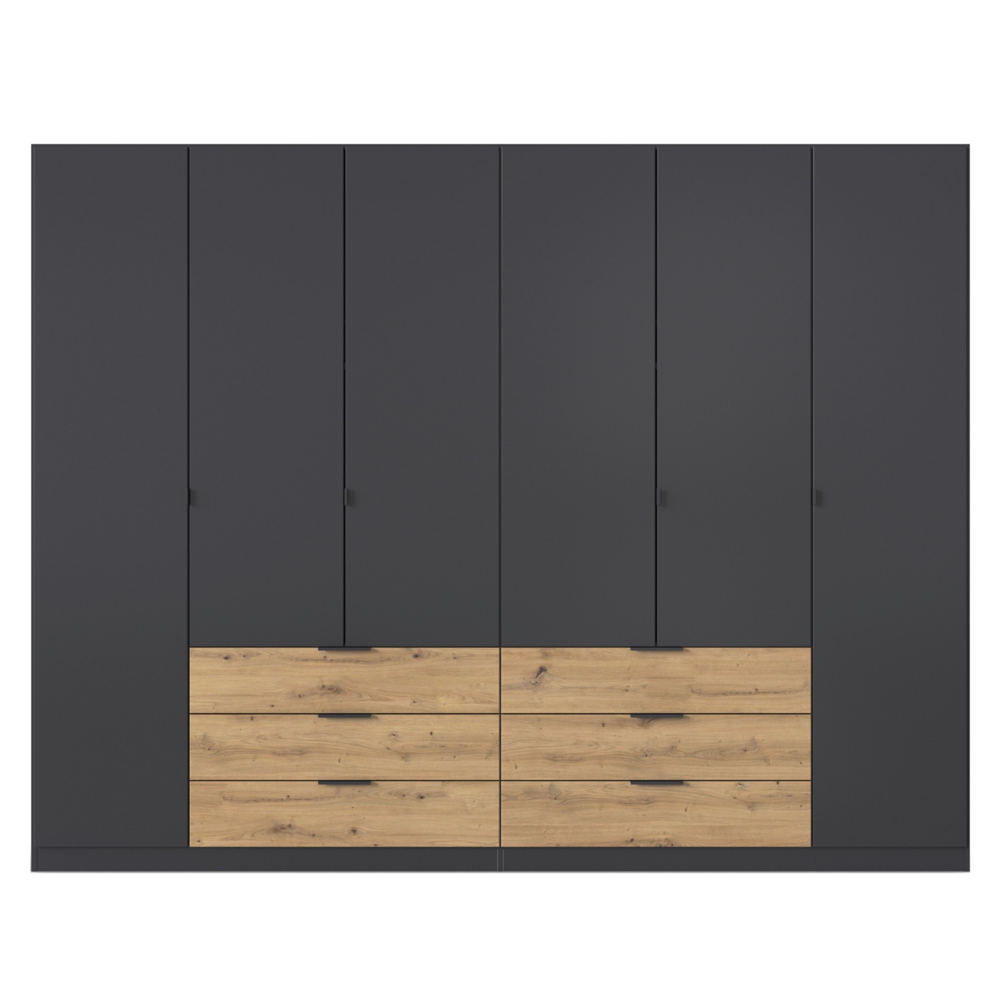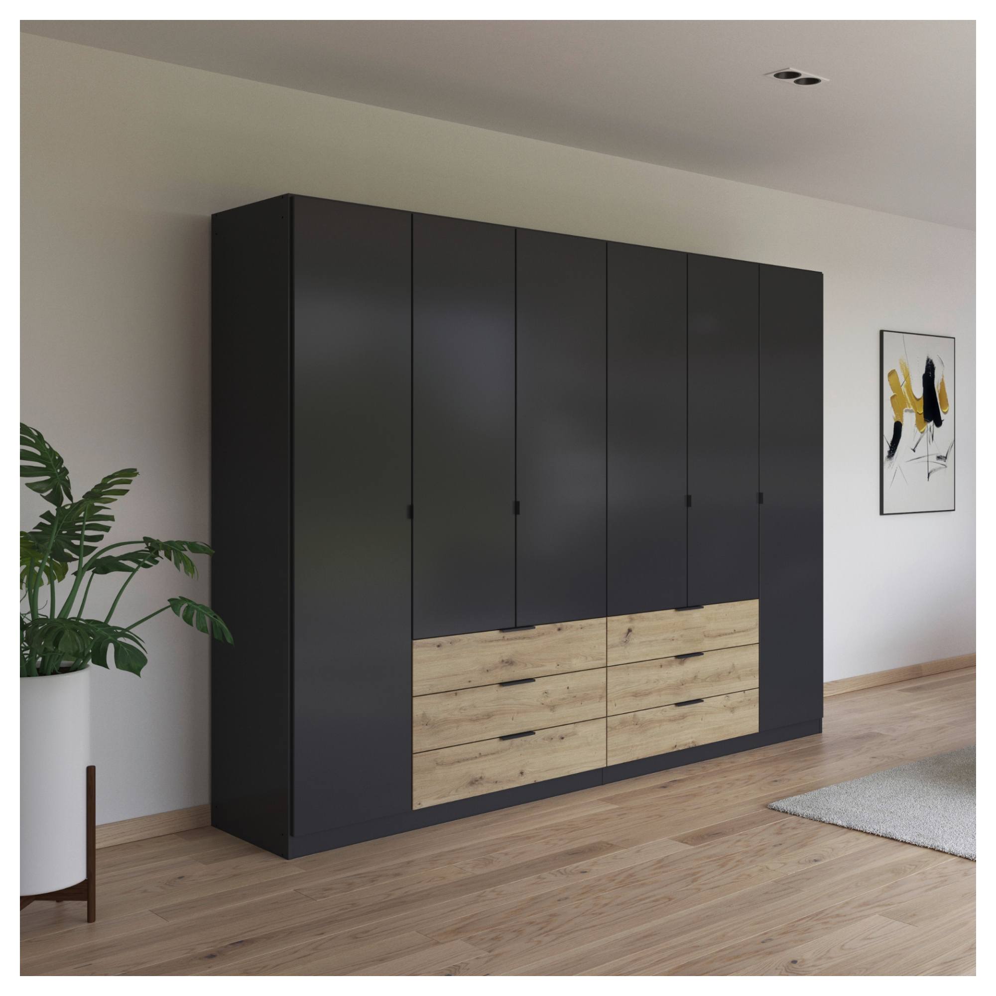 Skriňa je uzatvárateľná pomocou 6 otočných dverí, ktoré sa otvárajú do priestoru. Prakticky riešené vnútorné vybavenie pozostáva celkom zo 4 šatníkových tyčí a nad každou tyčou sa nachádza ešte 1 priestranná vložená polica, kam bez problémov uschováte lôžkoviny alebo aktuálne nevyužívané oblečenie. V neposlednom rade skriňa obsahuje 6 praktických zásuviek, ktoré sú ideálne na uskladnenie drobných predmetov a doplnkov, ako sú šperky, kravaty alebo ponožky. Všetky predné plochy sú vybavené minimalistickými rúčkami na ľahkú manipuláciu. Skriňa je vyrobená z potlačenej ekologickej drevotriesky nenáročnej na údržbu.