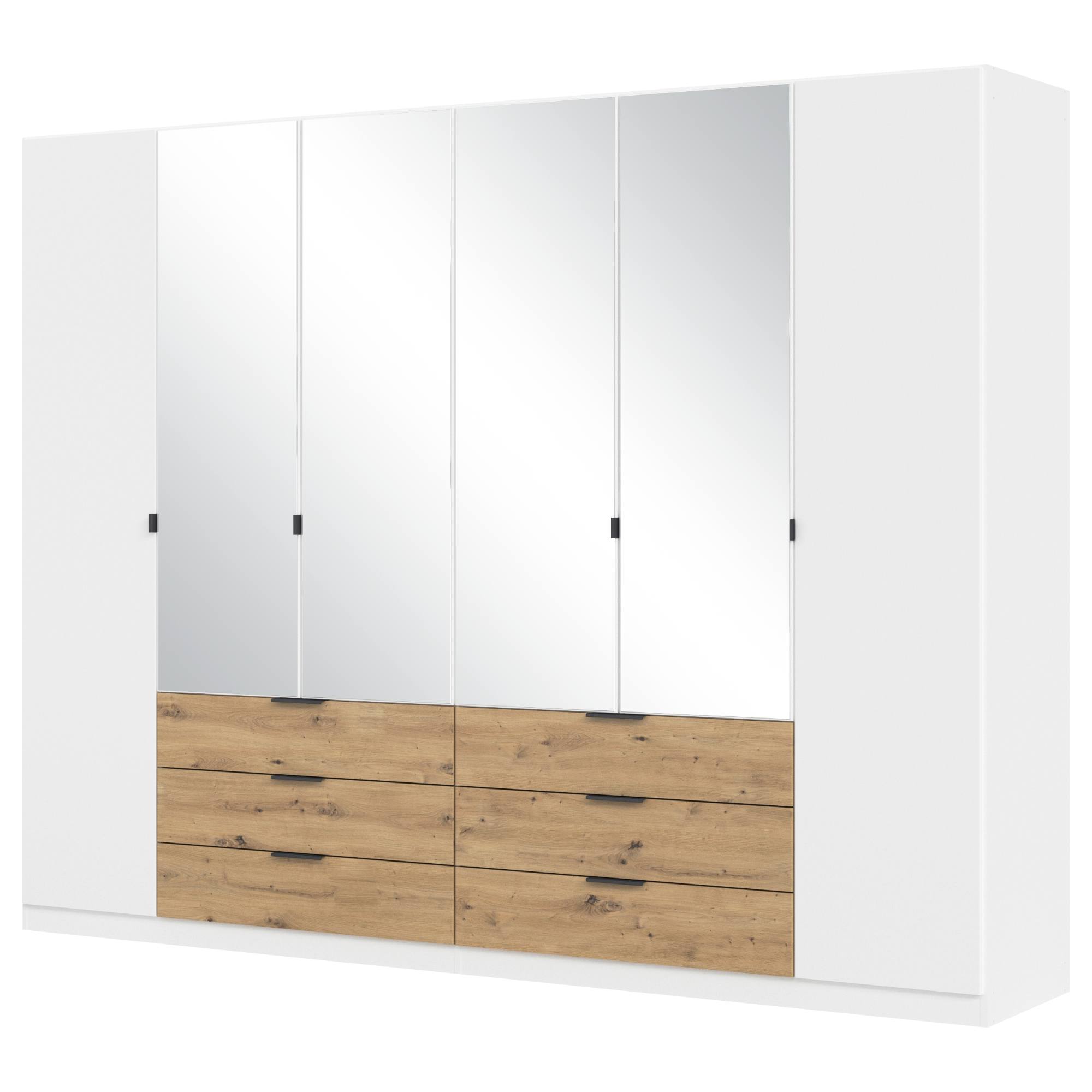 Šatníková skriňa disponuje 6 klasickými otočnými dverami z ktorých 4 sú zrkadlové a umožňujú vám, si kedykoľvek skontrolovať vzhľad. Zrkadlá tiež predstavujú jednoduchý spôsob ako opticky zväčšiť a presvetliť interiér. Za dverami sa nachádza priestranný členený vnútorný obsah zostavený z celkom 4 vložených políc a 4 šatníkových tyčí. V dolnej časti skriňa obsahuje ešte 6 priestranných zásuviek na doplnky a drobné kusy oblečenia ako sú kravaty, spodnú bielizeň či šperky. Minimalistické rúčky uľahčujú otváranie jednotlivých častí skrine. Vyrobená je z potlačenej ekologickej drevotriesky nenáročnej na údržbu.