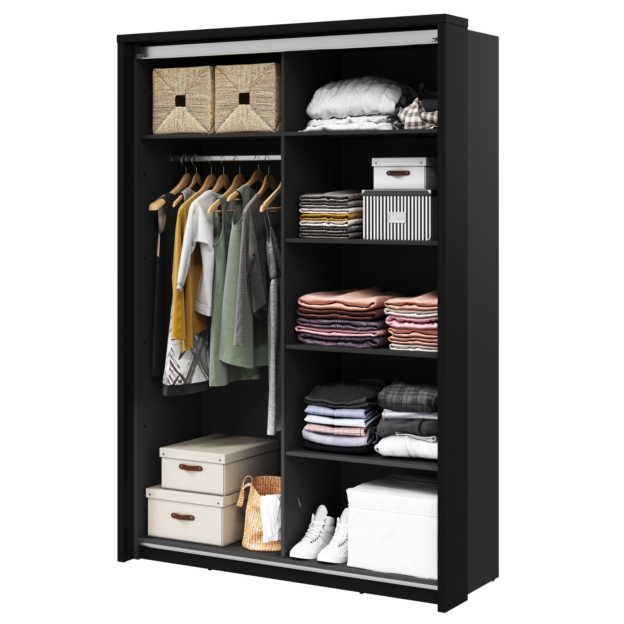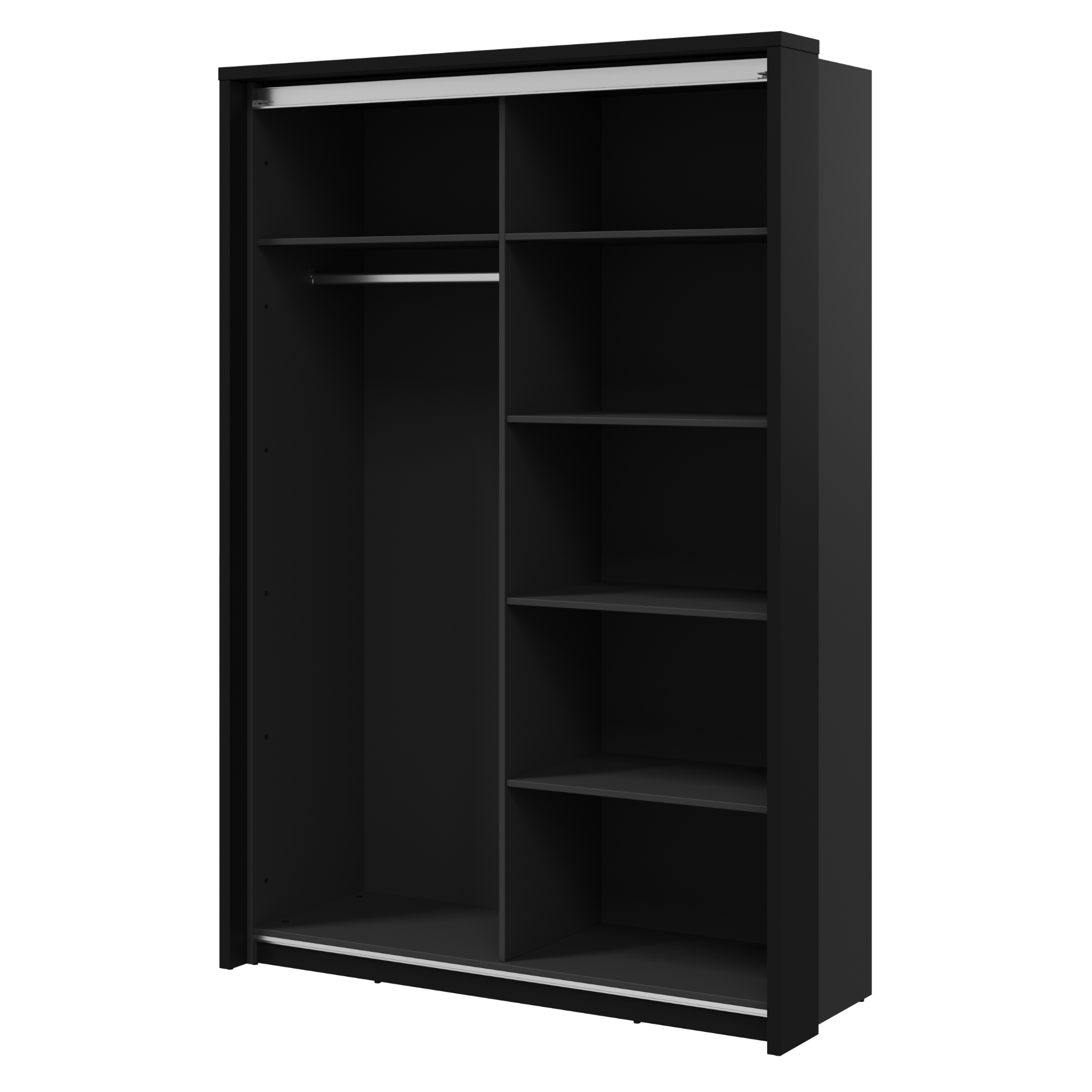 Za posuvnými dverami nájdete 5 políc, 2 šatníkové tyče a miesto na obuv v spodnej časti skrine. Efektívne usporiadanie interiéru skrine umožňuje prehľadné uloženie všetkého vášho oblečenia. Manipuláciu s dverami uľahčujú kovové lišty na bokoch skrine. Nábytok je vyrobený z odolného laminovaného materiálu ktorého životnosť predlžujú ABS hrany, ktoré bránia vniknutiu vlhkosti do materiálu.