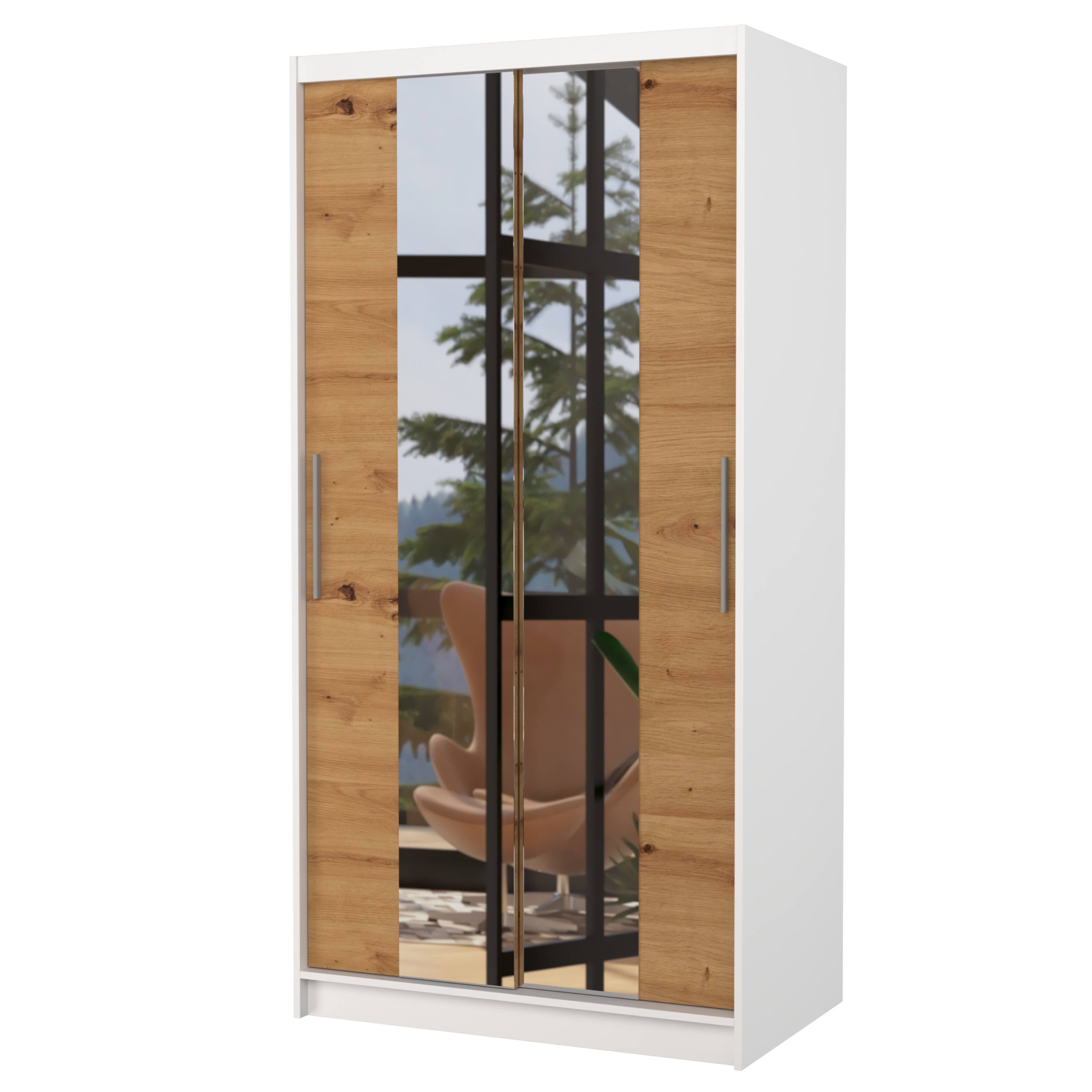 Skriňa je vybavená párom posuvných dverí, ktorých otváranie uľahčujú výrazné úchyty. Súčasťou dverí sú aj praktické zrkadlové plochy, vďaka ktorým si môžete kedykoľvek upraviť svoj vzhľad. Vnútorný priestor je vybavený celkom 4 policami na prehľadné uloženie poskladaného oblečenia alebo sezónnych doplnkov a tiež šatníkovou tyčou, ktorá je ideálna na zavesenie objemných alebo krčivých odevov. Skriňa je vyrobená z laminovaného dreveného materiálu doplneného o ABS hrany chrániace pred mechanickým poškodením. Vďaka svojej kompaktnej veľkosti je skvelou voľbou aj pre menšie interiéry.