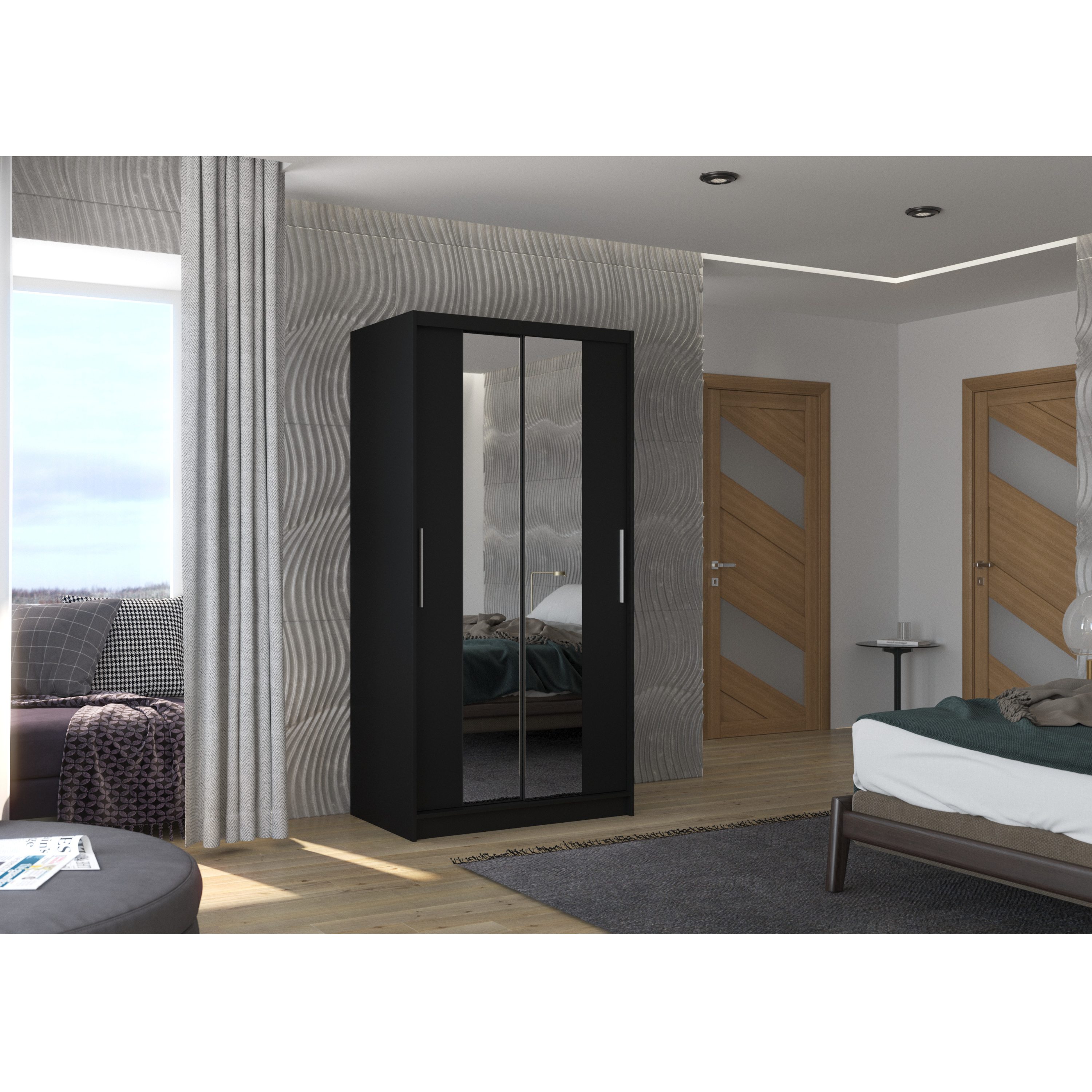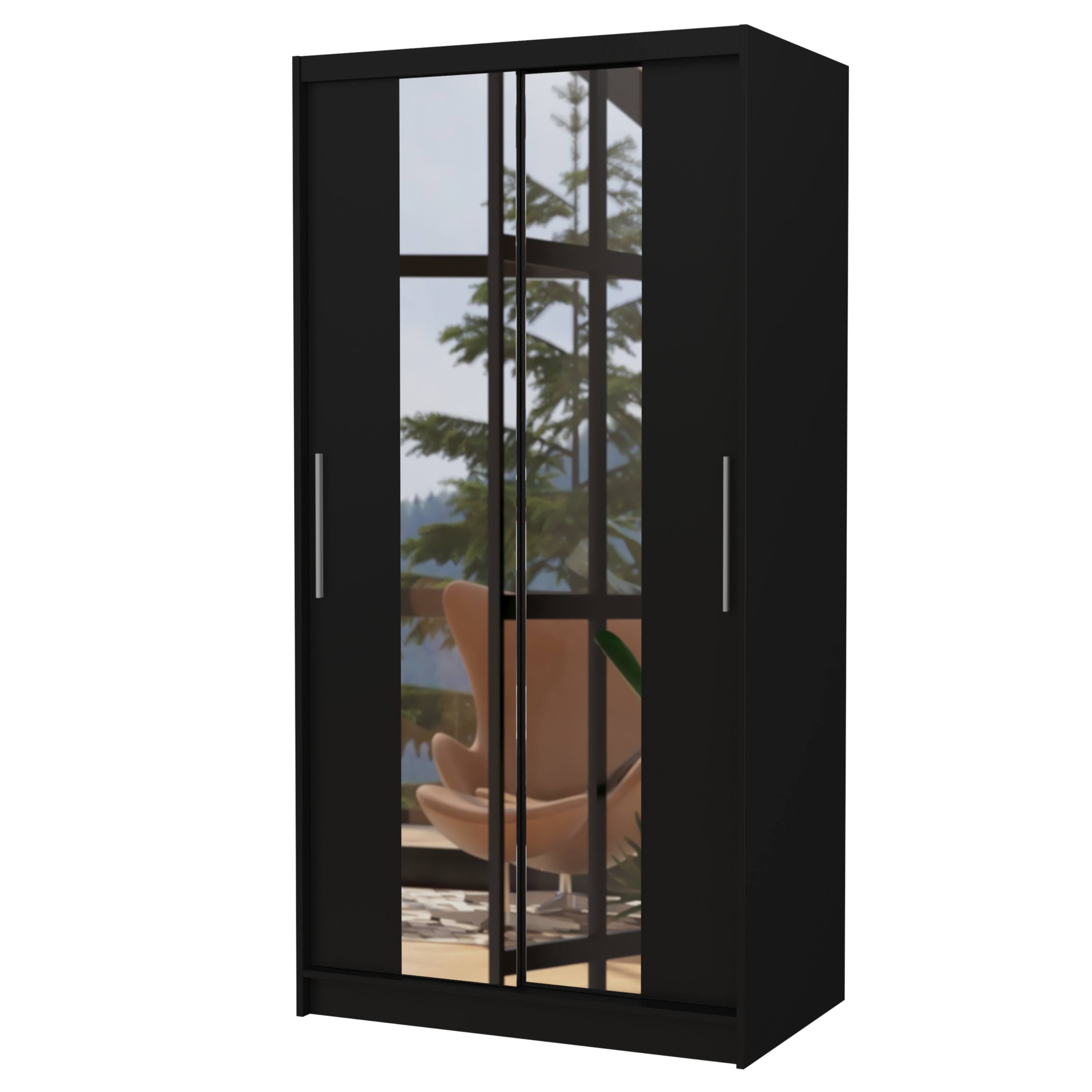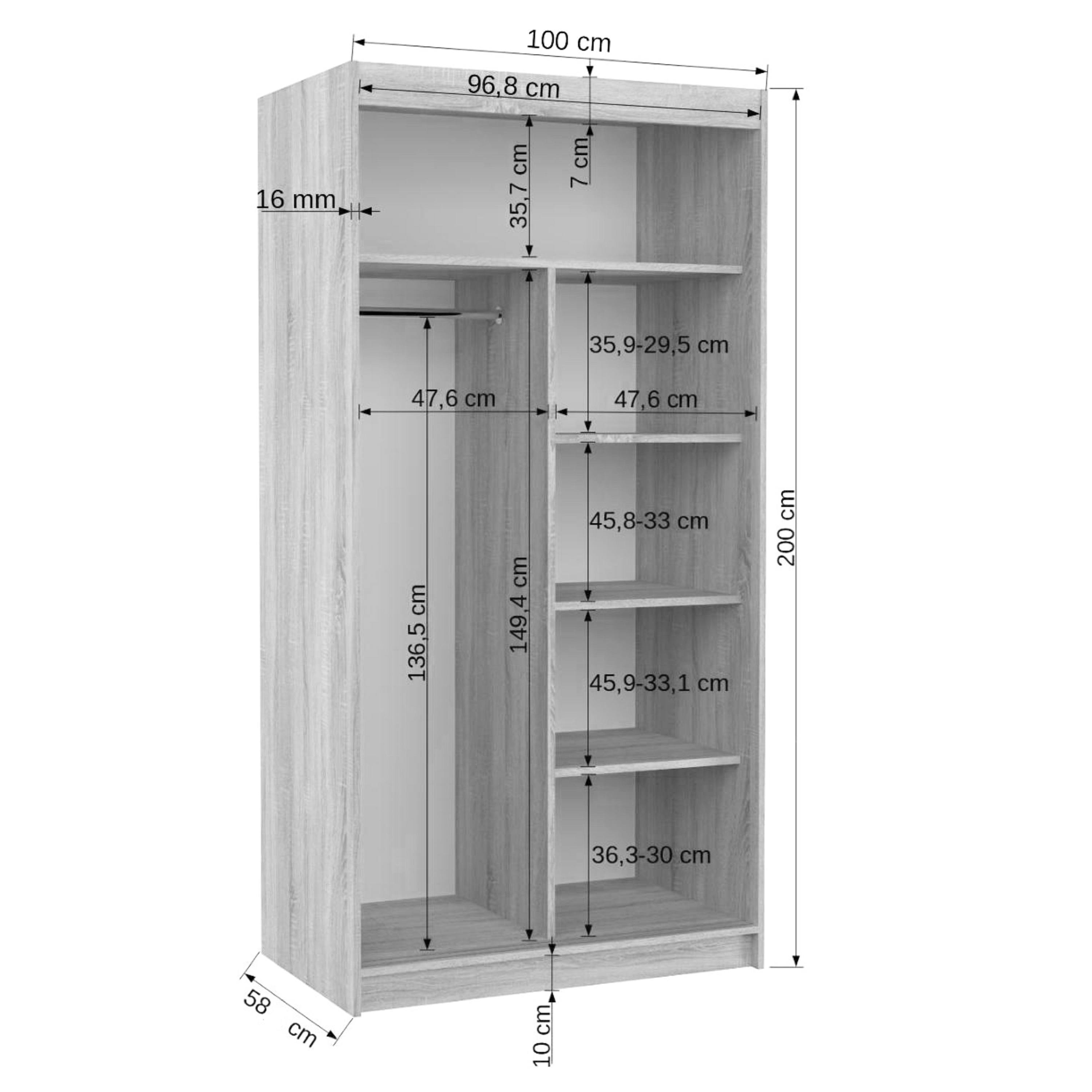 Skriňa je vybavená párom posuvných dverí, ktorých otváranie uľahčujú výrazné úchyty. Súčasťou dverí sú aj praktické zrkadlové plochy, vďaka ktorým si môžete kedykoľvek upraviť svoj vzhľad. Vnútorný priestor je vybavený celkom 4 policami na prehľadné uloženie poskladaného oblečenia alebo sezónnych doplnkov a tiež šatníkovou tyčou, ktorá je ideálna na zavesenie objemných alebo krčivých odevov. Skriňa je vyrobená z laminovaného dreveného materiálu doplneného o ABS hrany chrániace pred mechanickým poškodením. Vďaka svojej kompaktnej veľkosti je skvelou voľbou aj pre menšie interiéry.
