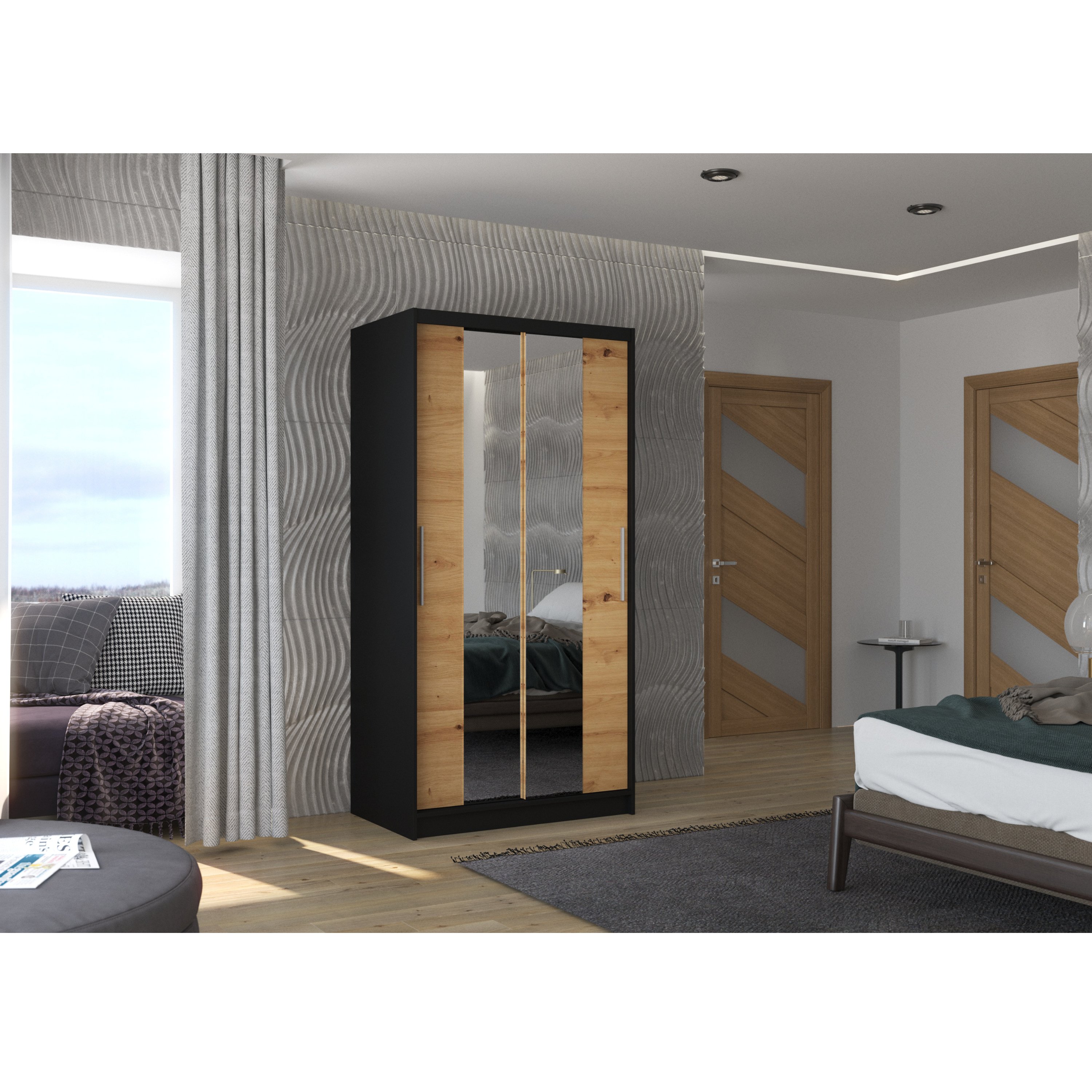 Skriňa je vybavená párom posuvných dverí, ktorých otváranie uľahčujú výrazné úchyty. Súčasťou dverí sú aj praktické zrkadlové plochy, vďaka ktorým si môžete kedykoľvek upraviť svoj vzhľad. Vnútorný priestor je vybavený celkom 4 policami na prehľadné uloženie poskladaného oblečenia alebo sezónnych doplnkov a tiež šatníkovou tyčou, ktorá je ideálna na zavesenie objemných alebo krčivých odevov. Skriňa je vyrobená z laminovaného dreveného materiálu doplneného o ABS hrany chrániace pred mechanickým poškodením. Vďaka svojej kompaktnej veľkosti je skvelou voľbou aj pre menšie interiéry.
