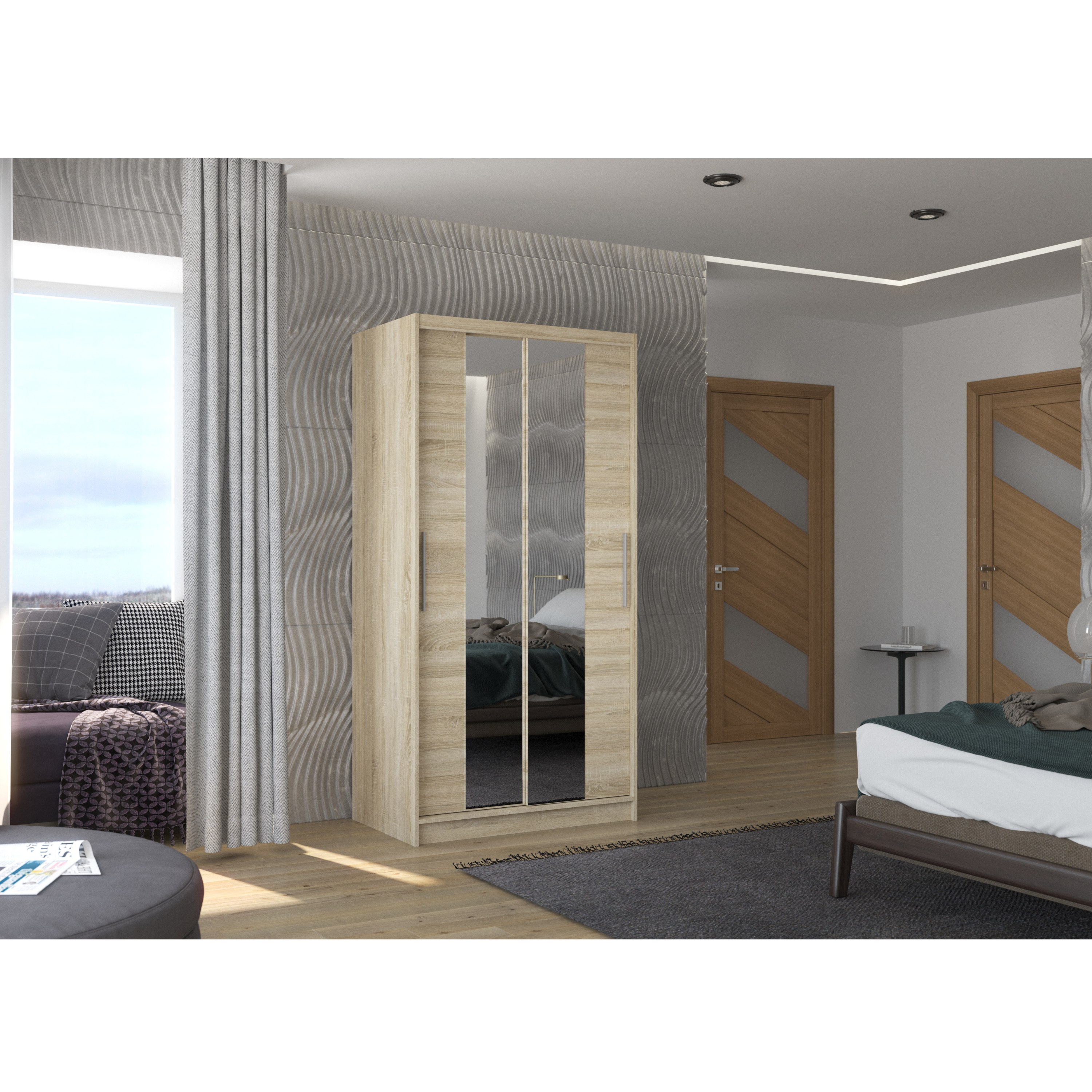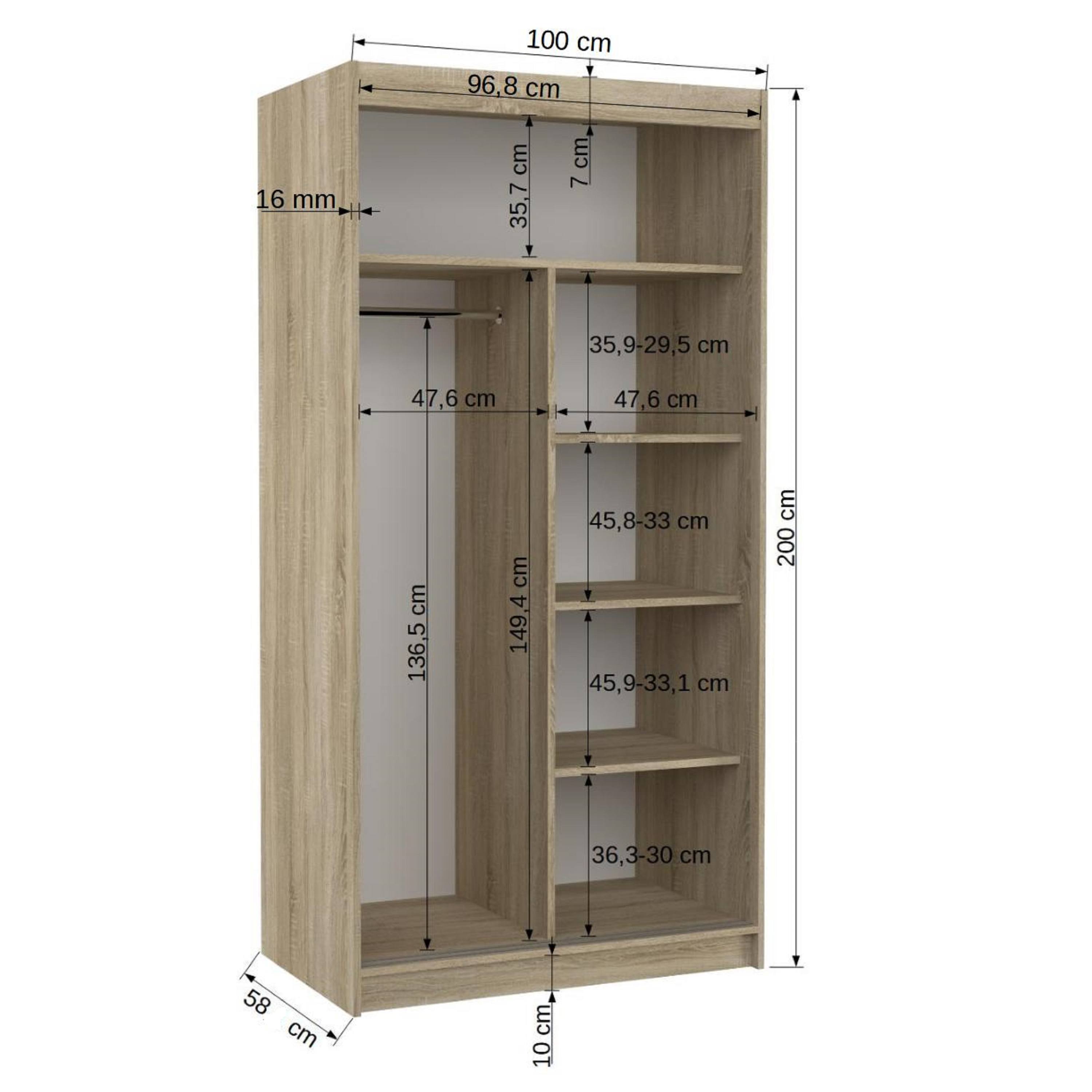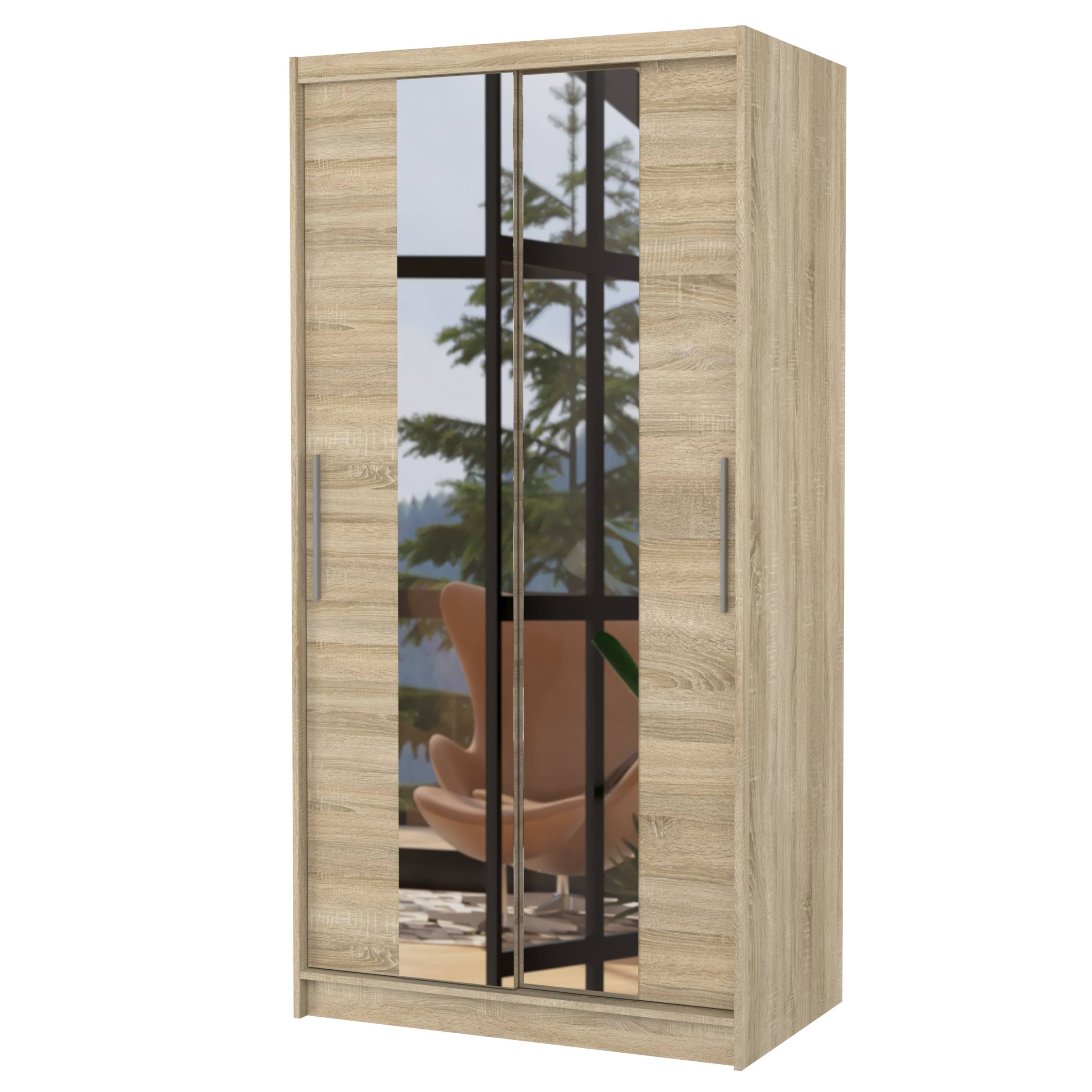 Skriňa je vybavená párom posuvných dverí, ktorých otváranie uľahčujú výrazné úchyty. Súčasťou dverí sú aj praktické zrkadlové plochy, vďaka ktorým si môžete kedykoľvek upraviť svoj vzhľad. Vnútorný priestor je vybavený celkom 4 policami na prehľadné uloženie poskladaného oblečenia alebo sezónnych doplnkov a tiež šatníkovou tyčou, ktorá je ideálna na zavesenie objemných alebo krčivých odevov. Skriňa je vyrobená z laminovaného dreveného materiálu doplneného o ABS hrany chrániace pred mechanickým poškodením. Vďaka svojej kompaktnej veľkosti je skvelou voľbou aj pre menšie interiéry.