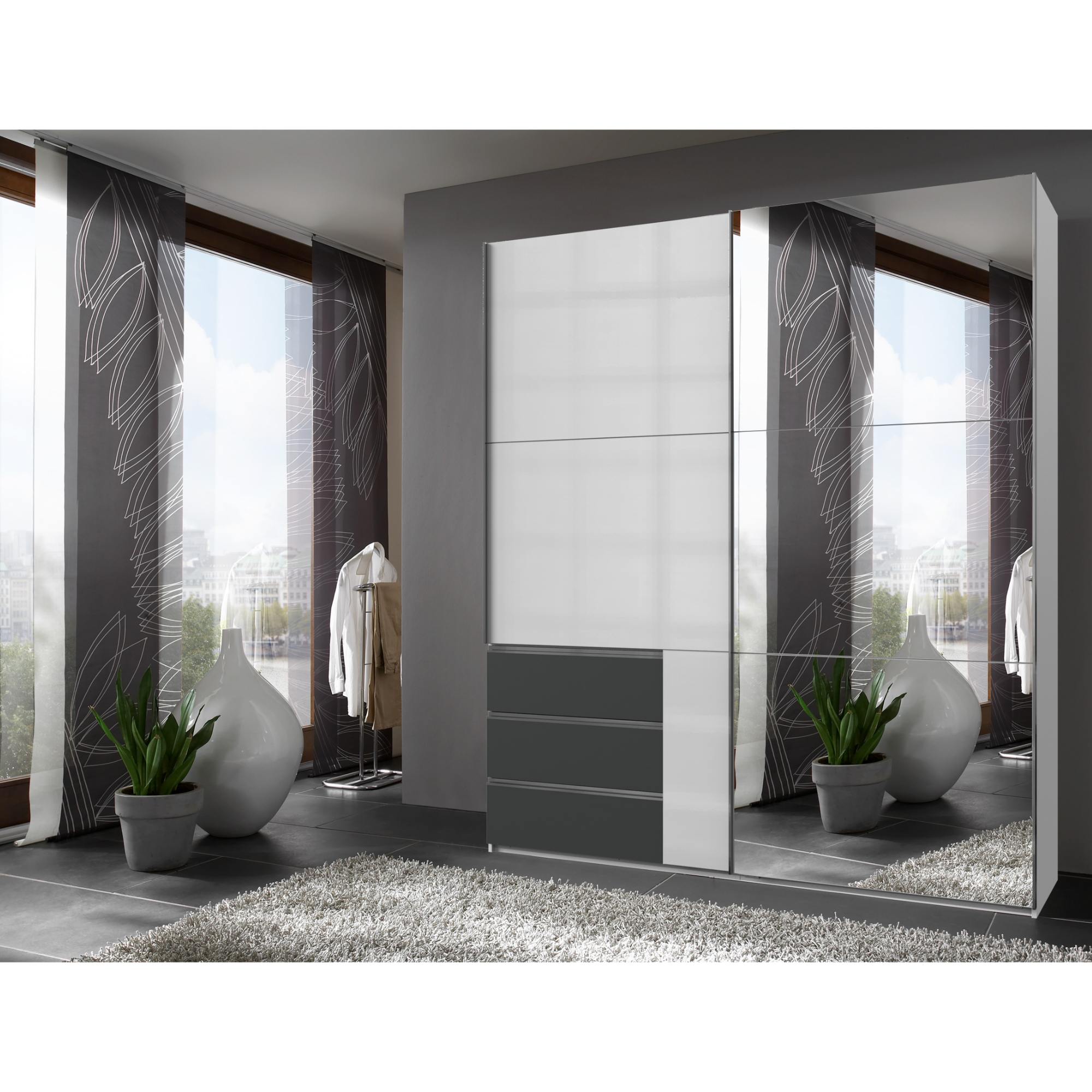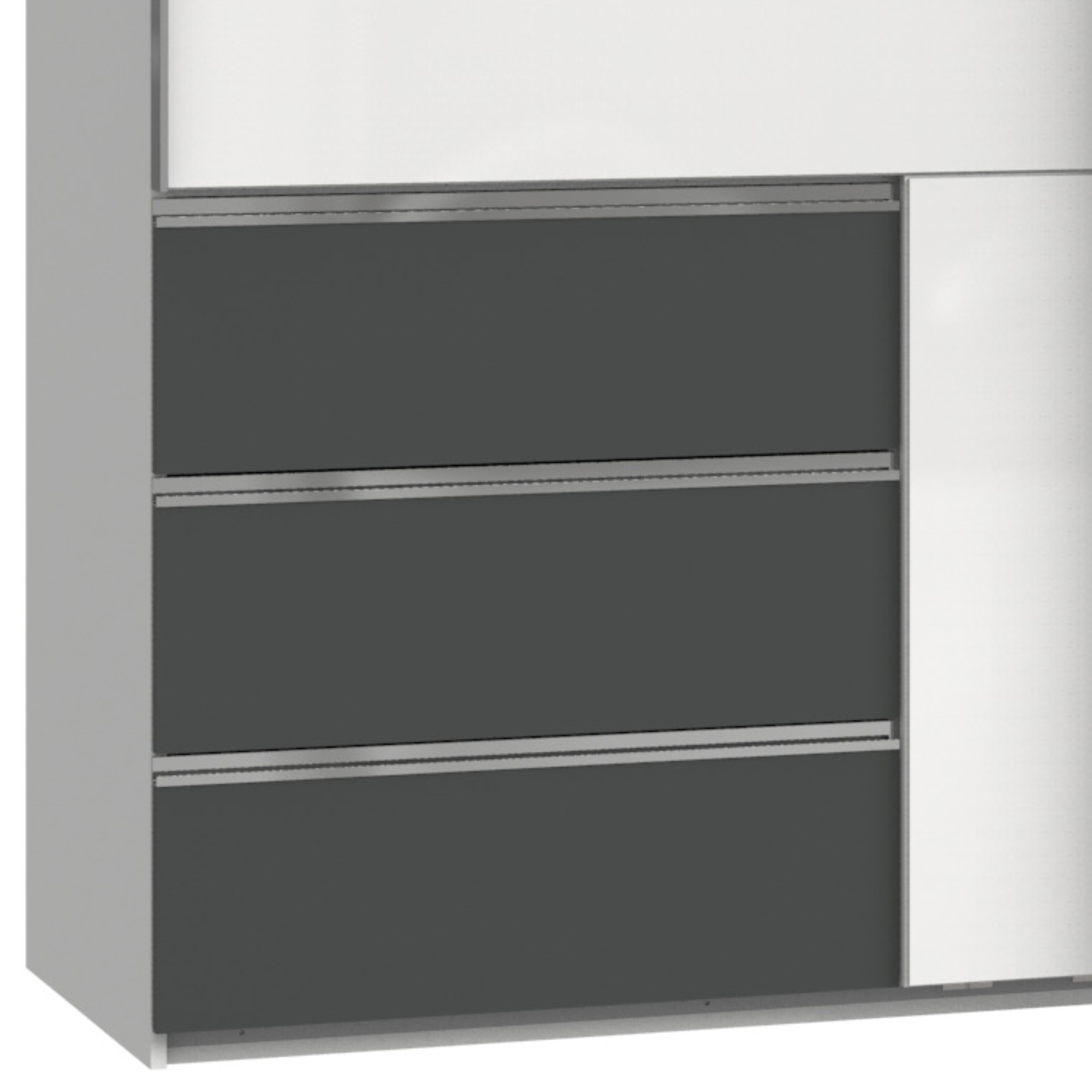 Šatníková skriňa ELIOT pôsobí moderným a zároveň čistým dojmom vďaka atraktívnemu vyhotoveniu konštrukcie v odtieňoch bielej a grafitovej farby. Predné plochy vo vysokom lesku dodávajú skrini na luxuse. Posuvné dvere zaisťujú pohodlnú manipuláciu a umožňujú ľahký prístup k uloženým odevom. Zároveň šetria miesto v interiéri.
