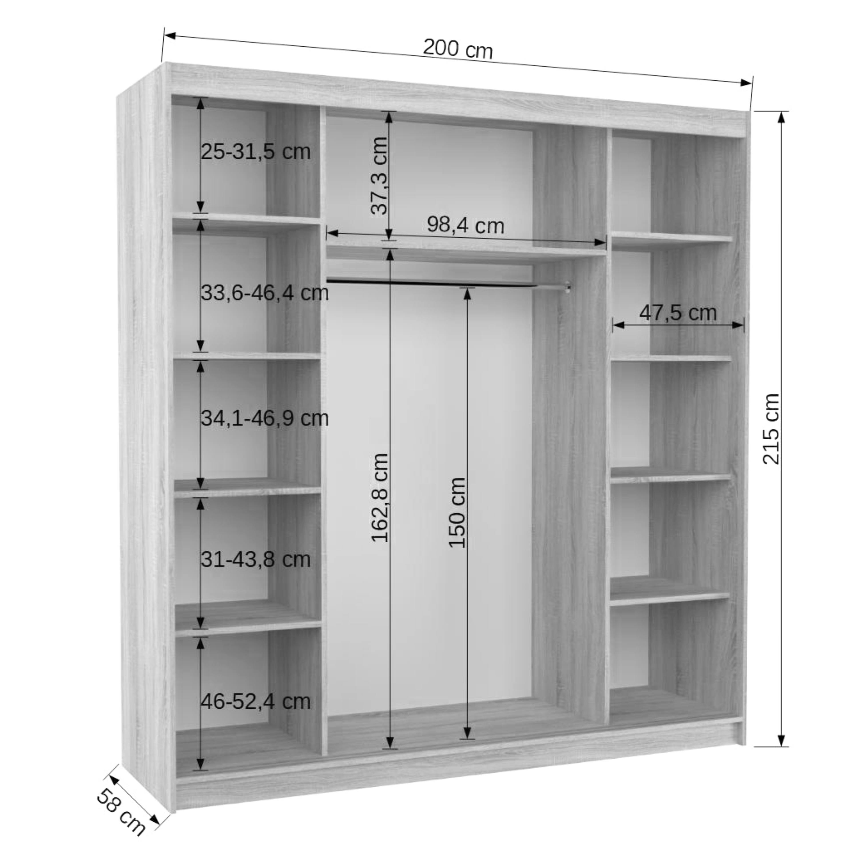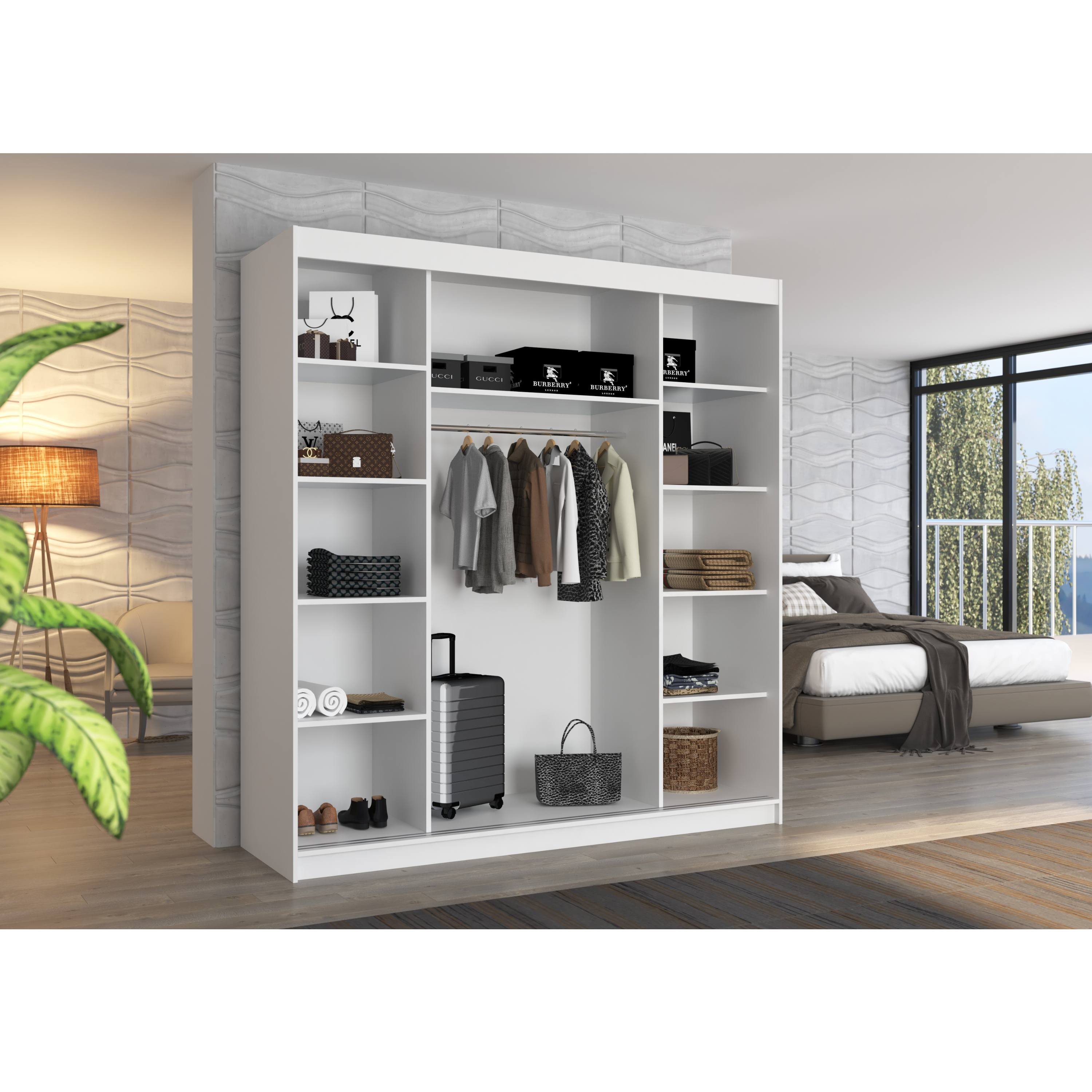 Skriňa je uzatvárateľná praktickými posuvnými dverami, ktoré šetria cenné miesto pred skriňou. Vnútorné vybavenie potom pozostáva zo 4 políc na každej strane na uloženie poskladaného oblečenia, doplnkov alebo úložných boxov, zatiaľ čo stredná časť je vybavená šatníkovou tyčou a širokou policou nad ňou. Skriňa tak ponúka aj miesto na zavesenie kabátov, košieľ alebo šiat a zároveň priestor na skladovanie sezónnych vecí. Konštrukcia skrine je vyrobená z laminovaného dreveného materiálu doplneného o ABS hrany, ktoré chránia pred mechanickým poškodením.