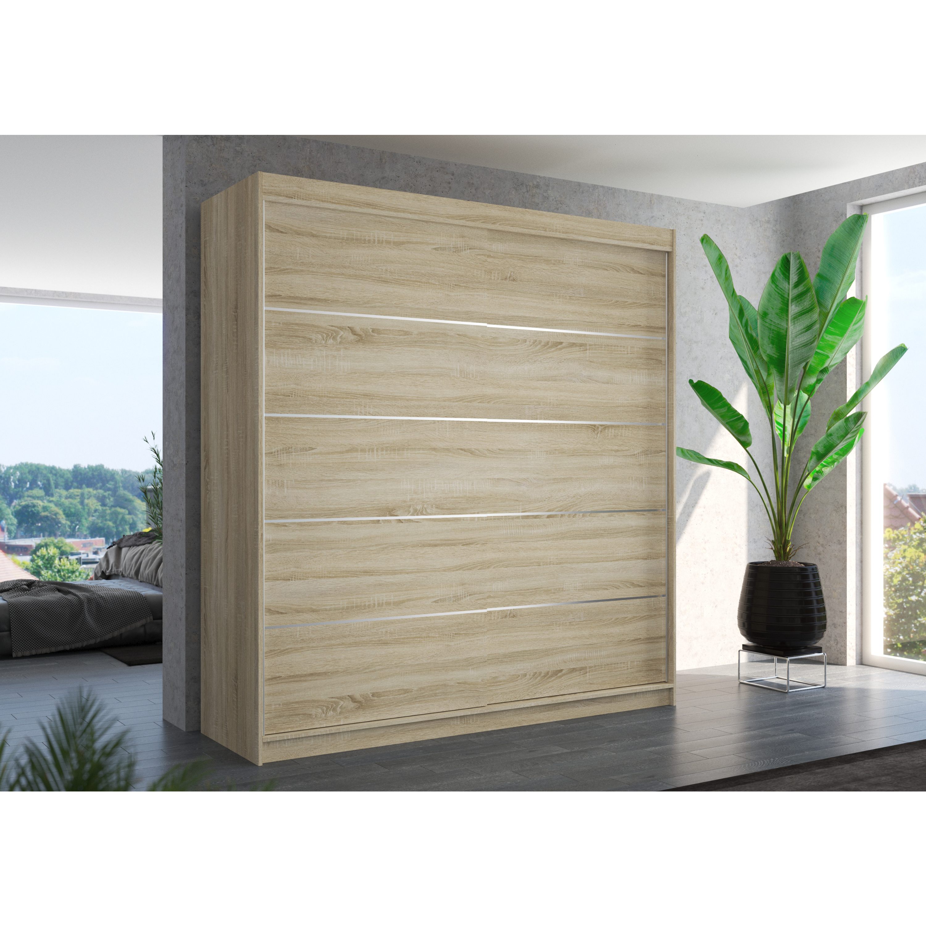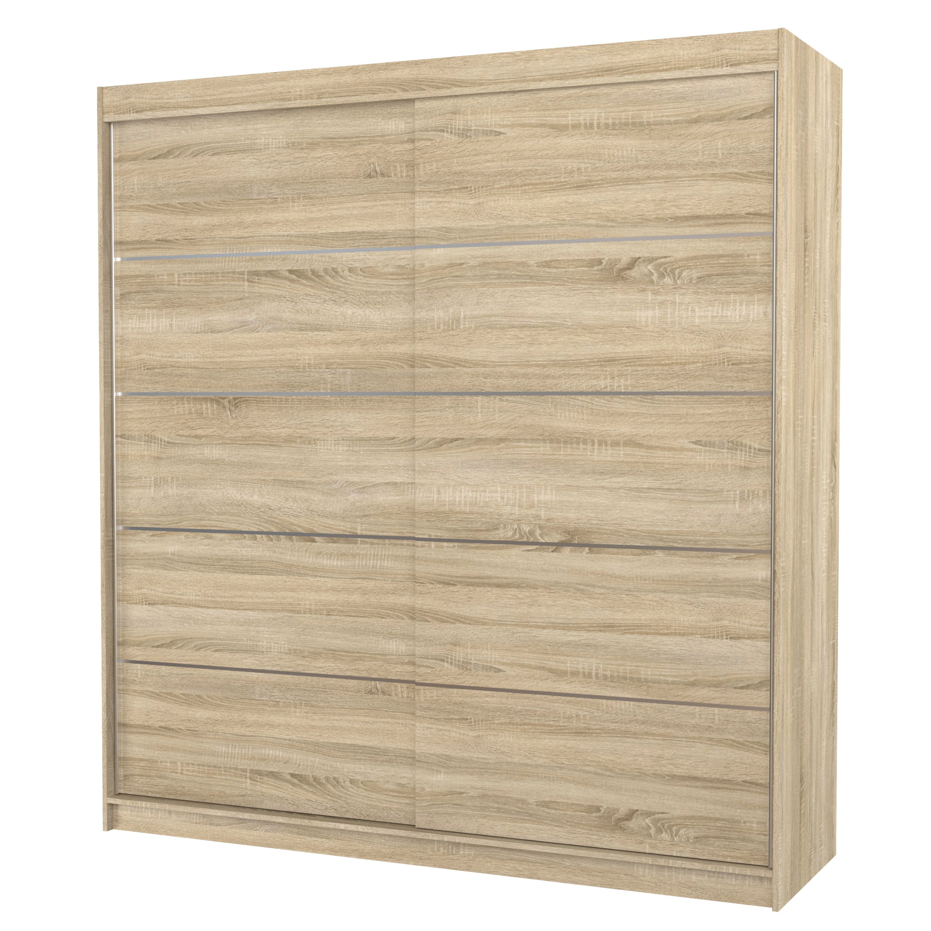 Skriňa je uzatvárateľná praktickými posuvnými dverami, ktoré šetria cenné miesto pred skriňou. Vnútorné vybavenie potom pozostáva zo 4 políc na každej strane na uloženie poskladaného oblečenia, doplnkov alebo úložných boxov, zatiaľ čo stredná časť je vybavená šatníkovou tyčou a širokou policou nad ňou. Skriňa tak ponúka aj miesto na zavesenie kabátov, košieľ alebo šiat a zároveň priestor na skladovanie sezónnych vecí. Konštrukcia skrine je vyrobená z laminovaného dreveného materiálu doplneného o ABS hrany, ktoré chránia pred mechanickým poškodením.