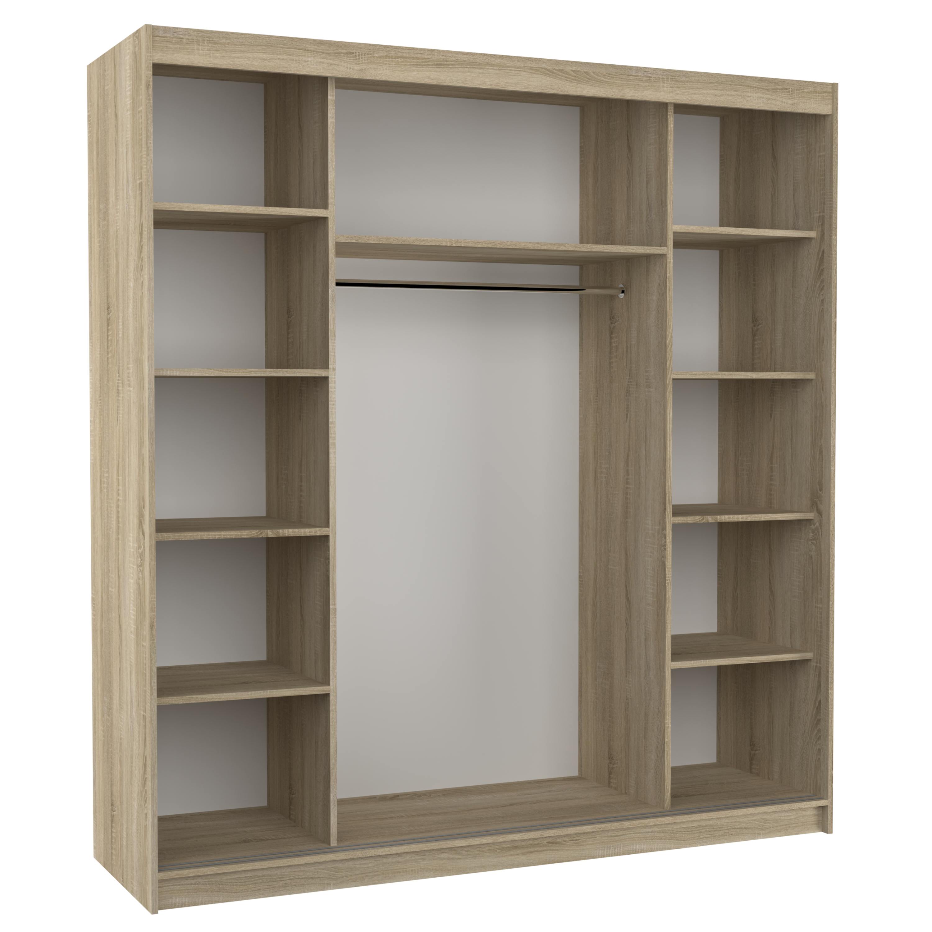 Skriňa je uzatvárateľná praktickými posuvnými dverami, ktoré šetria cenné miesto pred skriňou. Vnútorné vybavenie potom pozostáva zo 4 políc na každej strane na uloženie poskladaného oblečenia, doplnkov alebo úložných boxov, zatiaľ čo stredná časť je vybavená šatníkovou tyčou a širokou policou nad ňou. Skriňa tak ponúka aj miesto na zavesenie kabátov, košieľ alebo šiat a zároveň priestor na skladovanie sezónnych vecí. Konštrukcia skrine je vyrobená z laminovaného dreveného materiálu doplneného o ABS hrany, ktoré chránia pred mechanickým poškodením.