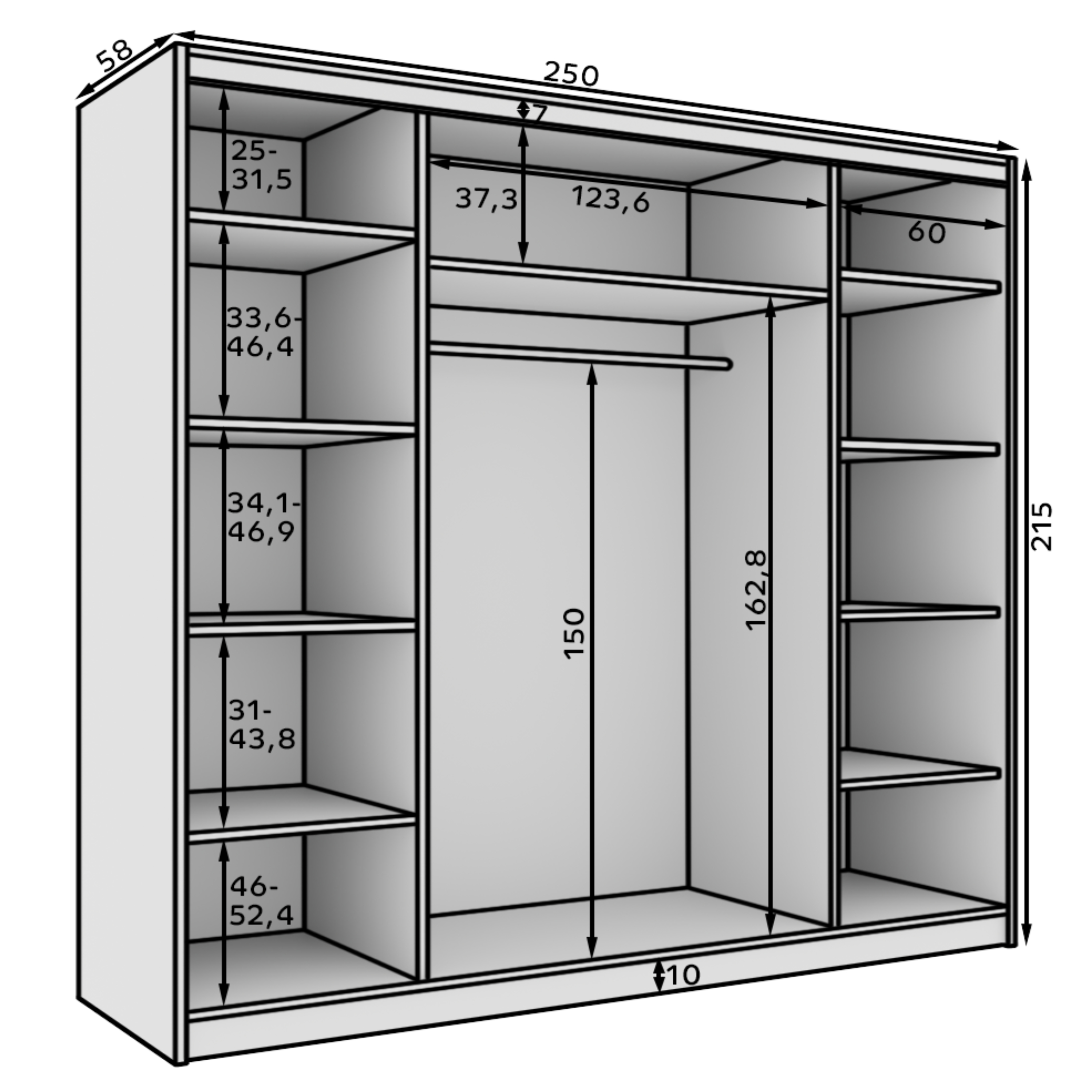 Skriňa je uzatvárateľná praktickými posuvnými dverami, ktoré sa pohybujú po hliníkových koľajniciach zabezpečujúcich plynulý a pohodlný chod dverí. Vnútorné vybavenie potom pozostáva zo 4 políc na každej strane na uloženie zloženého oblečenia, doplnkov alebo úložných boxov, zatiaľ čo priestranná stredová časť je vybavená šatníkovou tyčou a širokou policou nad ňou. Skriňa tak ponúka aj miesto na zavesenie kabátov, košieľ alebo šiat, ako aj priestor na skladovanie sezónnych vecí. Konštrukcia skrine je vyrobená z laminovaného dreveného materiálu doplneného o ABS hrany chrániace pred mechanickým poškodením.