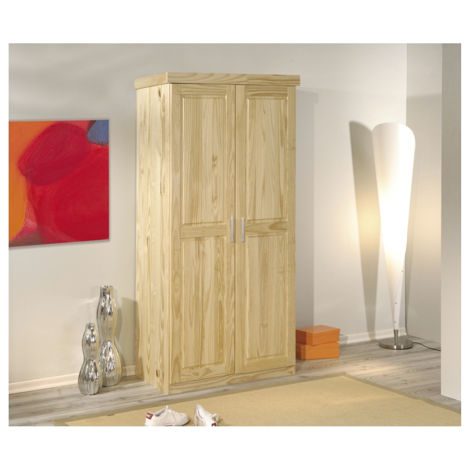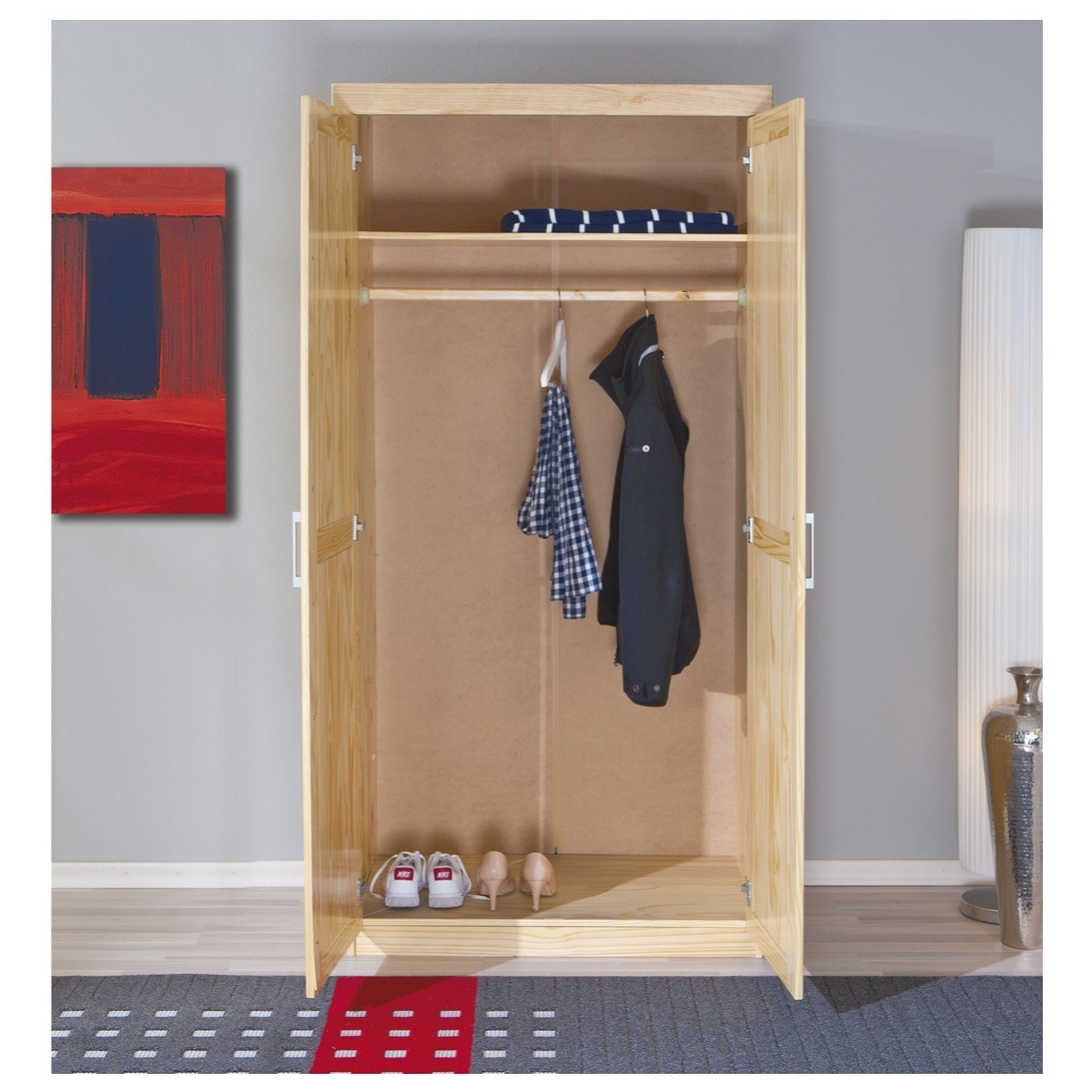 Skriňa má 2 dvere, za ktorými sa nachádza vnútorné vybavenie skrine zložené z 1 vloženej police a 1 šatníkovej tyče. Decentné rúčky uľahčujú otváranie jednotlivých častí skrine. Šatníková skriňa je vyrobená z masívneho borovicového dreva.