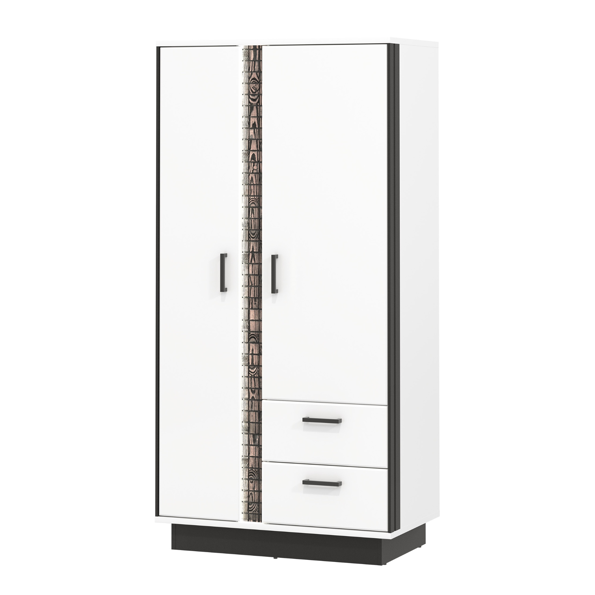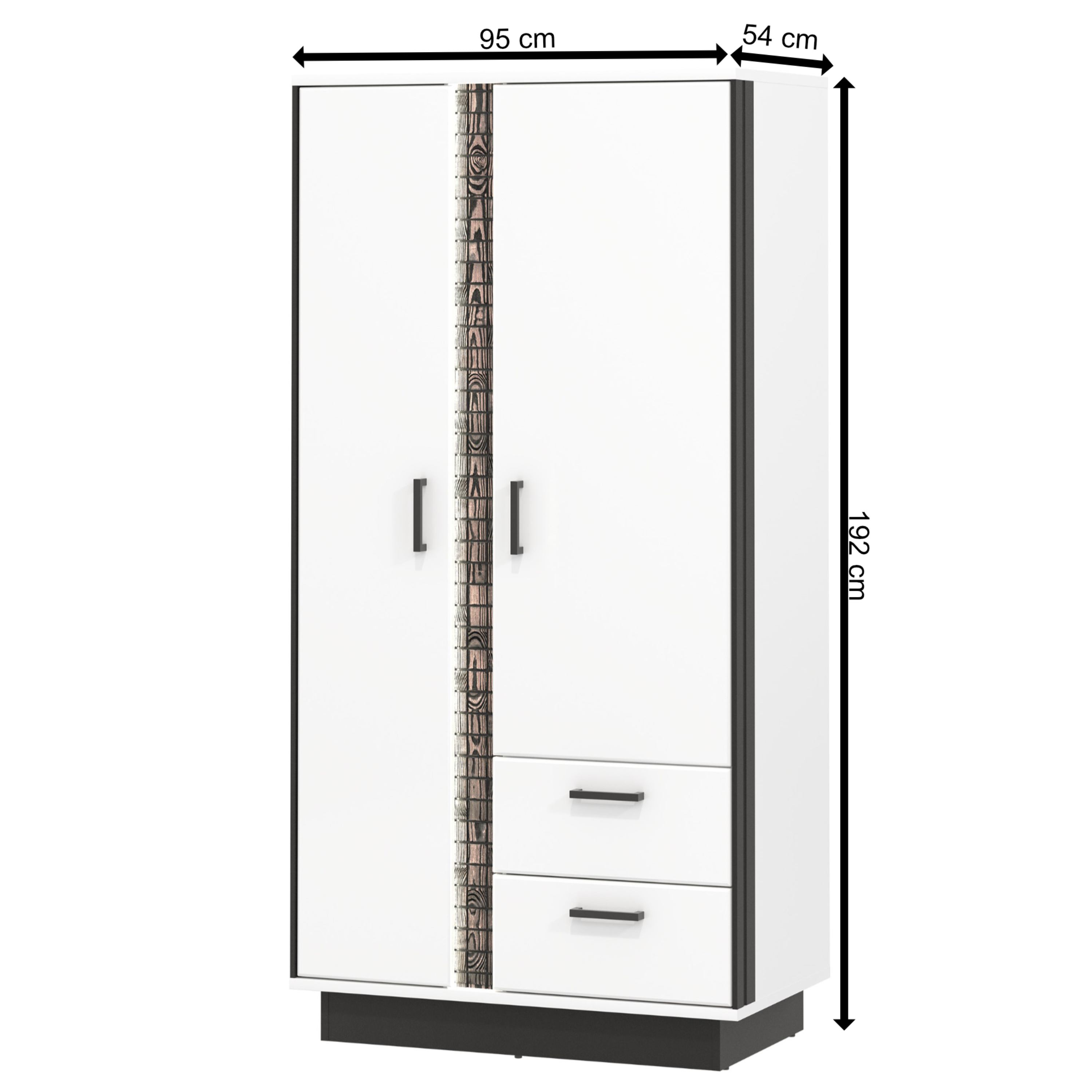 Šatníková skriňa má dvoje dvere, ktoré sa otvárajú do priestoru. Za dverami sa nachádza polica a praktická šatníková tyč. V pravej spodnej časti skrine sa nachádzajú 2 zásuvky. Otváranie uľahčujú plastové rúčky. Skriňa je dodávaná vrátane LED osvetlenia prednej časti. Skriňa je vyrobená z laminovaného dreveného materiálu, ktorý je odolný a nenáročný na údržbu. Dizajn zvýrazňuje dekoratívny deliaci pruh a kontrastné farebné vyhotovenie, v ktorom sa stretáva čierna s bielou.