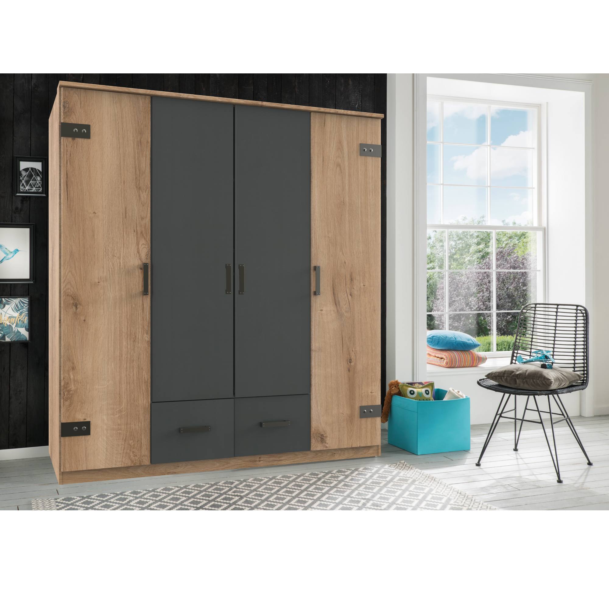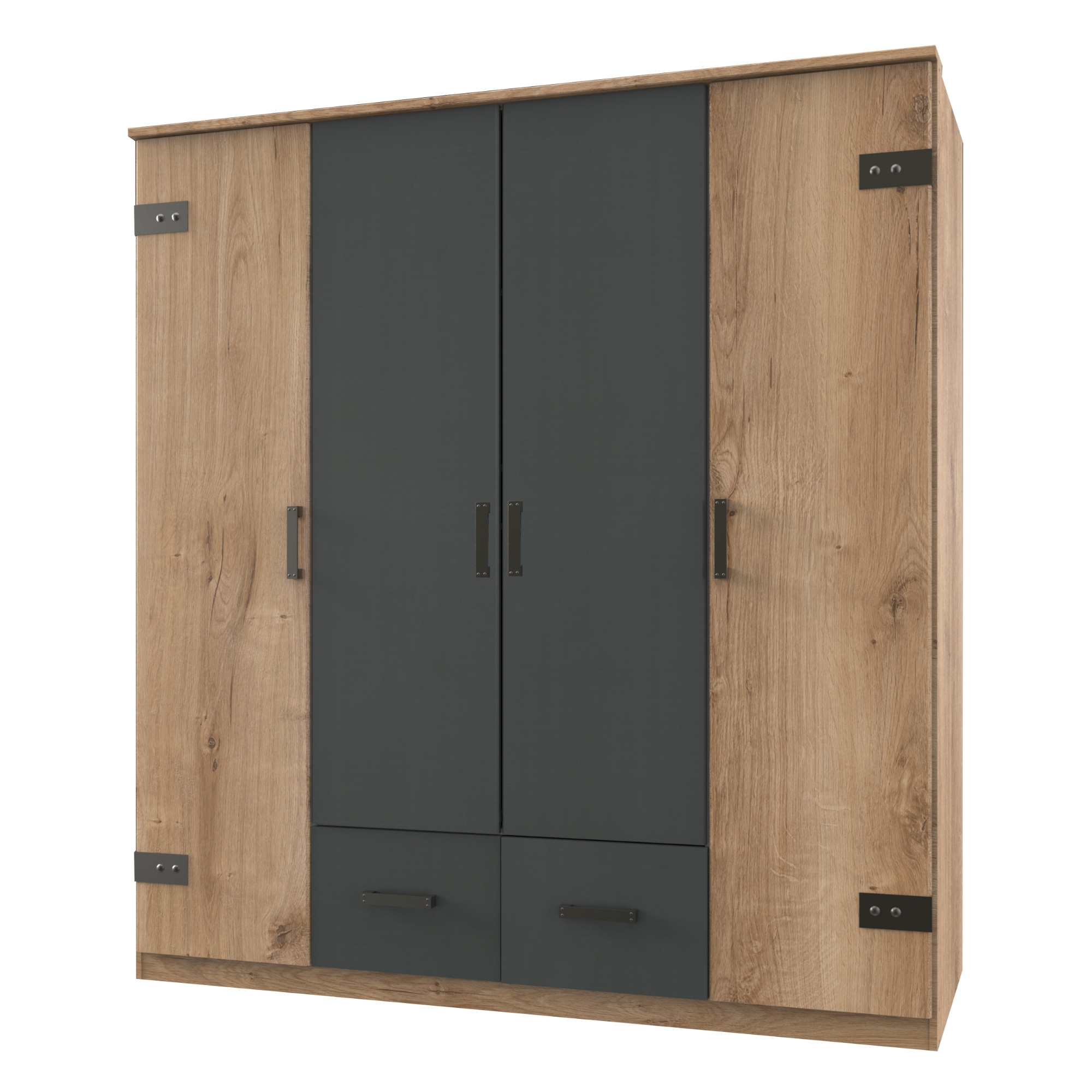 Vybavte si svoju spálňu modernou šatníkovou skriňou GRAYSON 1 v jednoduchom štýle s industriálnymi prvkami. Kontrastné kombinácie chladnejšieho grafitového odtieňa a teplého dekora doskového duba s kovovými elementmi v čiernej farbe vnesie do vašej spálne čaro starých tovární.