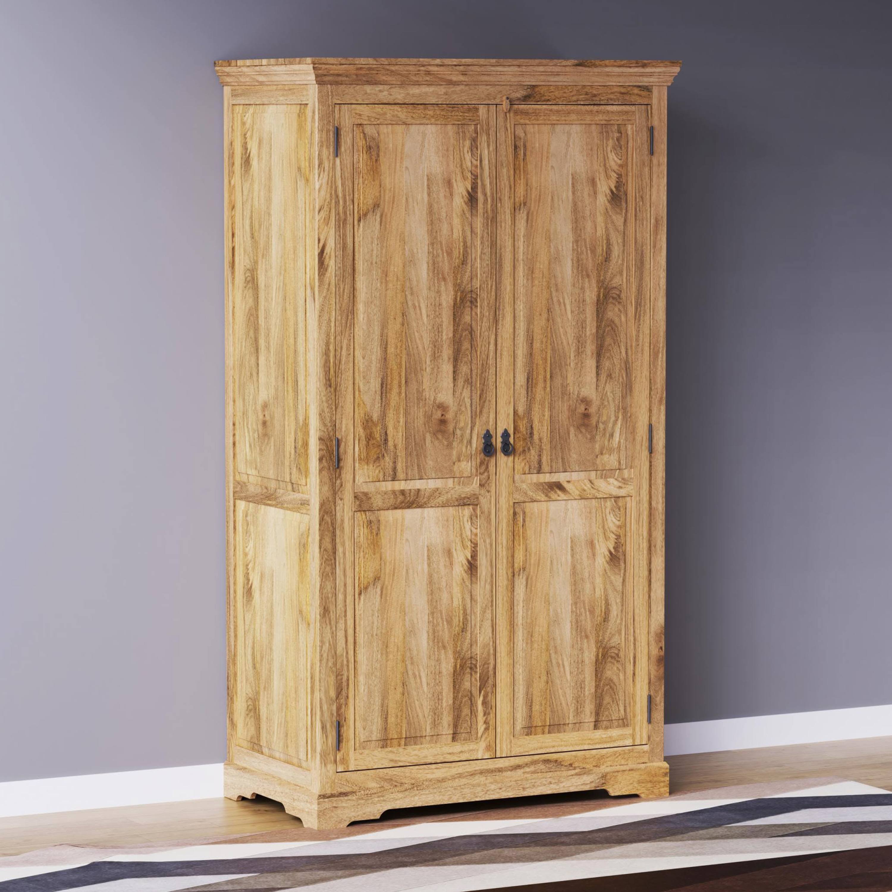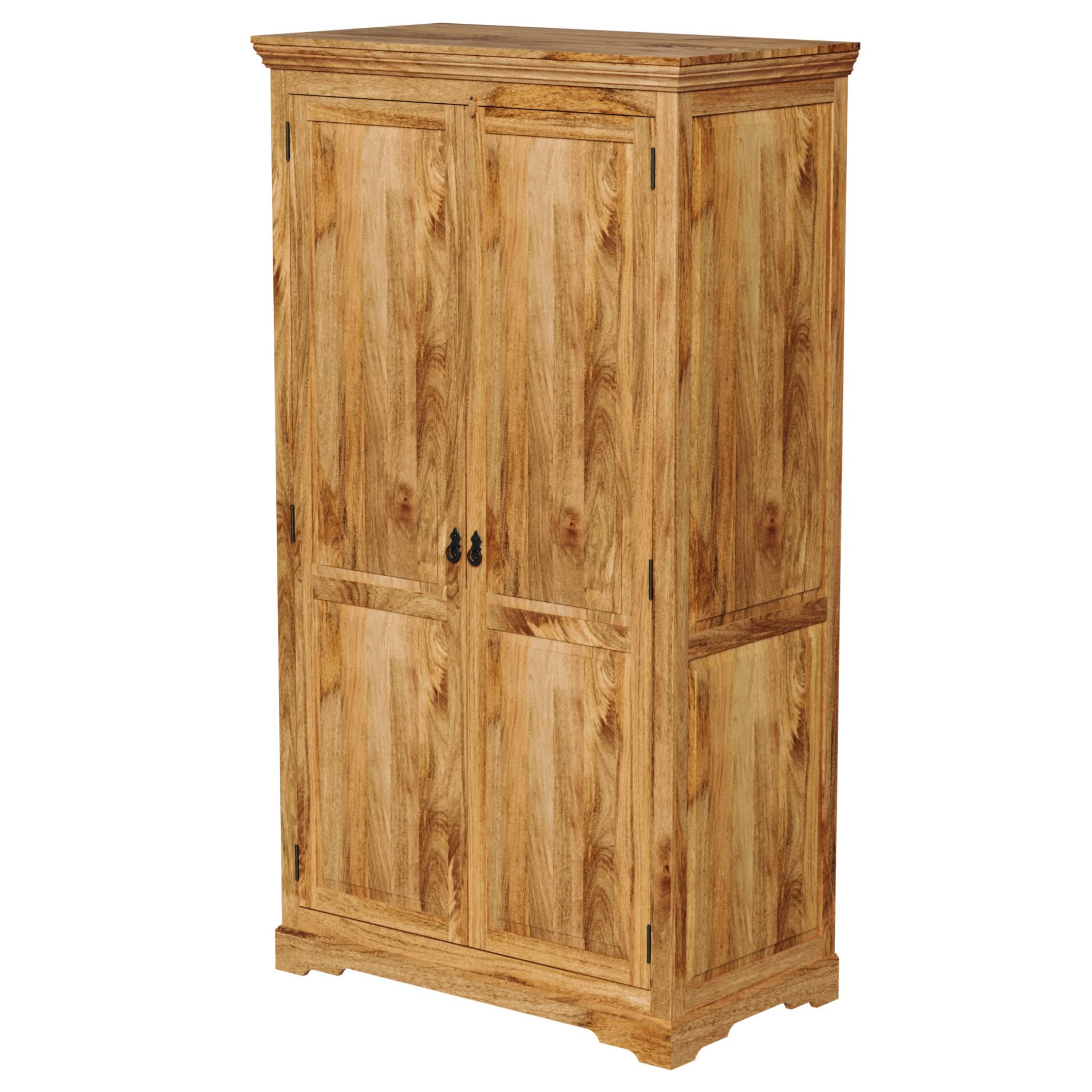 Skriňa disponuje párom otočných dverí, ktoré sú na jednoduchšiu manipuláciu vybavené praktickými, kovovými rúčkami. Vnútorný priestor je vybavený šatníkovou tyčou a vloženou policou. Všetko oblečenie a doplnky tak budú vždy prehľadne usporiadané a budete k nim mať ľahký prístup. Skriňa je vyrobená z masívneho mangového dreva v prírodnom spracovaní bez povrchovej úpravy. Vďaka použitému materiálu je skriňa nielen pevná, ale aj odolná proti vode, udržateľná a má dlhú životnosť. Prirodzená kresba dreva, sfarbenie a priznané nedokonalosti dodávajú na jedinečnosti každého kusa.