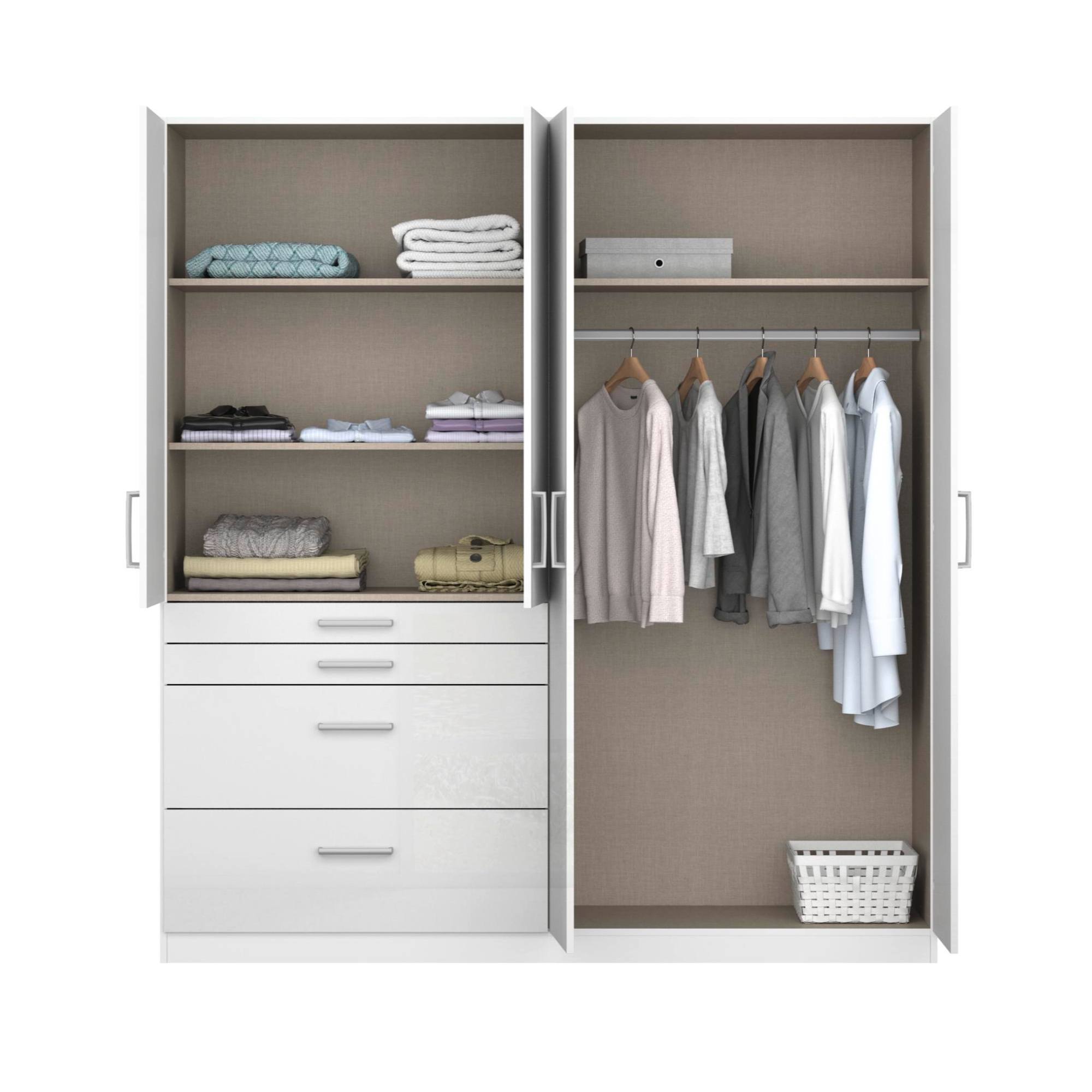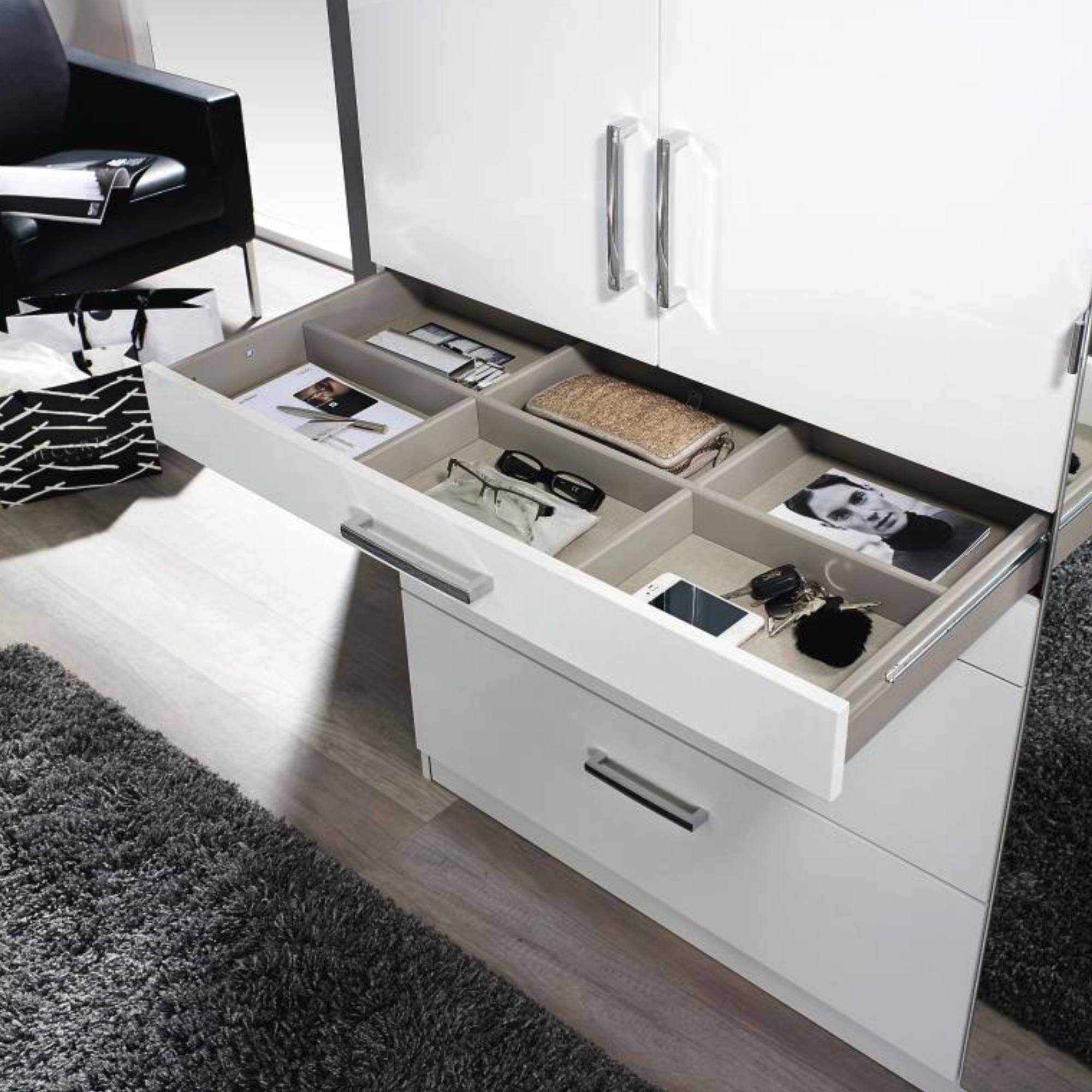 Vnútorné vybavenie sa skladá celkom z 3 vložených políc, jednej šatníkovej tyče a 4 zásuviek rôznych rozmerov. Z toho 2 zásuvky, ktoré zaujmú hneď na pohľad svojim atypickým rozmerom, sú vo vnútri vybavené jednotlivými prehľadnými priehradkami, ktoré zorganizujú nielen vaše šperky, ale aj ďalšie drobnosti. Zásuvky s guľôčkovými pojazdmi a kovovými vodiacimi koľajničkami zaisťujú tichý chod. Povrch zaručuje ľahkú údržbu a dlhú životnosť. Pre ľahké otváranie skrine slúžia rúčky jednoduchého nenápadného tvaru.