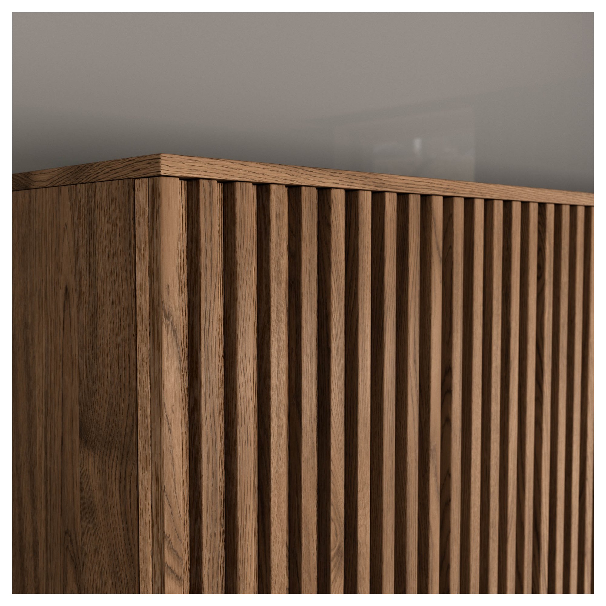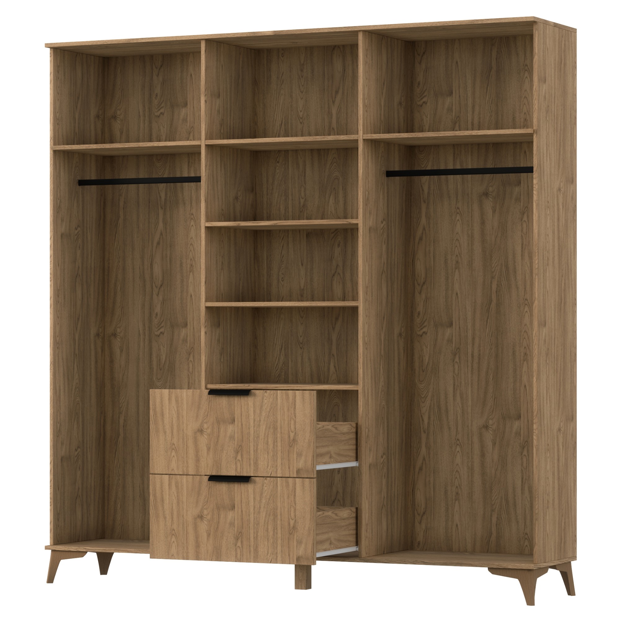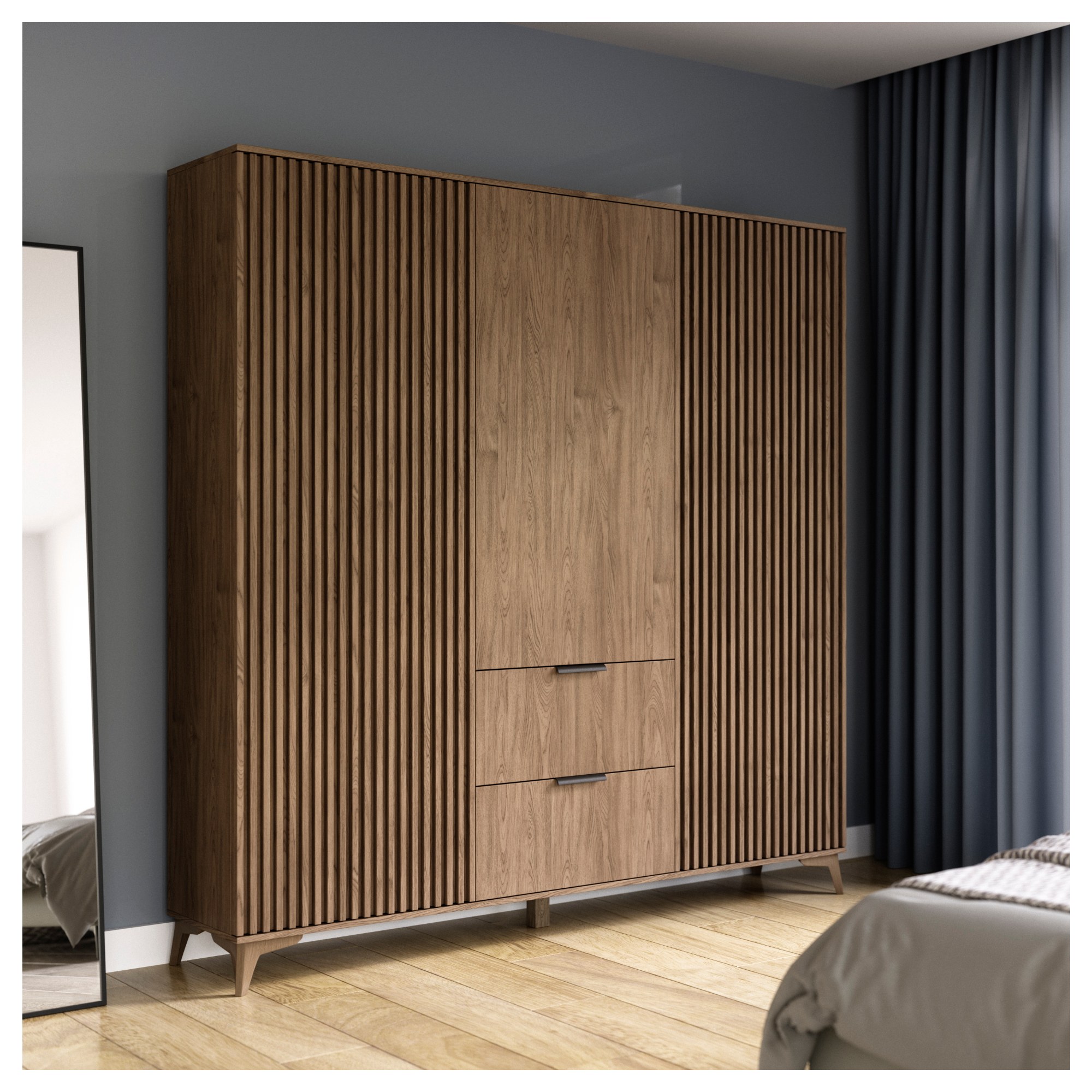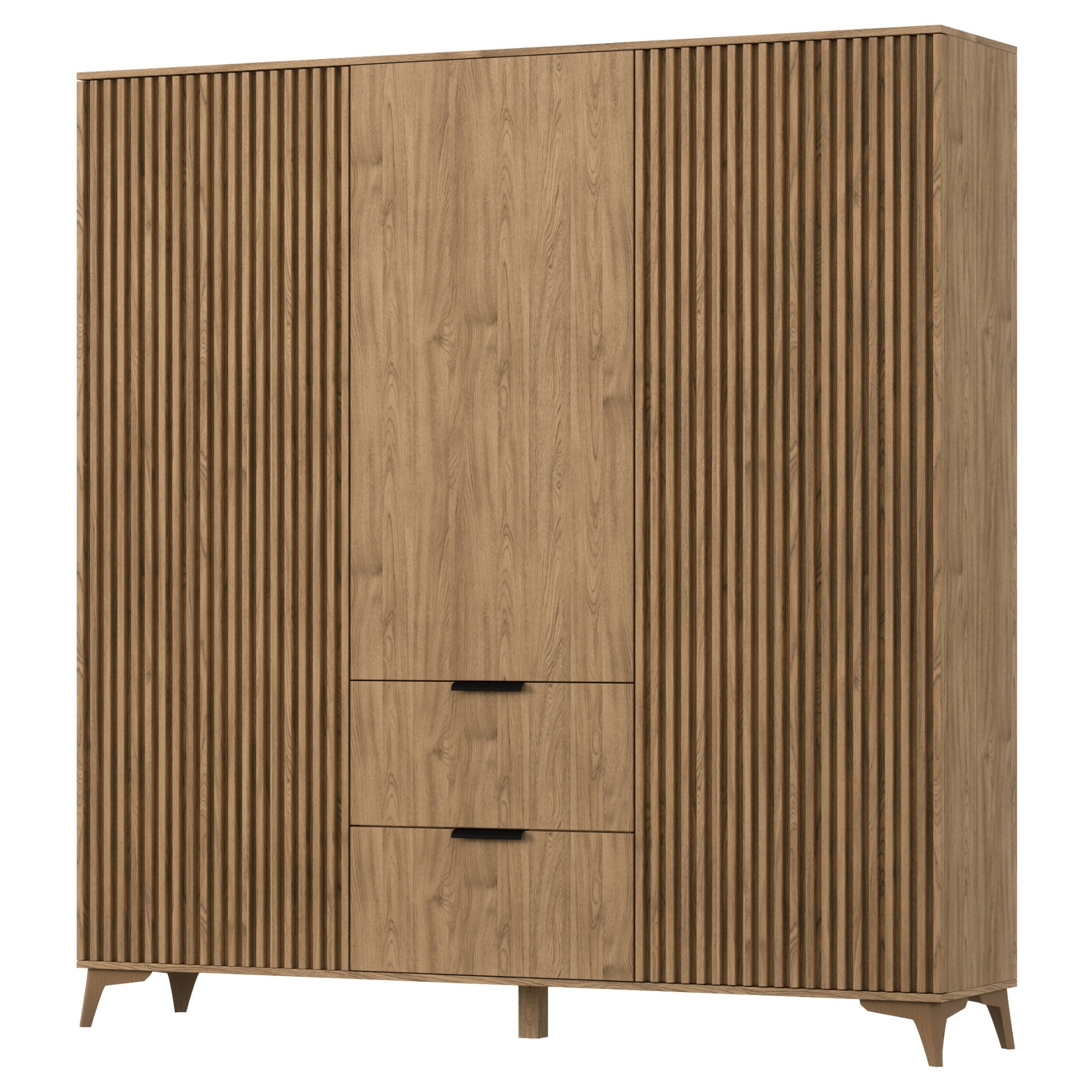 Skriňa je uzatvárateľná pomocou 3 otočných dverí, ktoré umožňujú maximálne využitie vnútorného priestoru. Za každými z frézovaných dverí sa nachádza šatníková tyč na prehľadné zavesenie odevov a priestranná vložená polica nad ňou. Prostredné dvere za sebou ukrývajú 3 vložené police na uloženie poskladaného oblečenia, lôžkovín a ďalšieho textilu. Na uskladnenie doplnkov a iných drobností môžete využiť aj 2 hlboké zásuvky ktorých používanie uľahčujú plastové rúčky. Celkový vzhľad zvýrazňujú elegantné nohy.